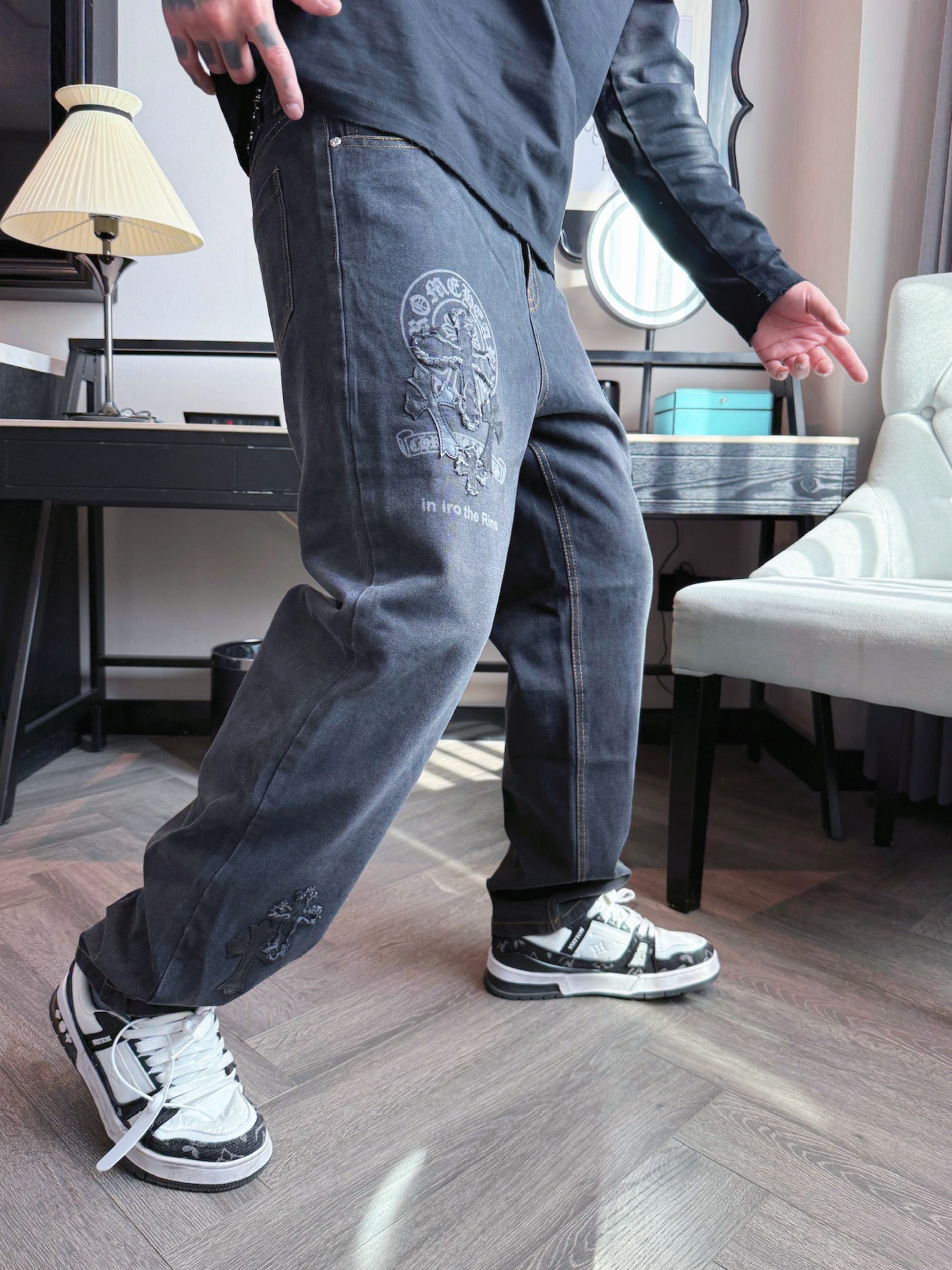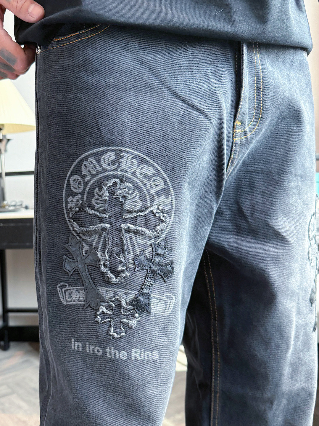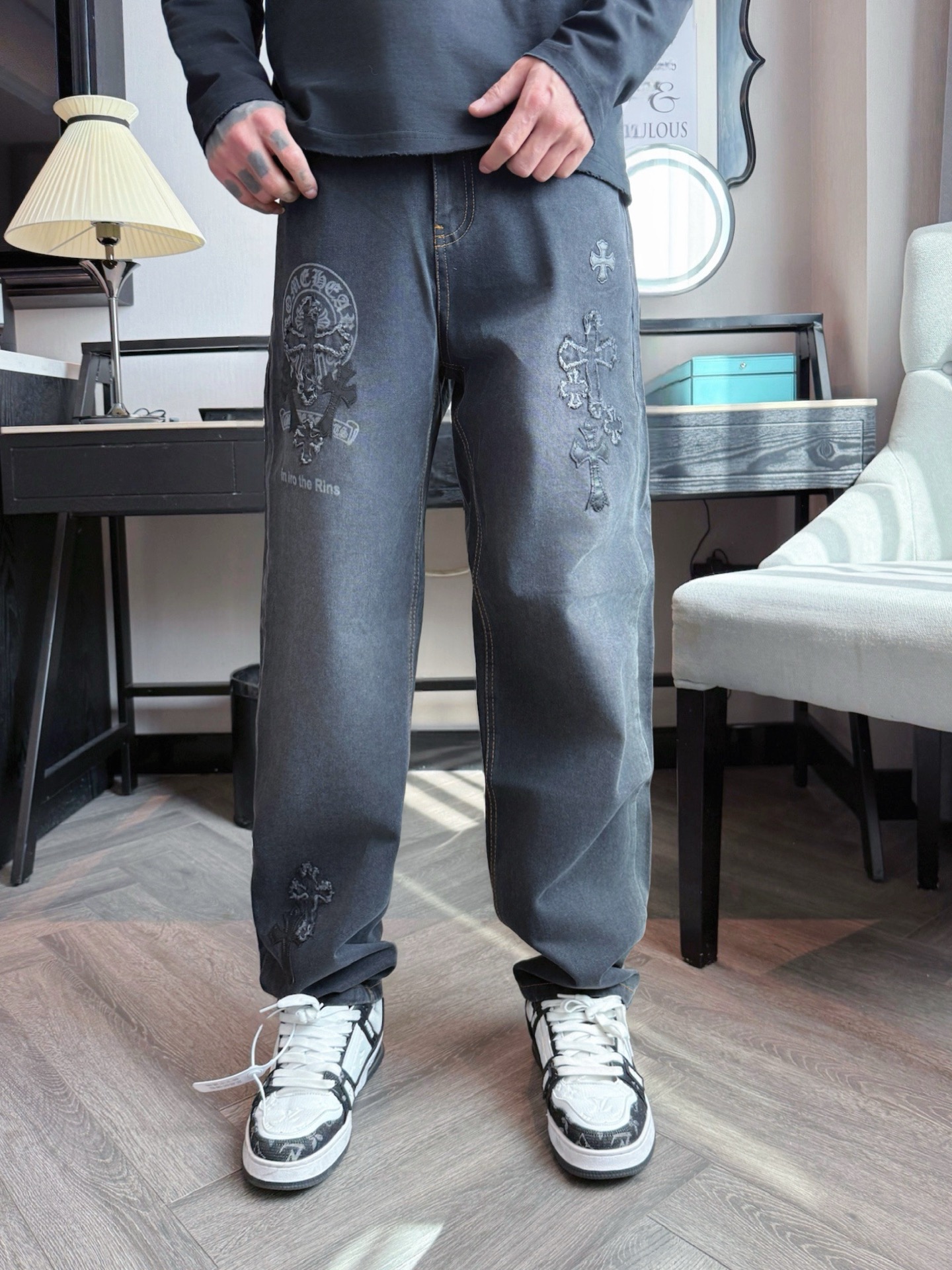 这款衣服是AAAAA 1:1 质量 (非常棒). 使用了和原版一模一样的材料. 商标部分也保持了和克罗心/Chrome Hearts一样. 图片拍摄是实物衣服拍摄, 您所收到的实物保证和我们图片一模一样.