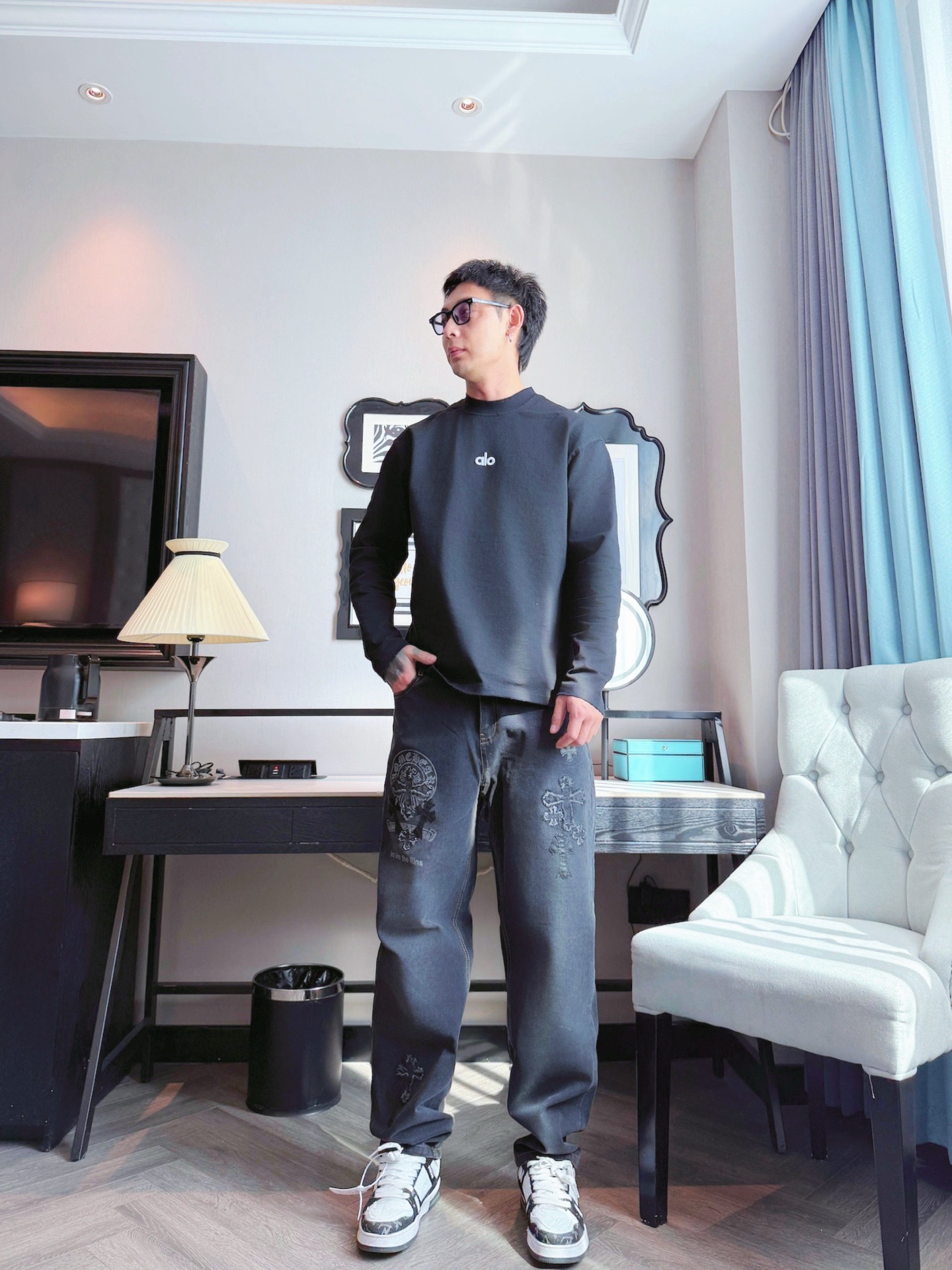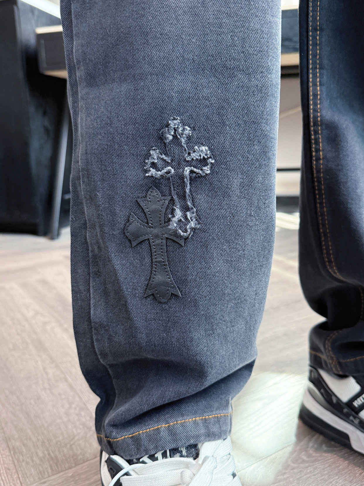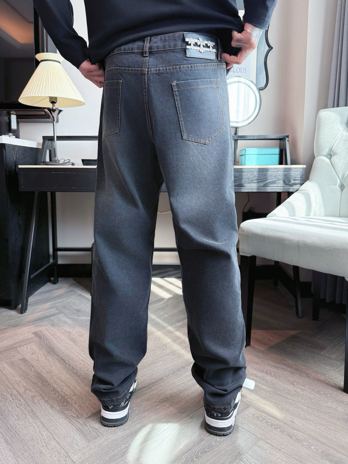 这款衣服是AAAAA 1:1 质量 (非常棒). 使用了和原版一模一样的材料. 商标部分也保持了和克罗心/Chrome Hearts一样. 图片拍摄是实物衣服拍摄, 您所收到的实物保证和我们图片一模一样.