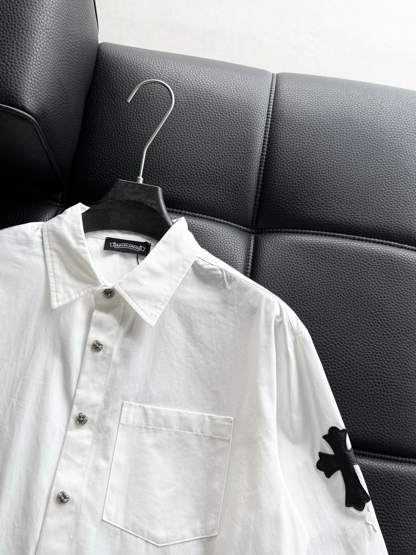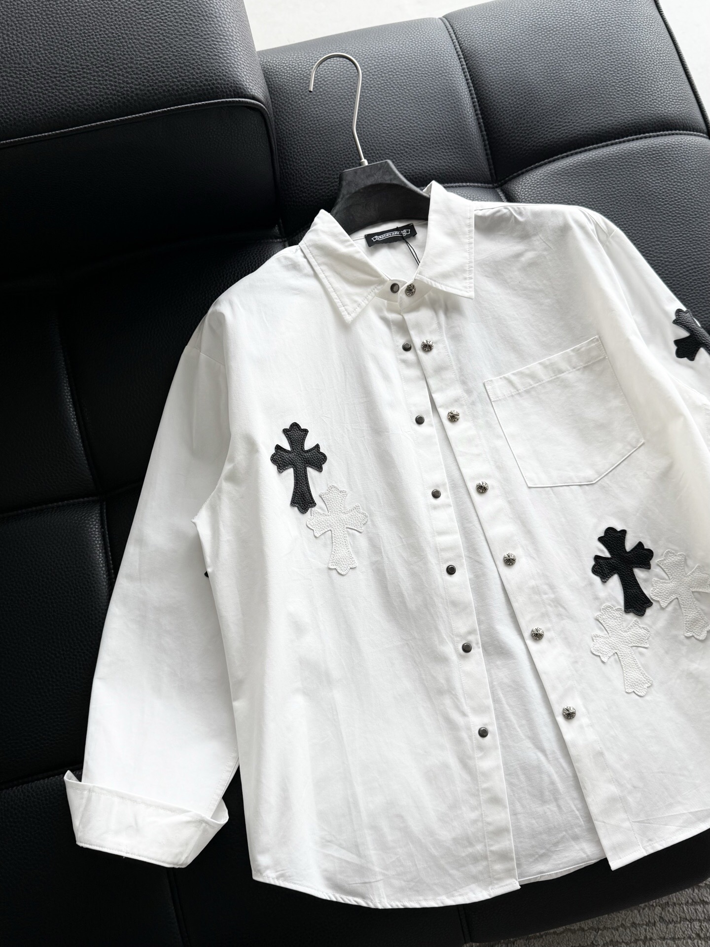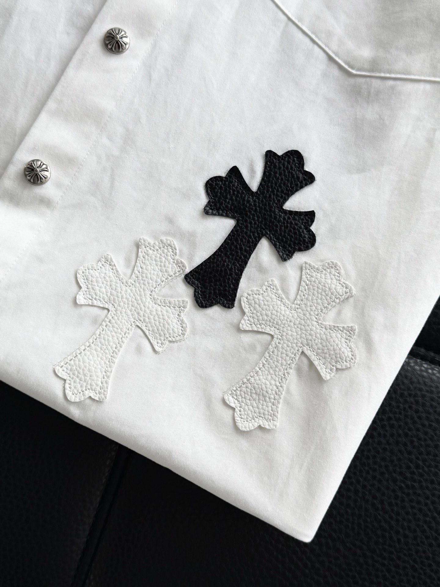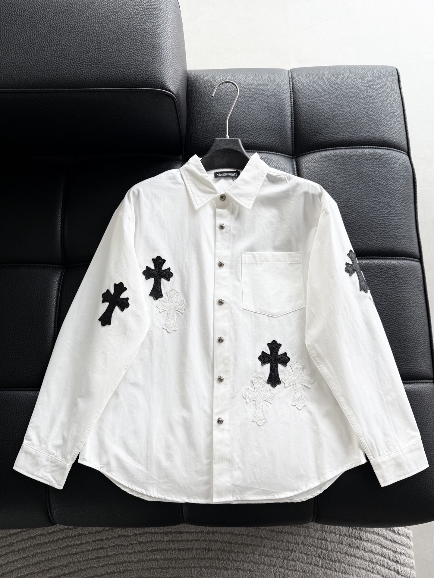 这款衣服是AAAAA 1:1 质量 (非常棒). 使用了和原版一模一样的材料. 商标部分也保持了和克罗心/Chrome Hearts一样. 图片拍摄是实物衣服拍摄, 您所收到的实物保证和我们图片一模一样.