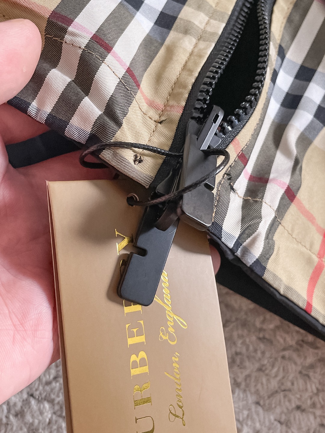 这款衣服是AAAAA 1:1 质量 (非常棒). 使用了和原版一模一样的材料. 商标部分也保持了和巴宝莉/Burberry一样. 图片拍摄是实物衣服拍摄, 您所收到的实物保证和我们图片一模一样.
