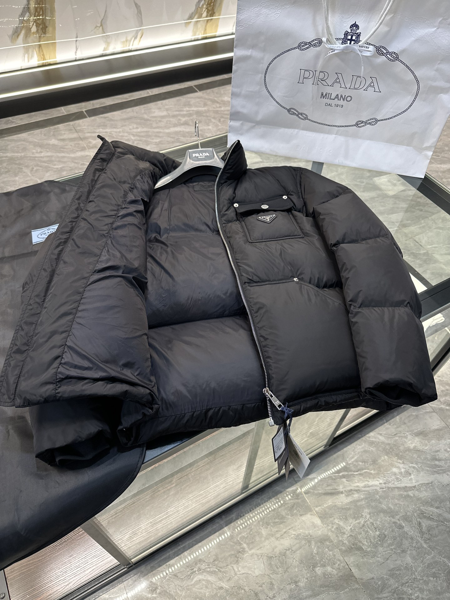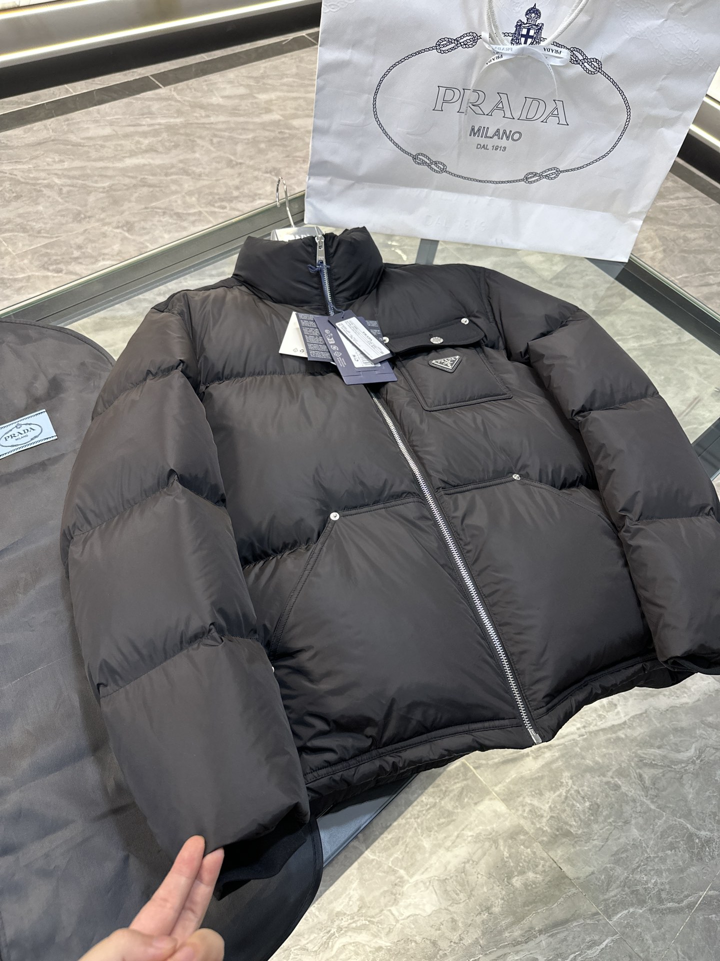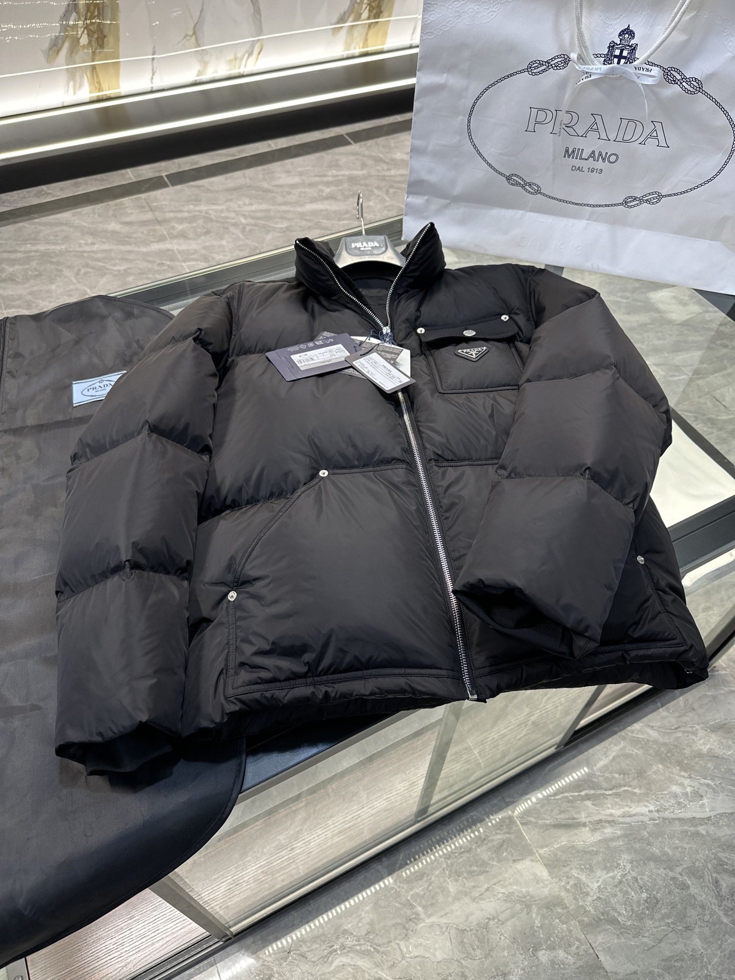 这款衣服是AAAAA 1:1 质量 (非常棒). 使用了和原版一模一样的材料. 商标部分也保持了和普拉达/Prada一样. 图片拍摄是实物衣服拍摄, 您所收到的实物保证和我们图片一模一样.