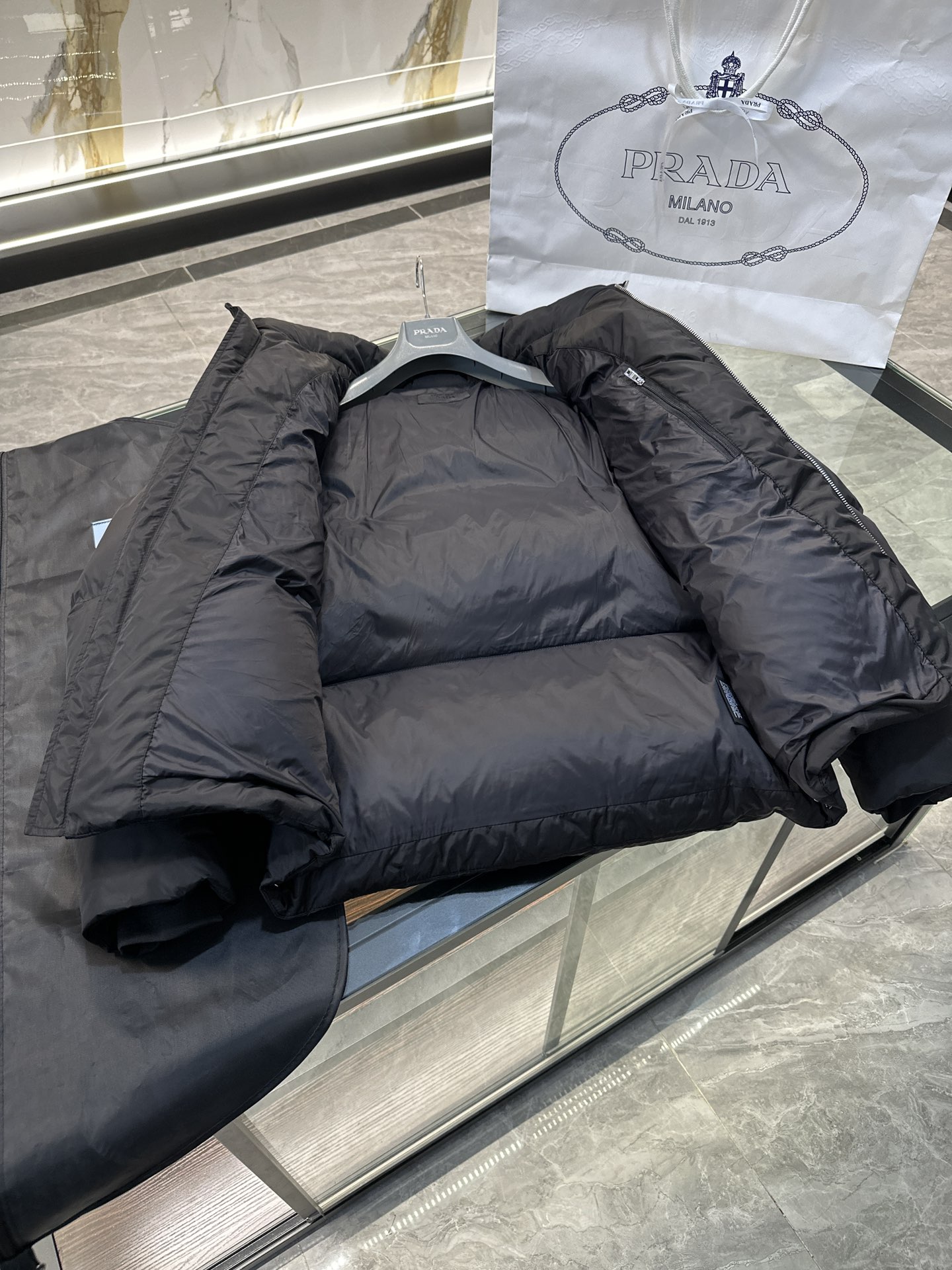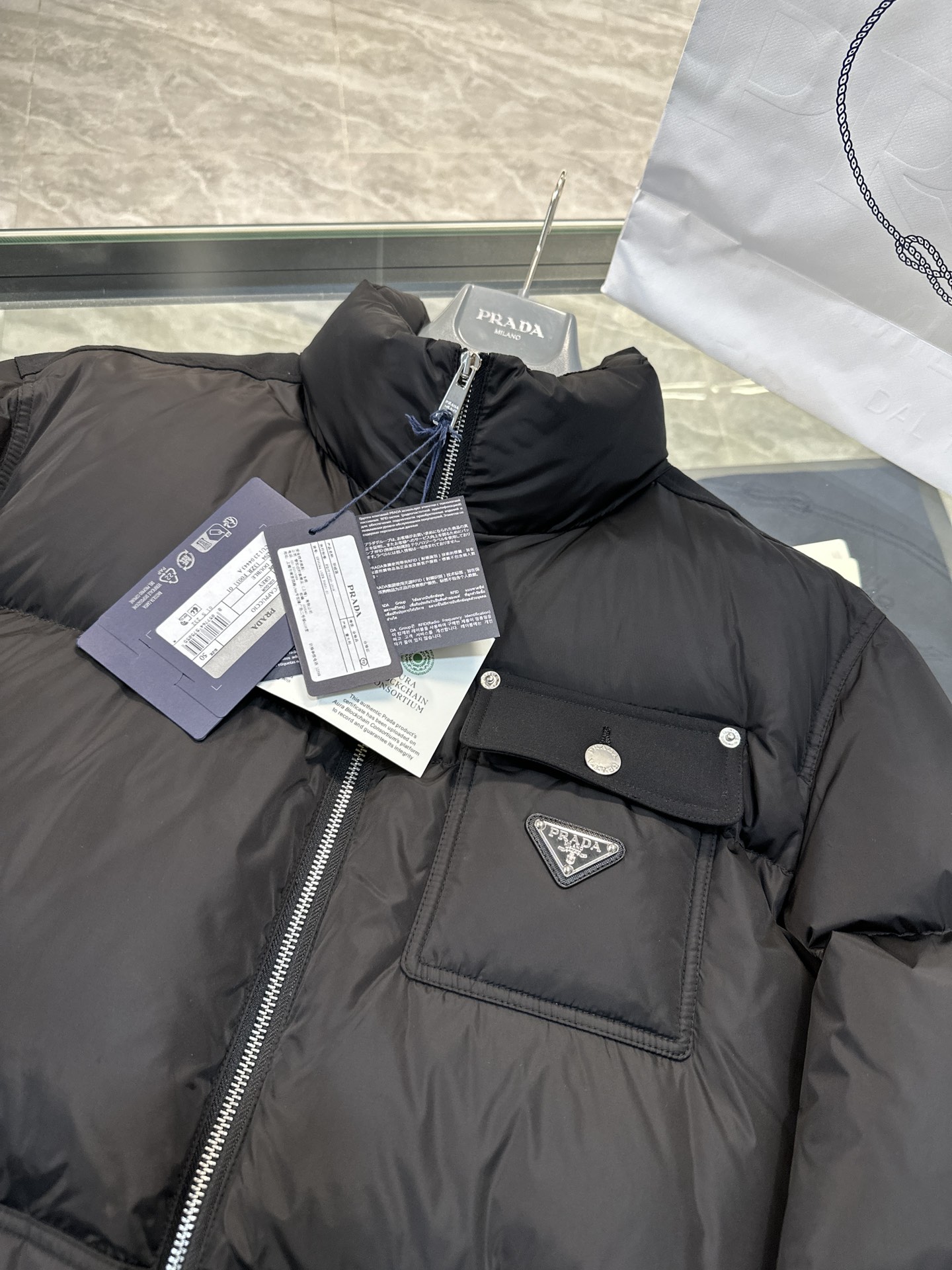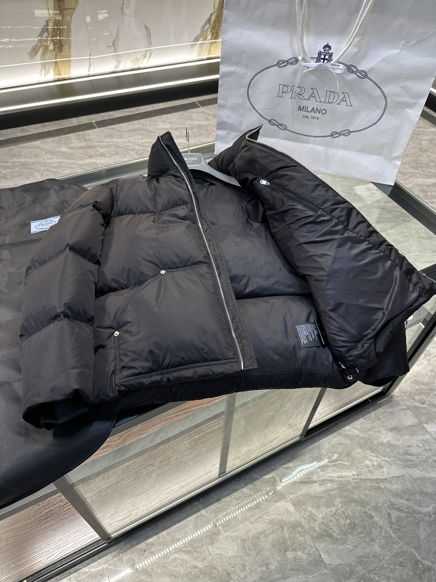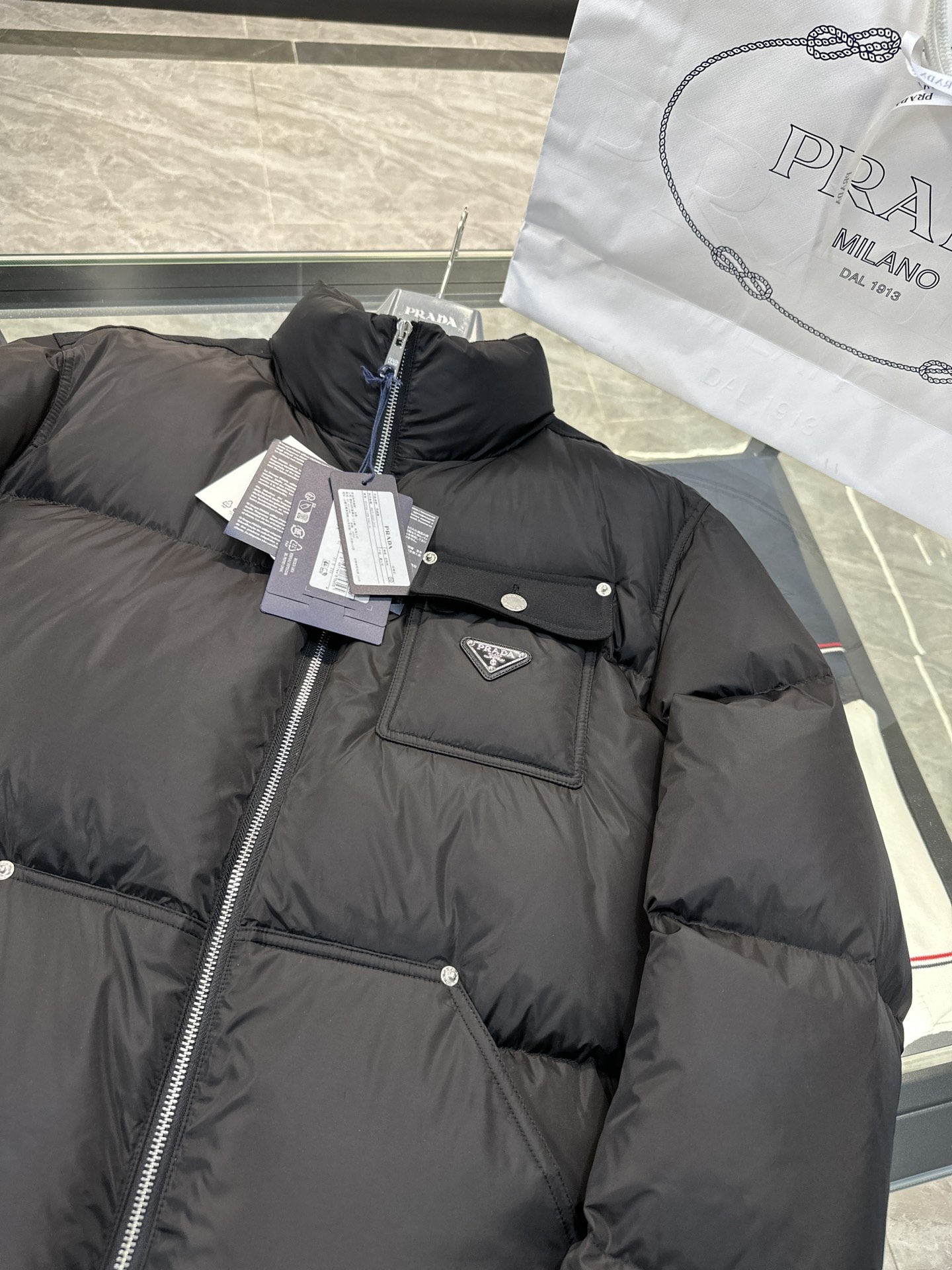 这款衣服是AAAAA 1:1 质量 (非常棒). 使用了和原版一模一样的材料. 商标部分也保持了和普拉达/Prada一样. 图片拍摄是实物衣服拍摄, 您所收到的实物保证和我们图片一模一样.