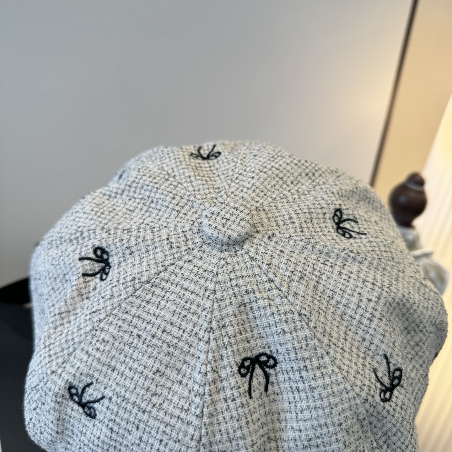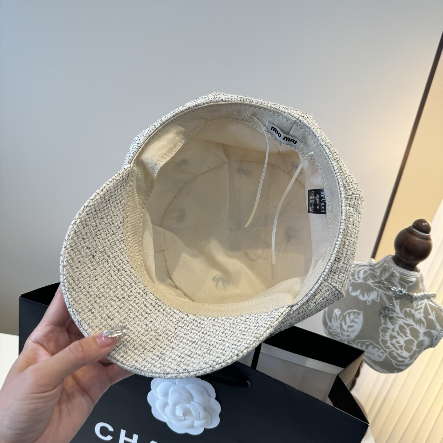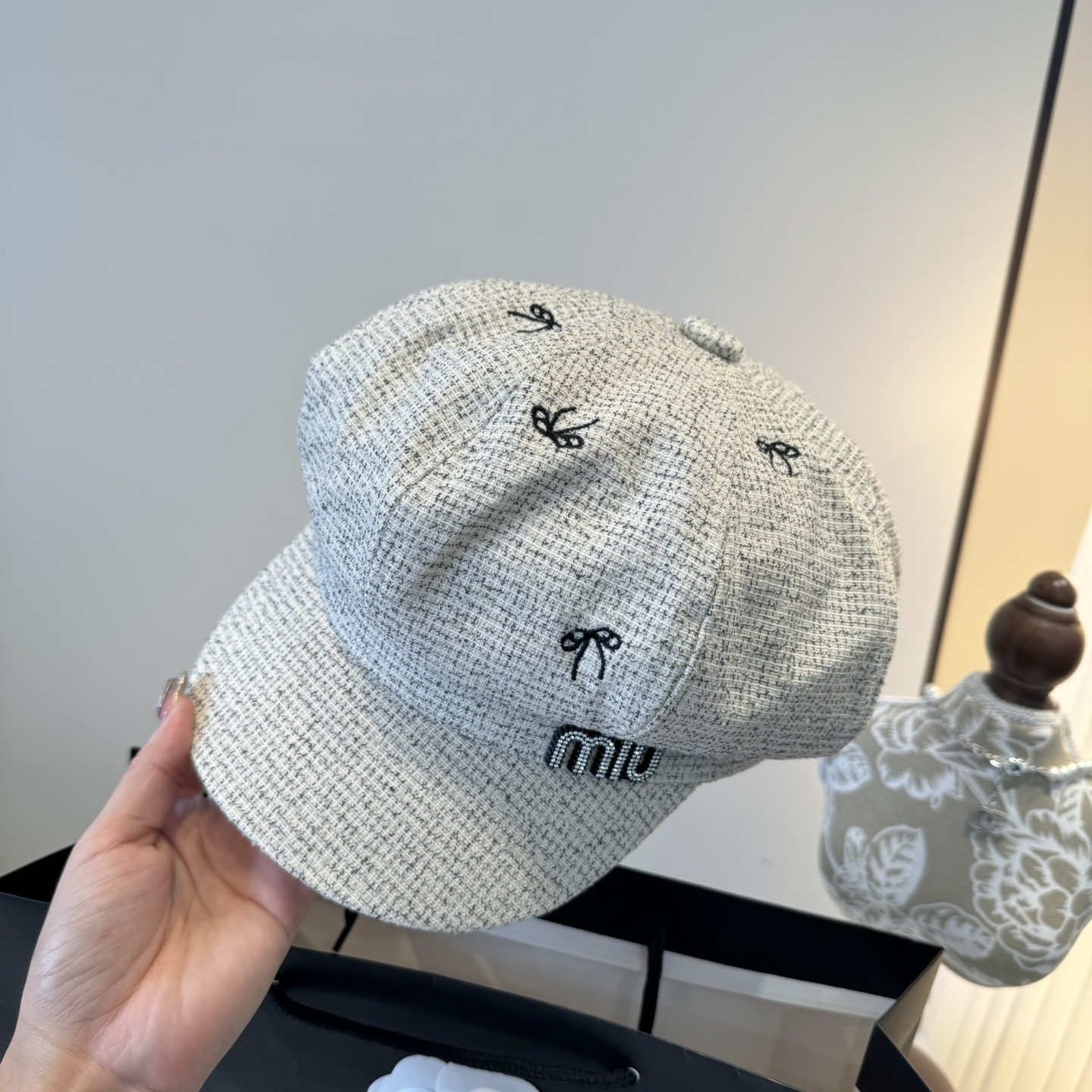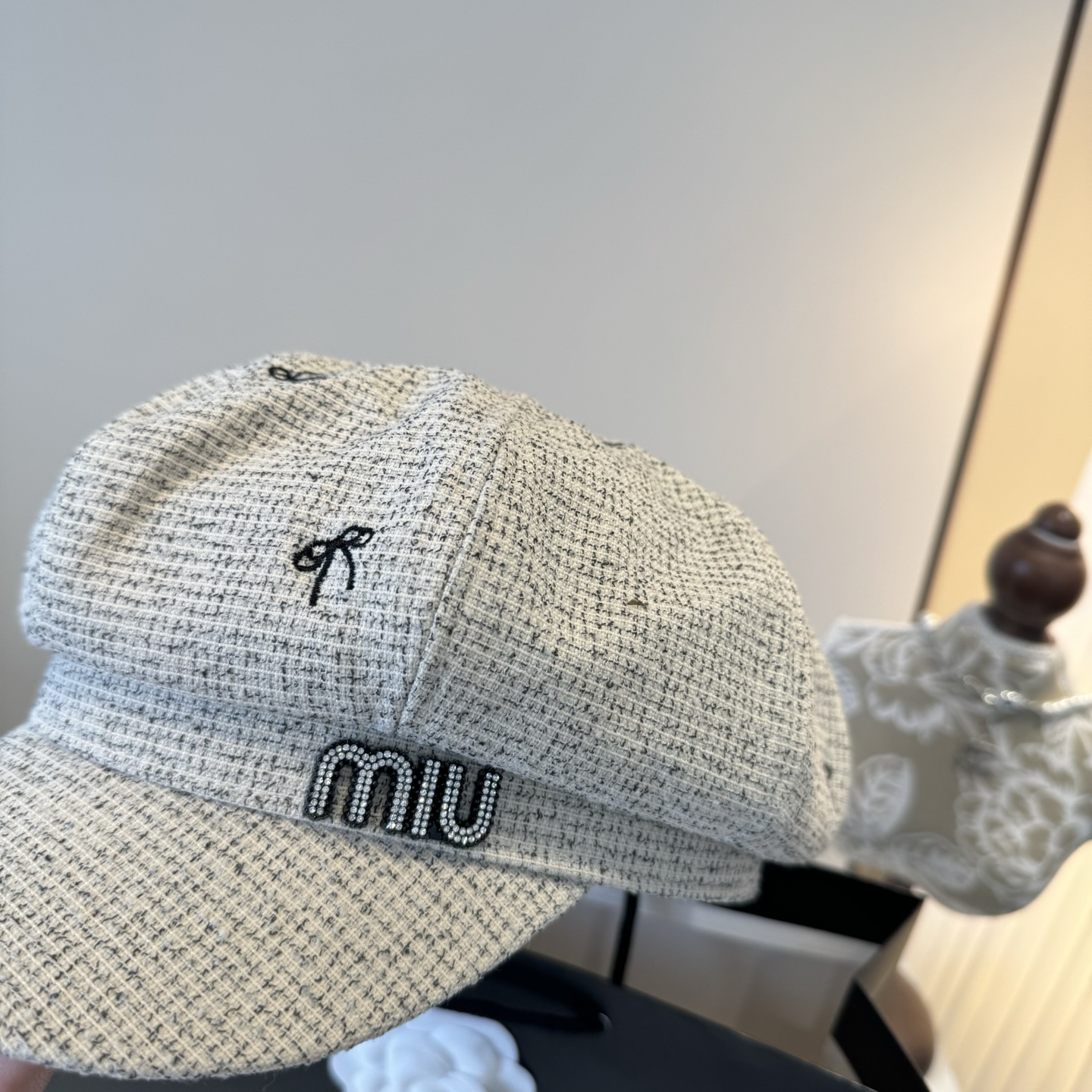 这款帽子是AAAAA 1:1 质量 (非常棒). 使用了和原版一模一样的材料. 商标部分也保持了和缪缪/Miu Miu一样. 图片拍摄是实物帽子拍摄, 您所收到的实物保证和我们图片一模一样.