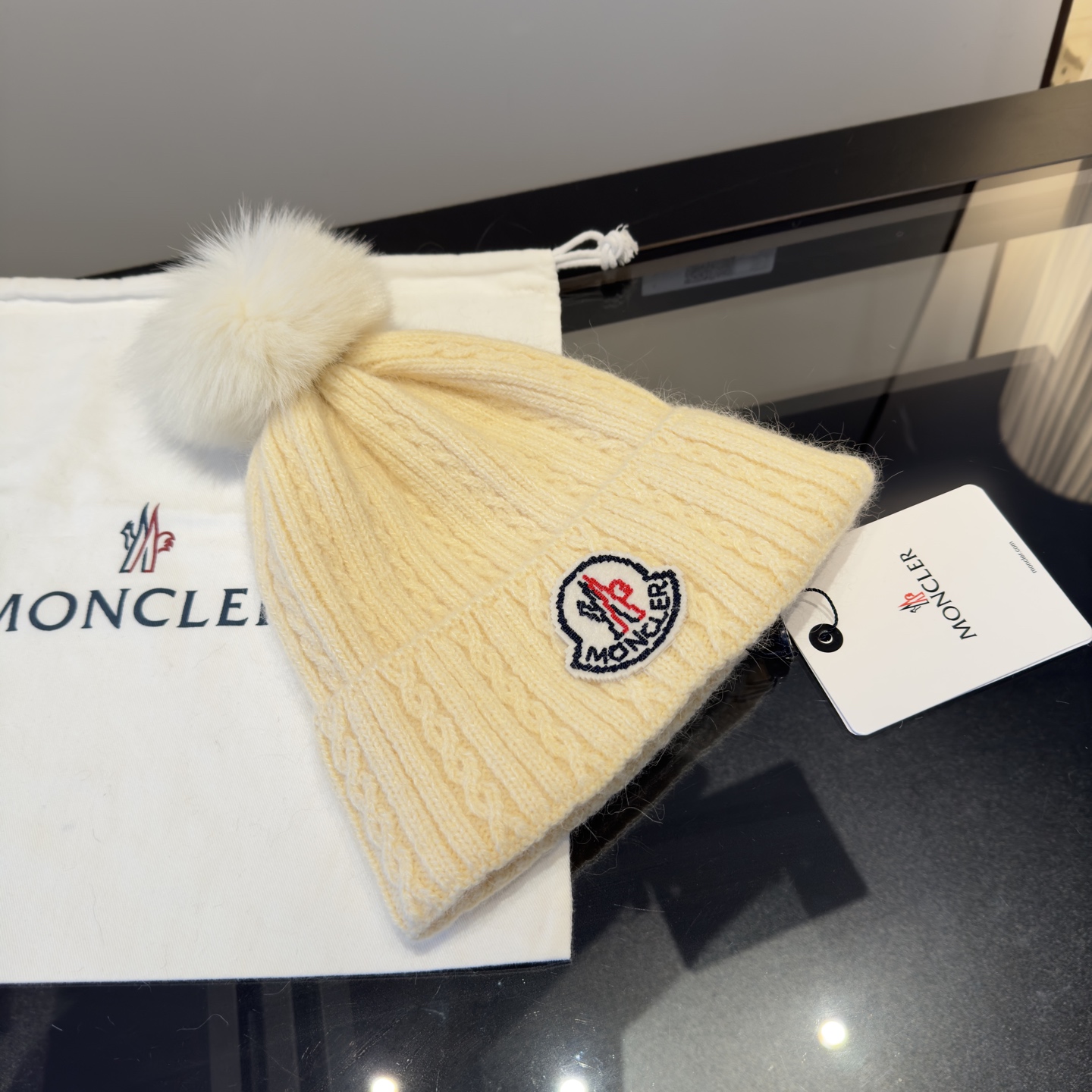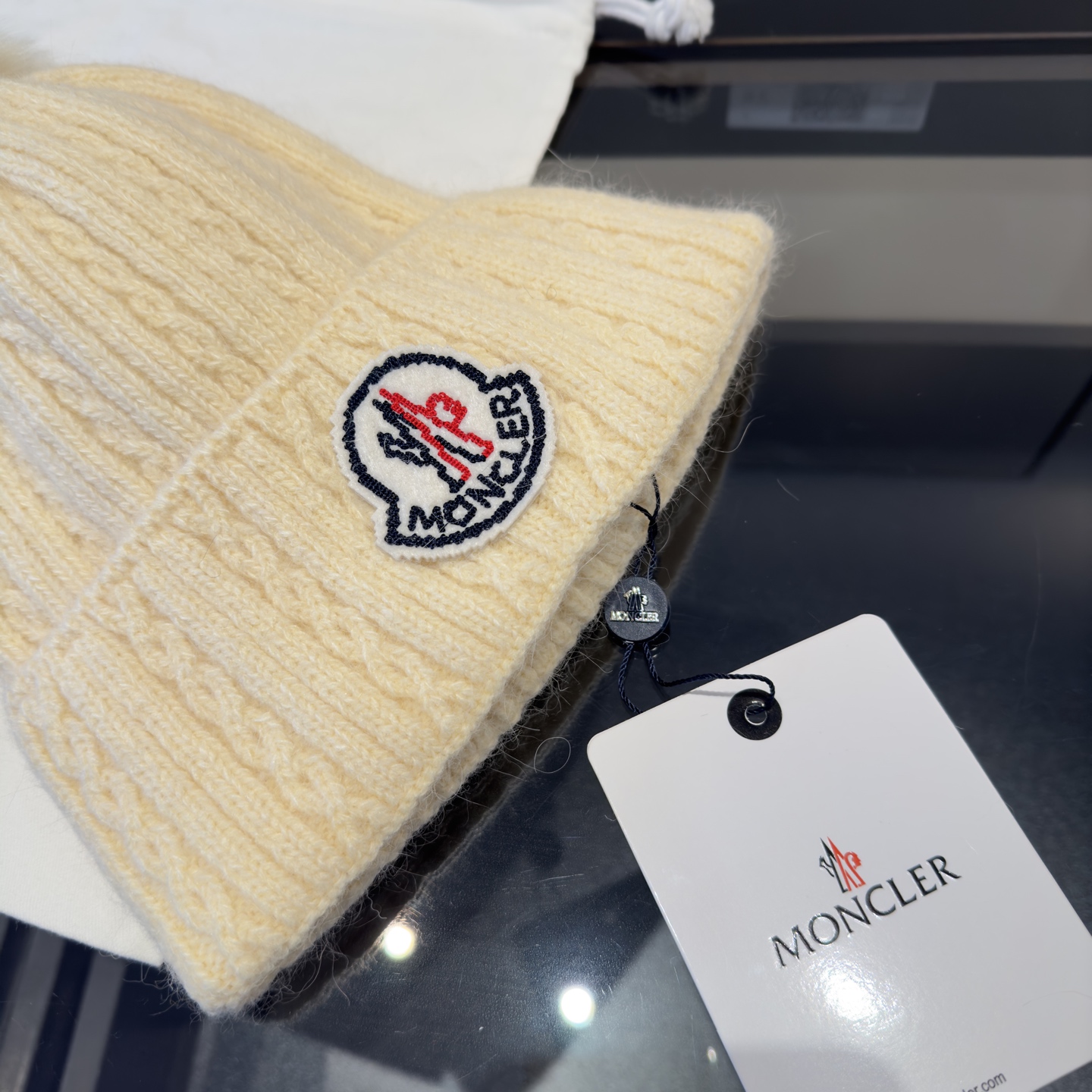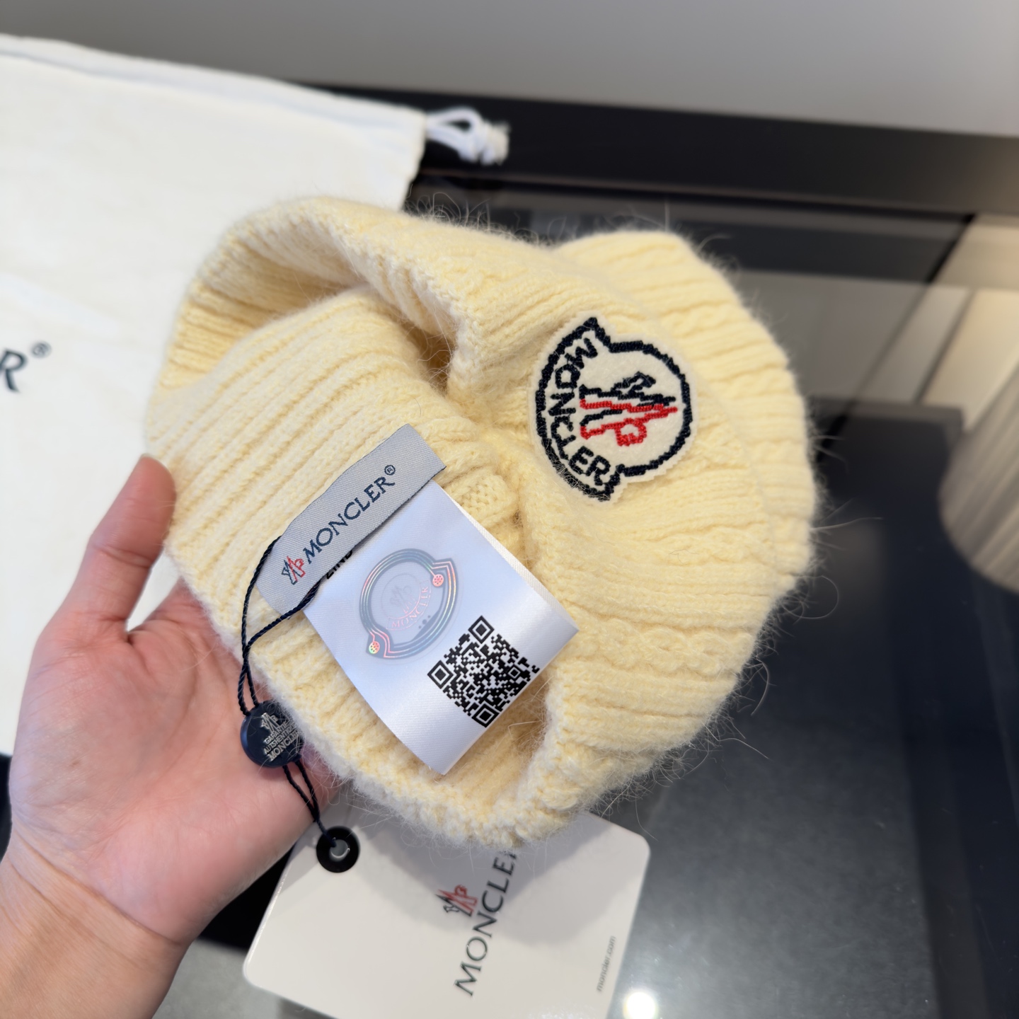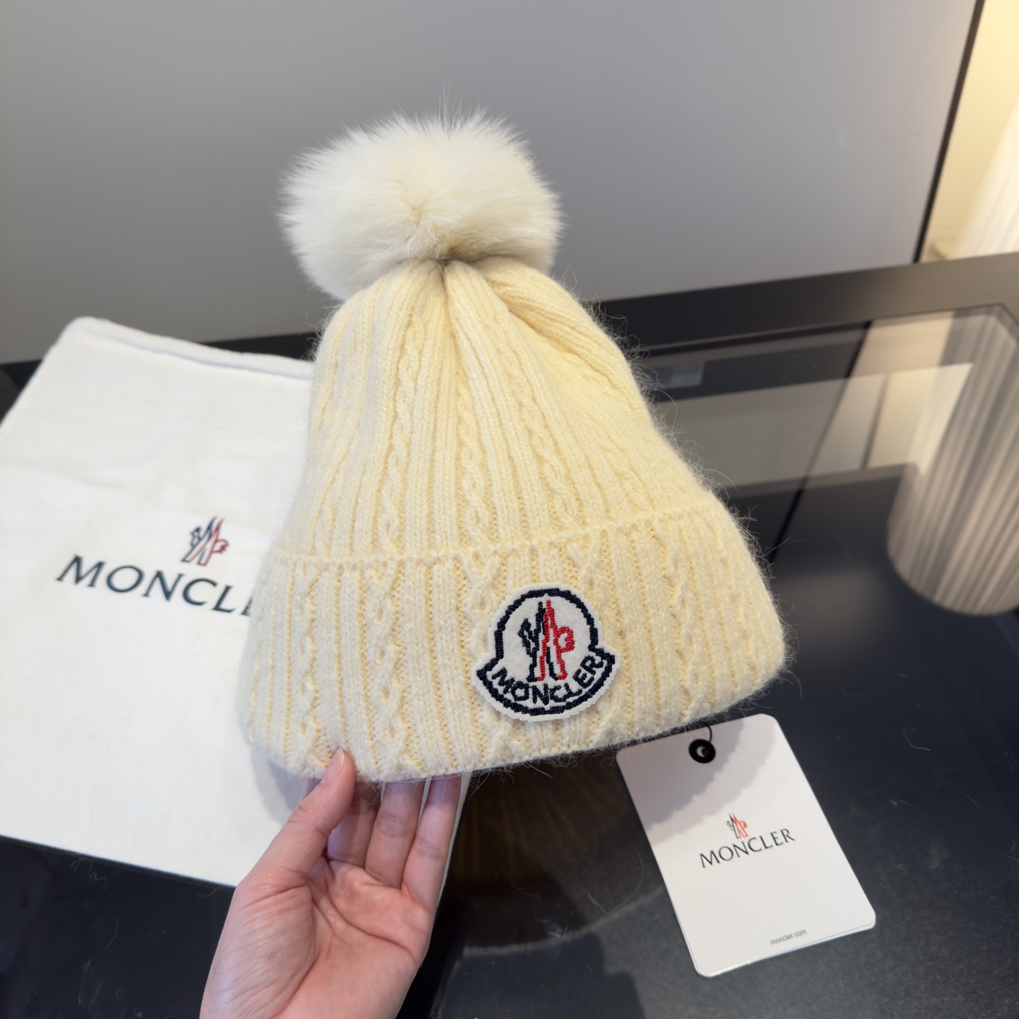 这款帽子是AAAAA 1:1 质量 (非常棒). 使用了和原版一模一样的材料. 商标部分也保持了和盟可睐/moncler一样. 图片拍摄是实物帽子拍摄, 您所收到的实物保证和我们图片一模一样.