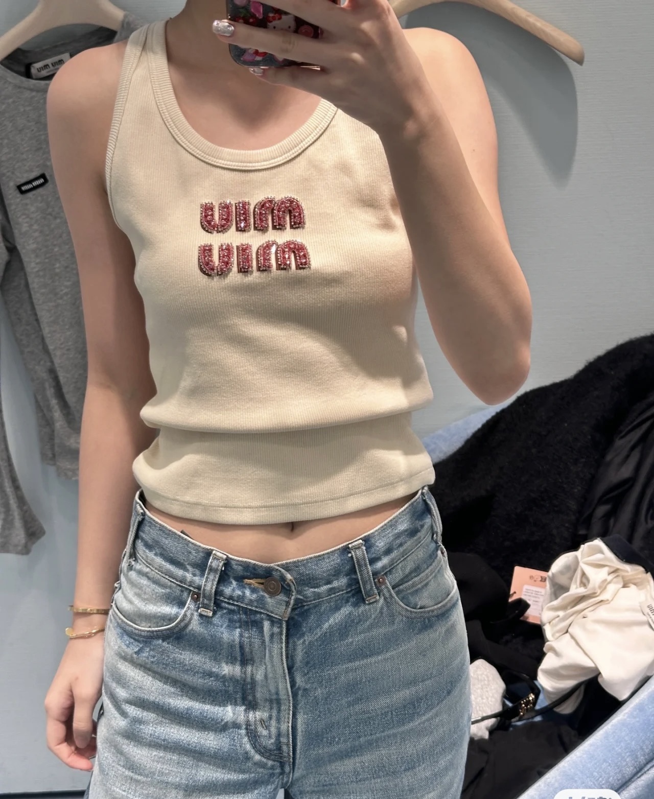 这款衣服是AAAAA 1:1 质量 (非常棒). 使用了和原版一模一样的材料. 商标部分也保持了和缪缪/Miu Miu一样. 图片拍摄是实物衣服拍摄, 您所收到的实物保证和我们图片一模一样.