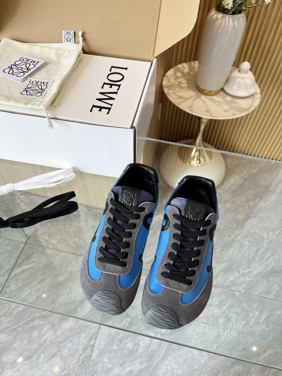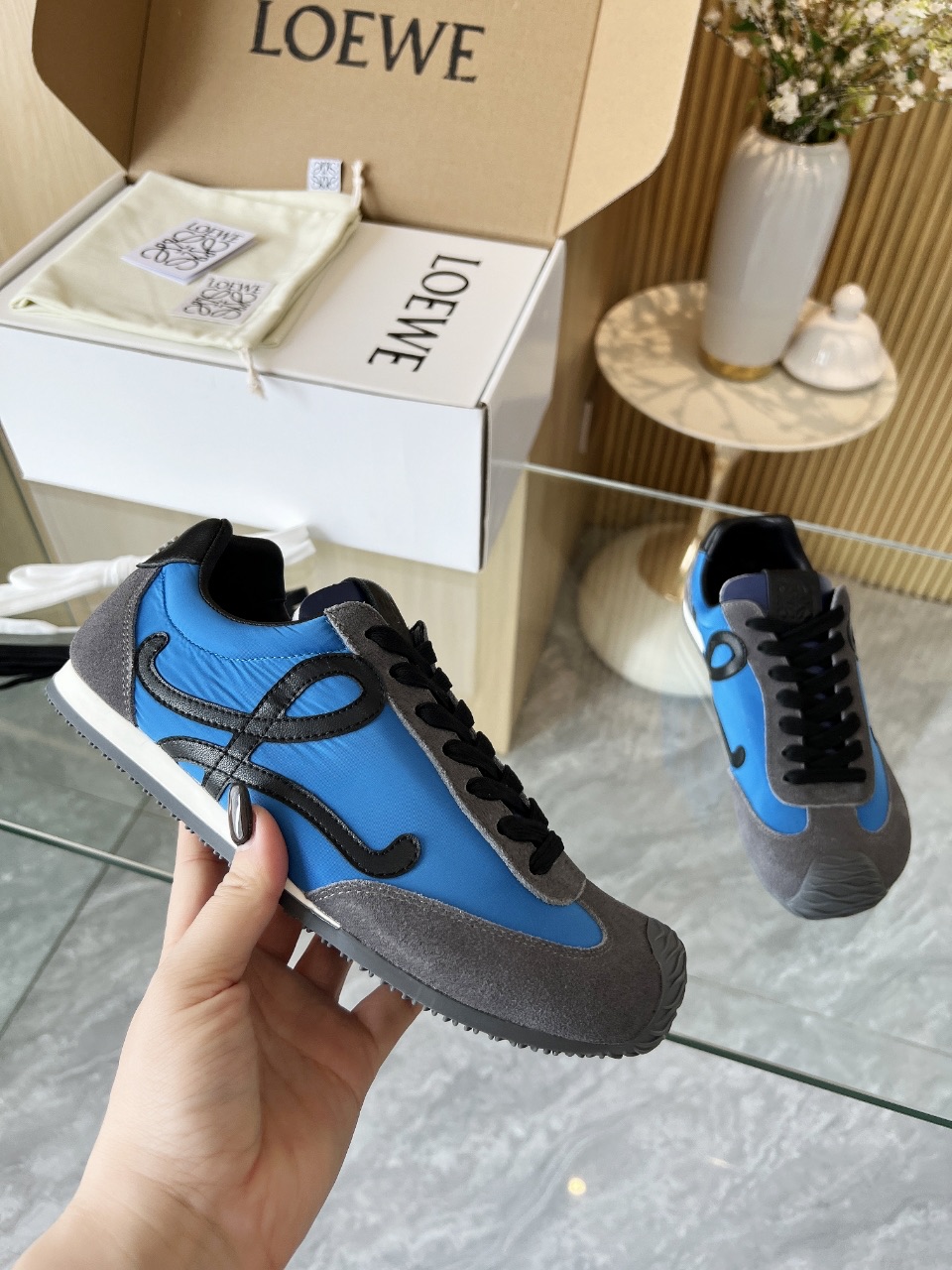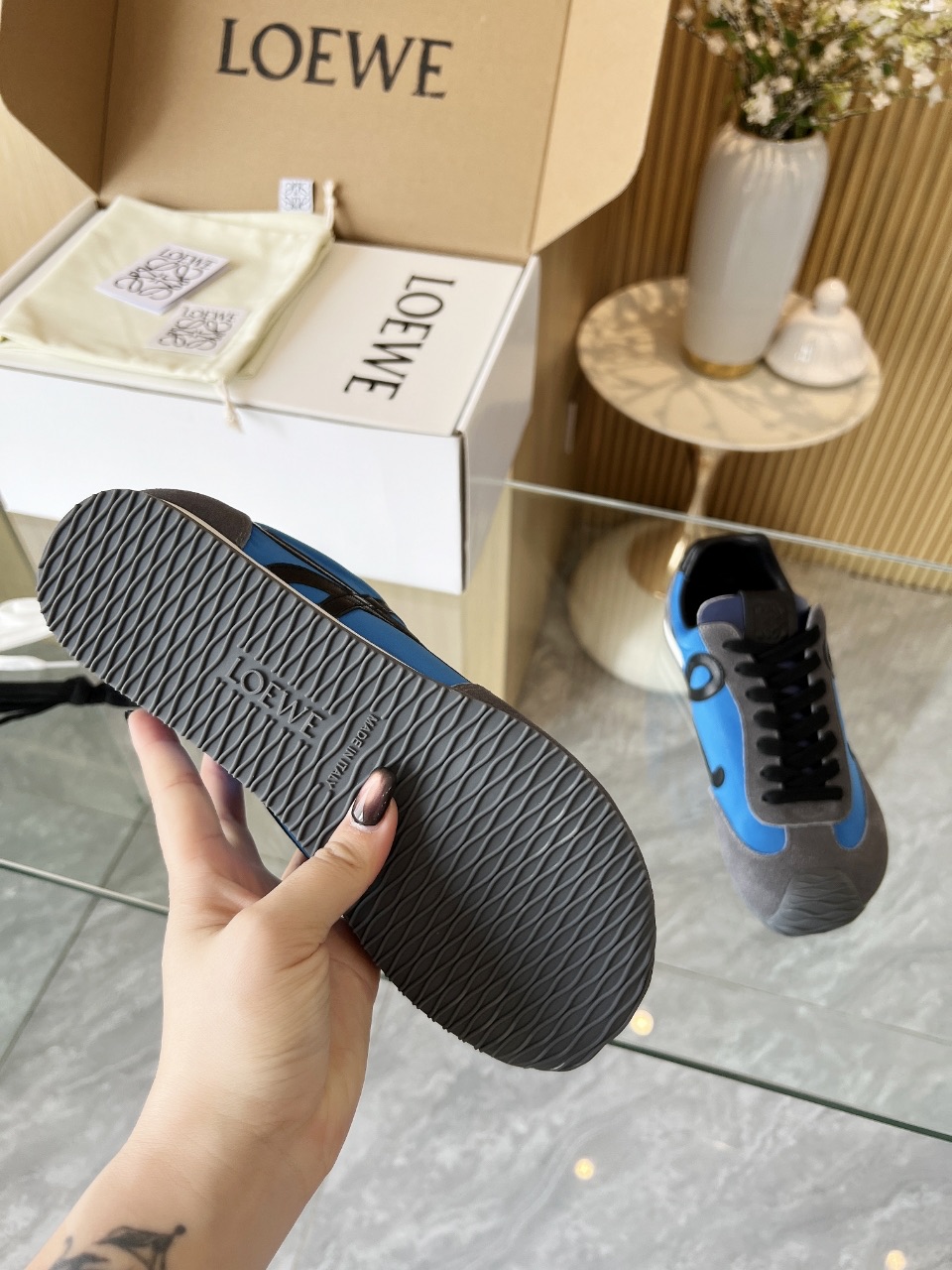 这款鞋子是AAAAA 1:1 质量 (非常棒). 使用了和原版一模一样的材料. 商标部分也保持了和罗意威/Loewe一样. 图片拍摄是实物鞋子拍摄, 您所收到的实物保证和我们图片一模一样.