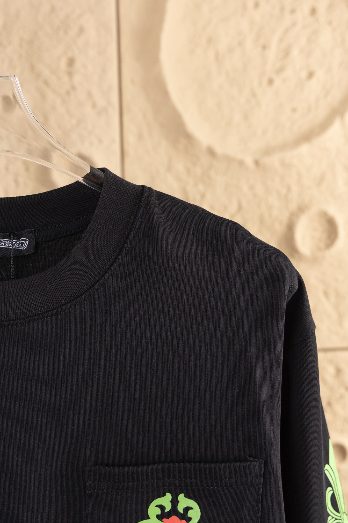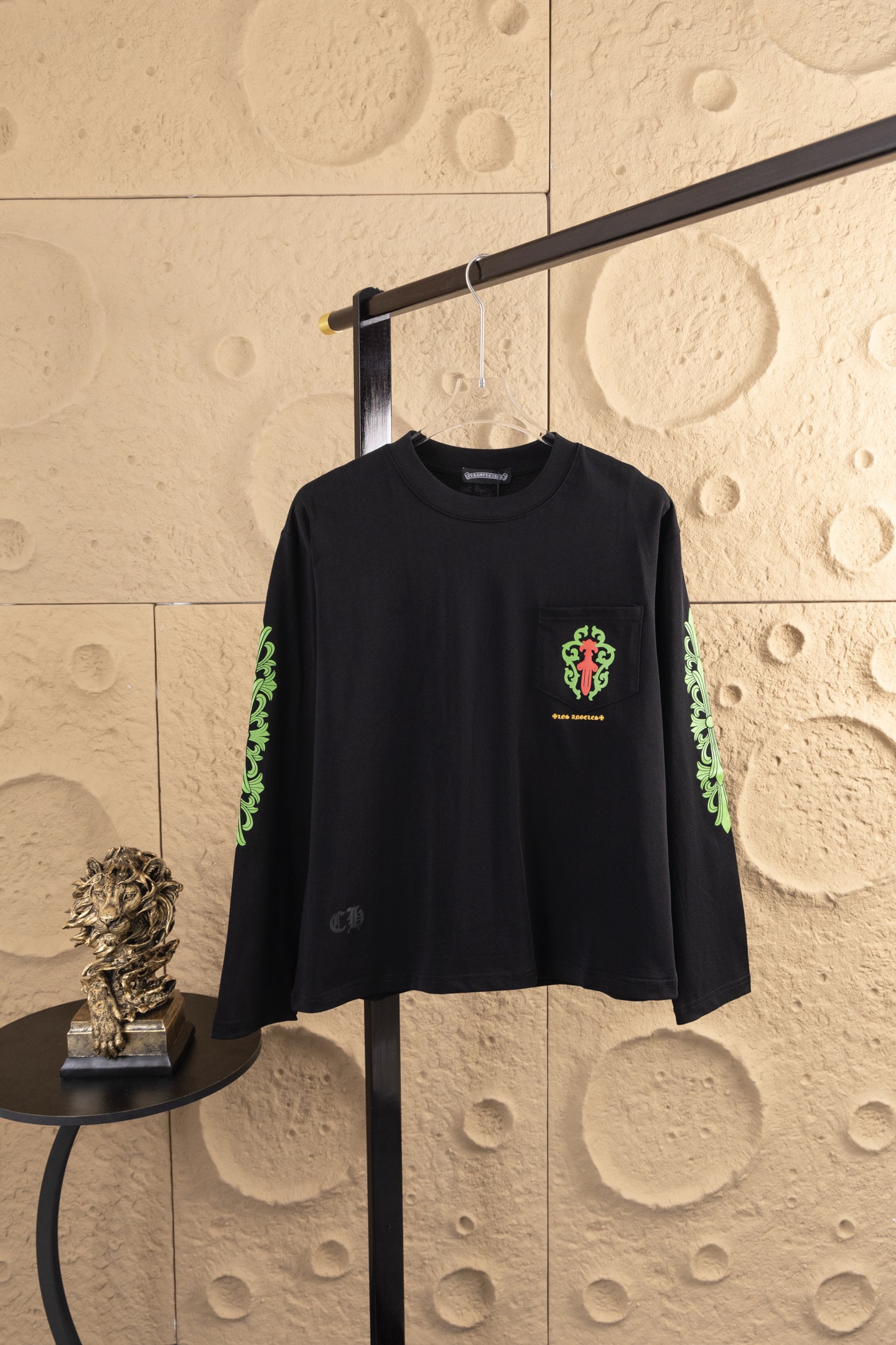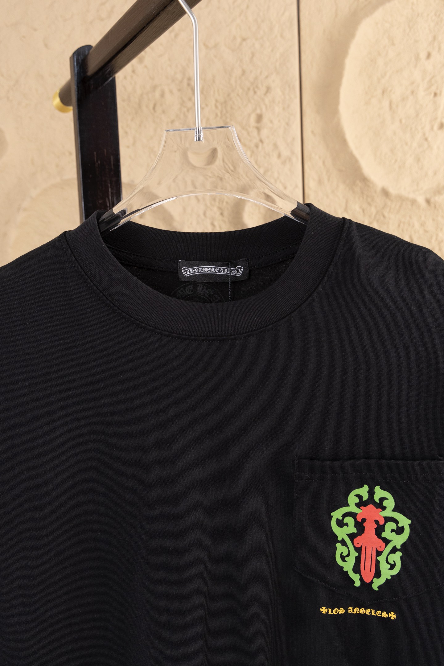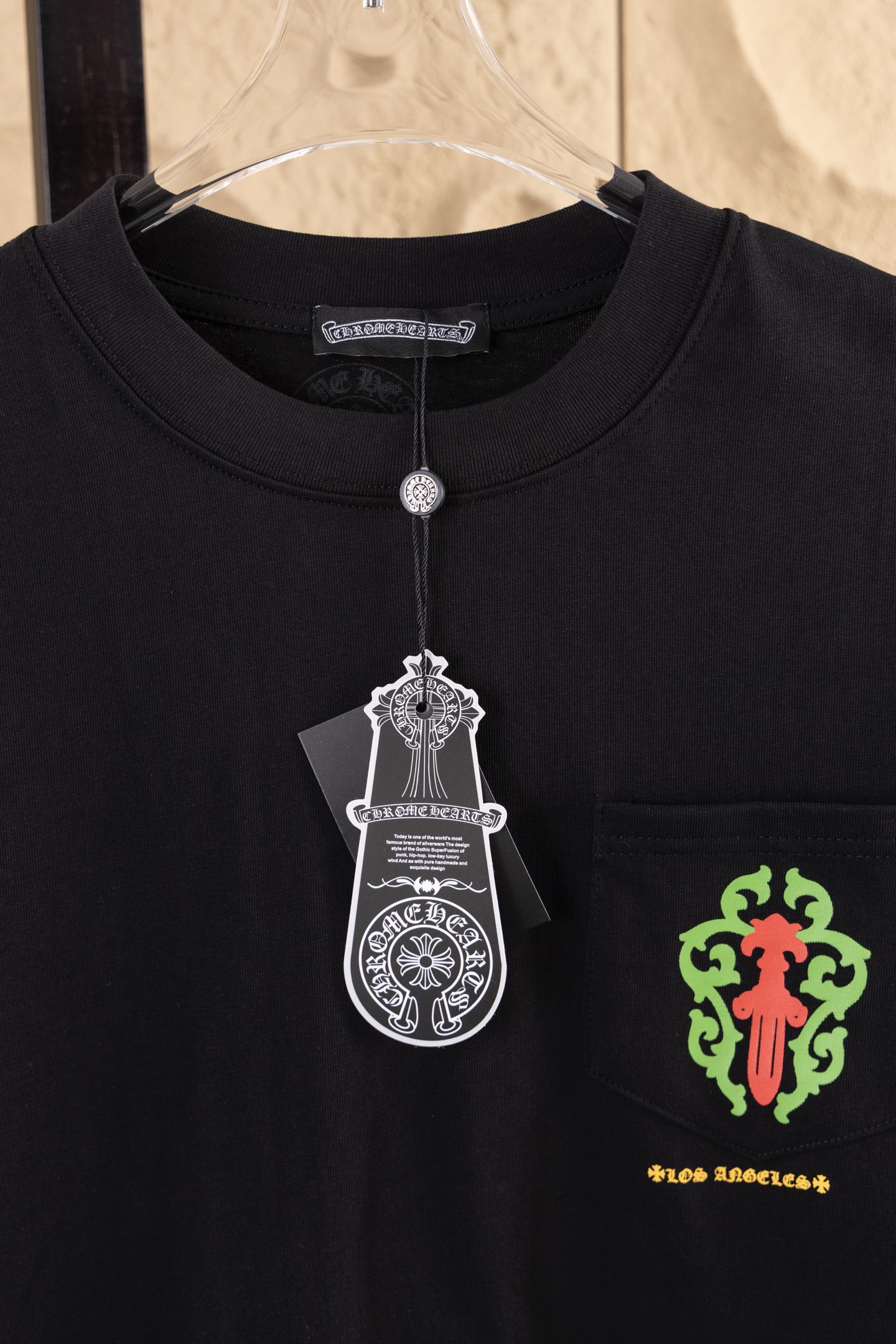 这款衣服是AAAAA 1:1 质量 (非常棒). 使用了和原版一模一样的材料. 商标部分也保持了和克罗心/Chrome Hearts一样. 图片拍摄是实物衣服拍摄, 您所收到的实物保证和我们图片一模一样.