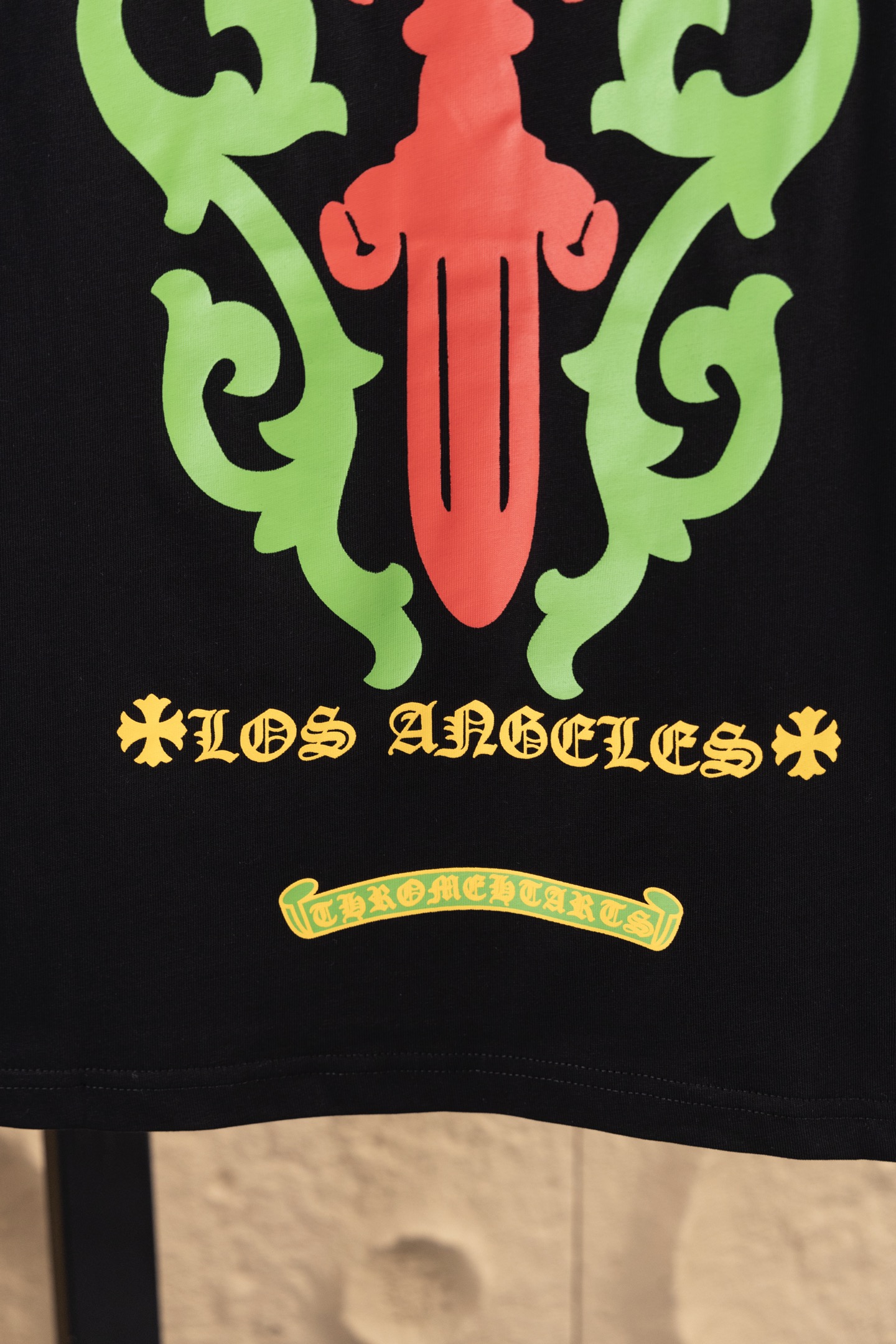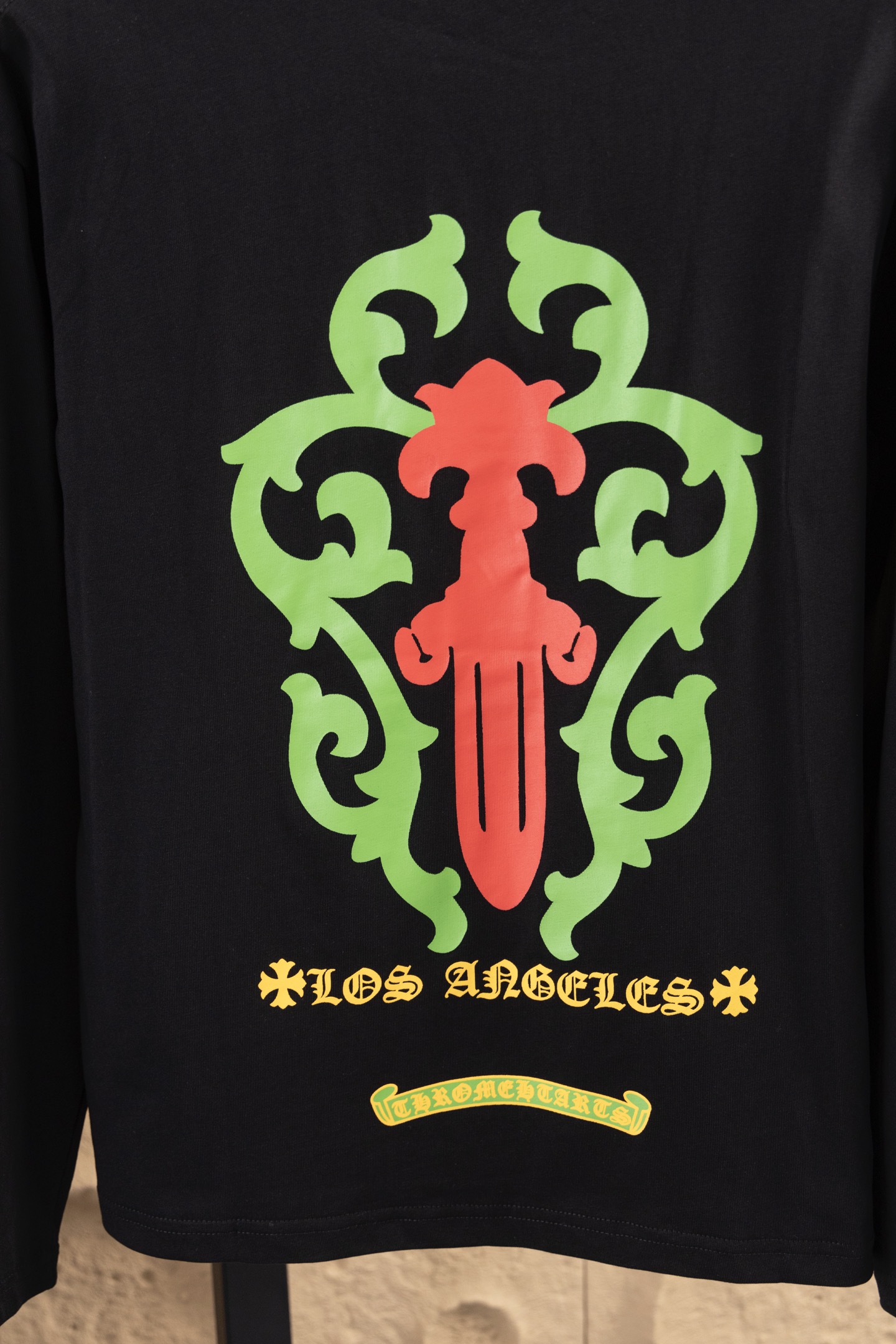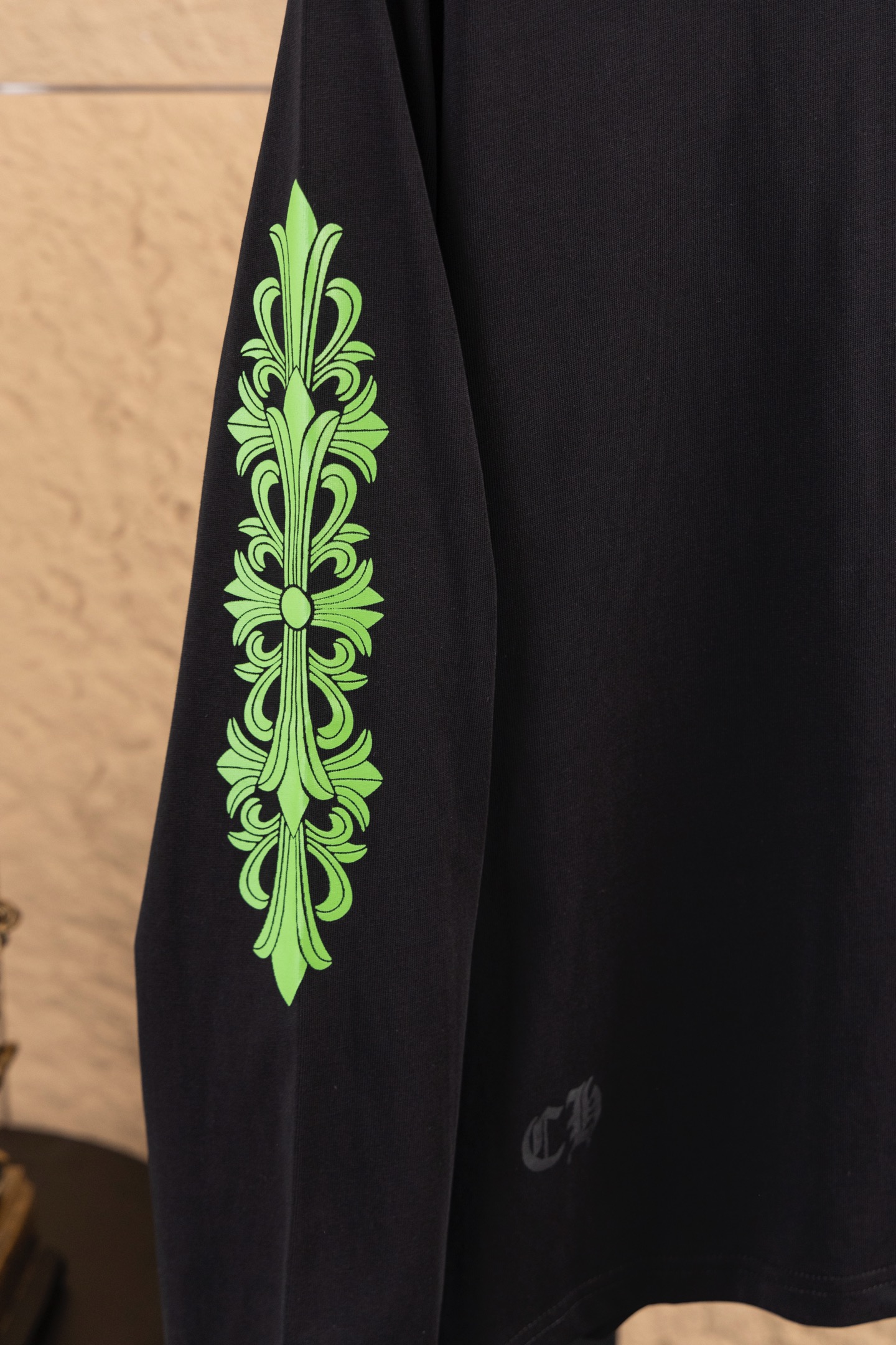 这款衣服是AAAAA 1:1 质量 (非常棒). 使用了和原版一模一样的材料. 商标部分也保持了和克罗心/Chrome Hearts一样. 图片拍摄是实物衣服拍摄, 您所收到的实物保证和我们图片一模一样.