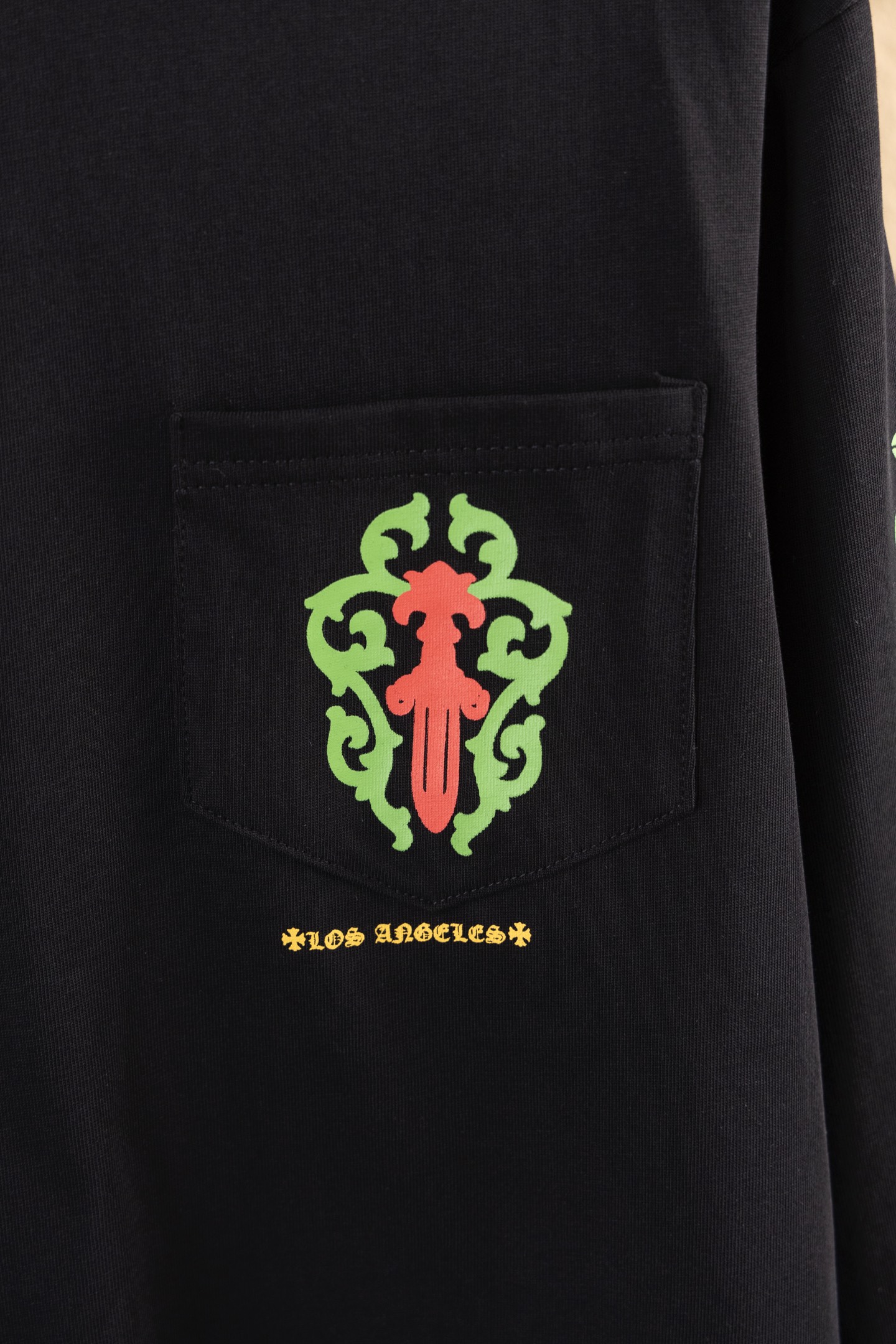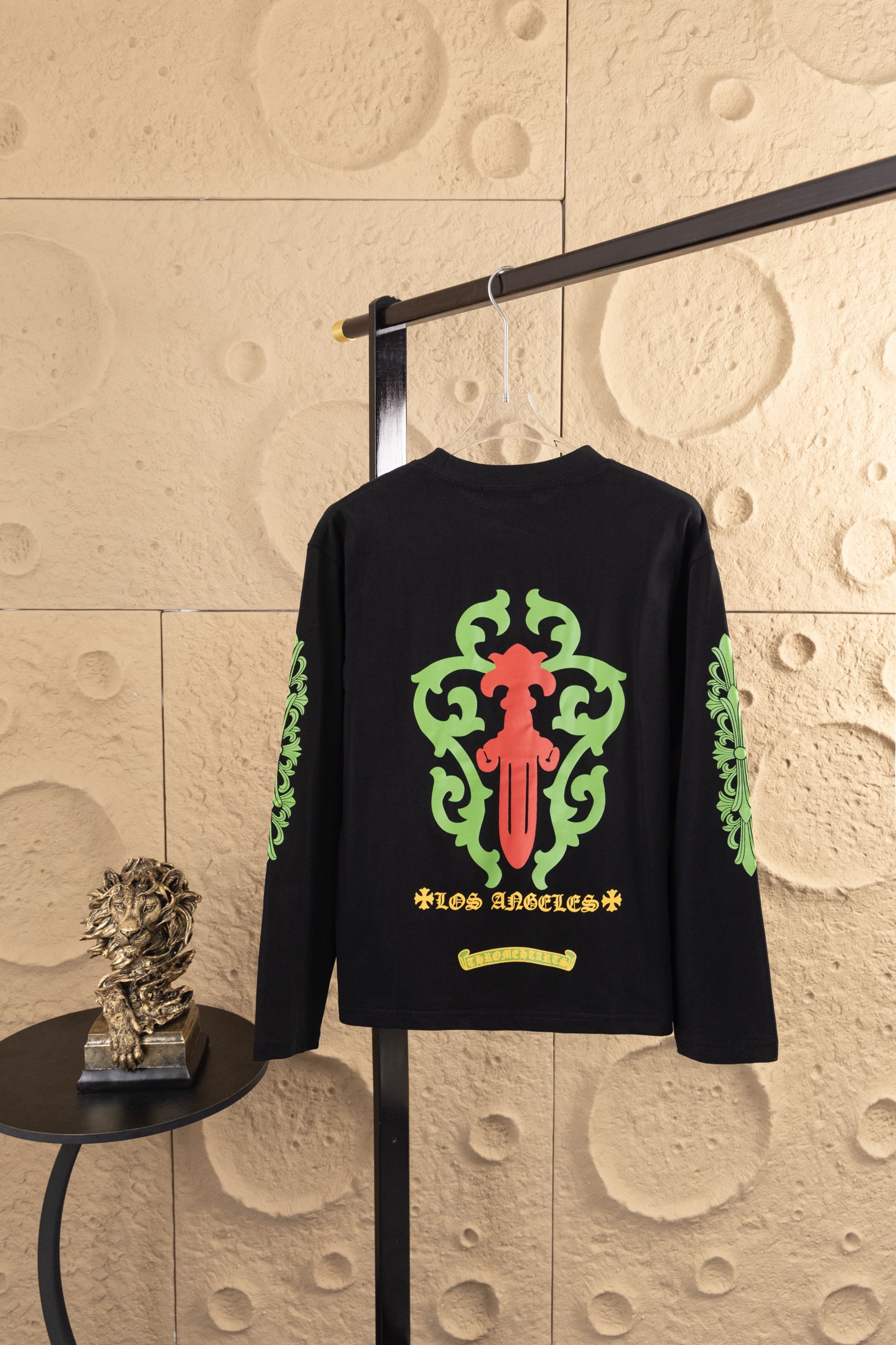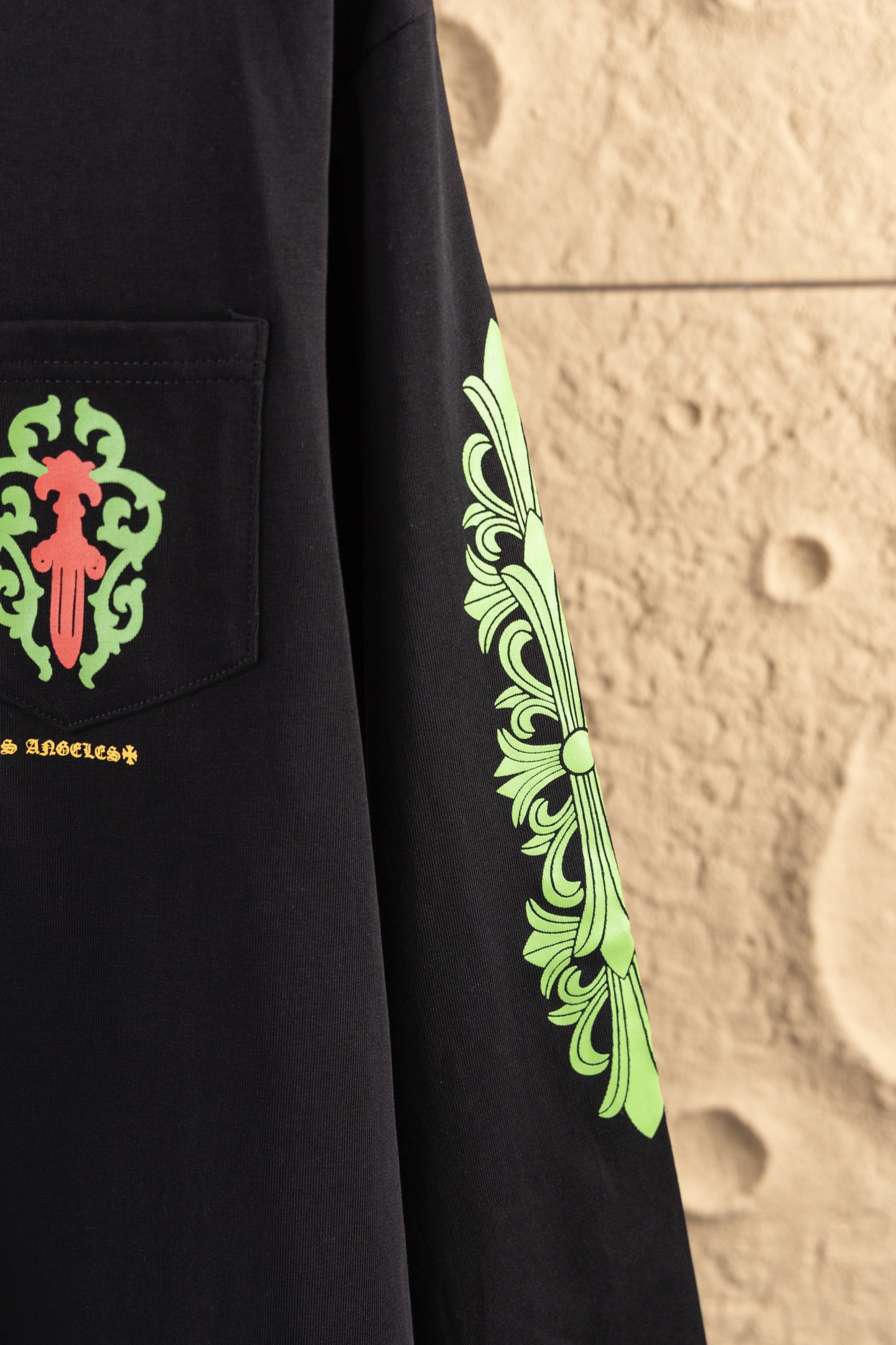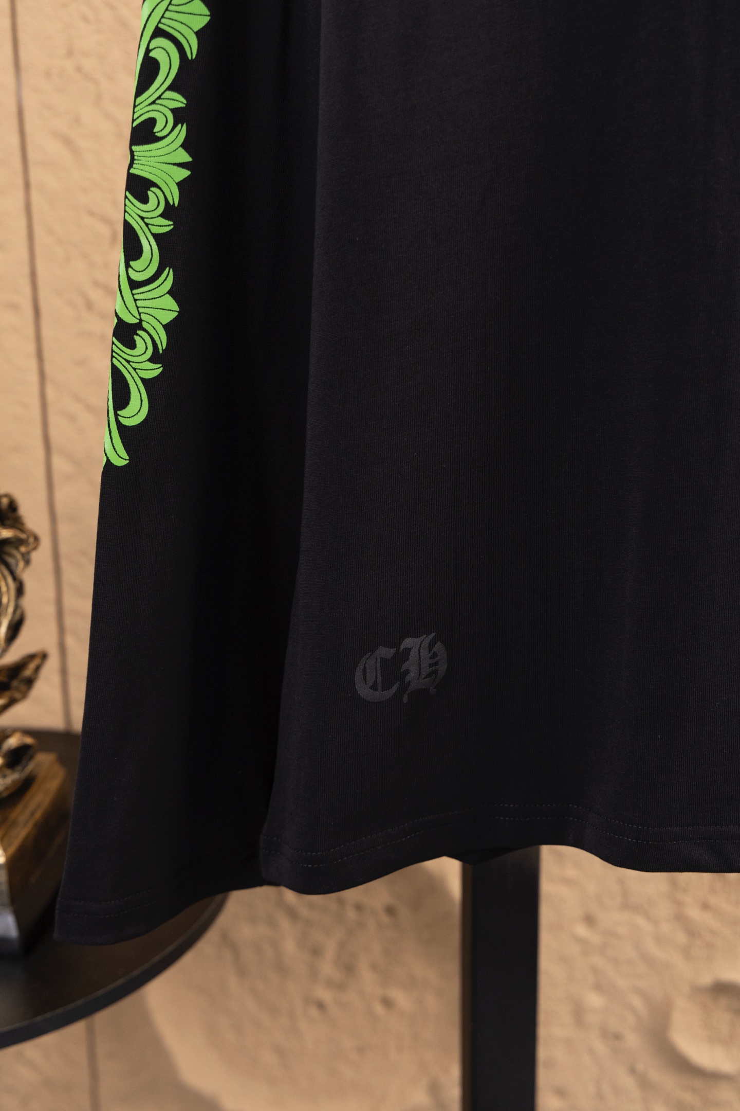 这款衣服是AAAAA 1:1 质量 (非常棒). 使用了和原版一模一样的材料. 商标部分也保持了和克罗心/Chrome Hearts一样. 图片拍摄是实物衣服拍摄, 您所收到的实物保证和我们图片一模一样.