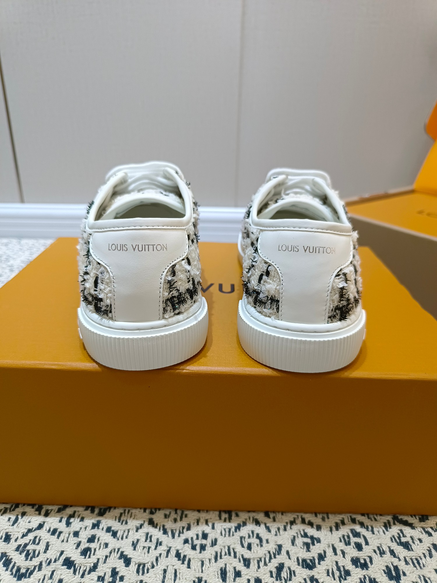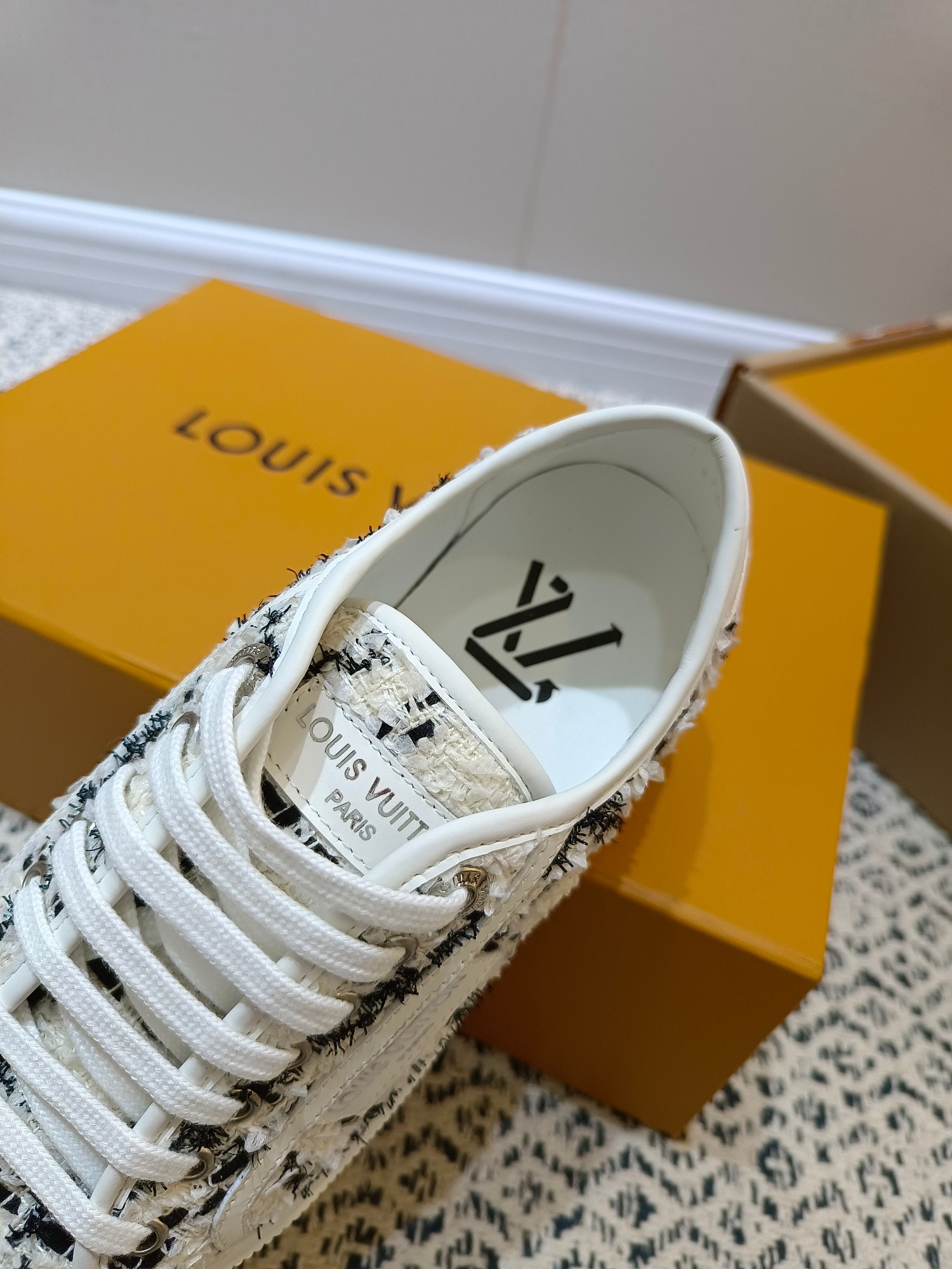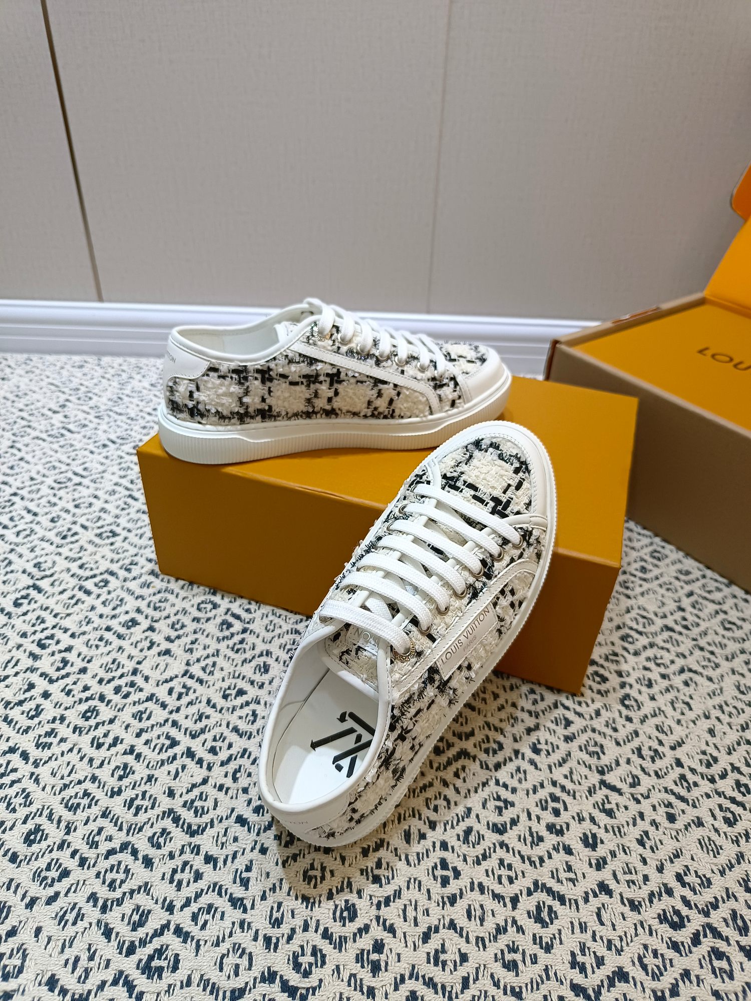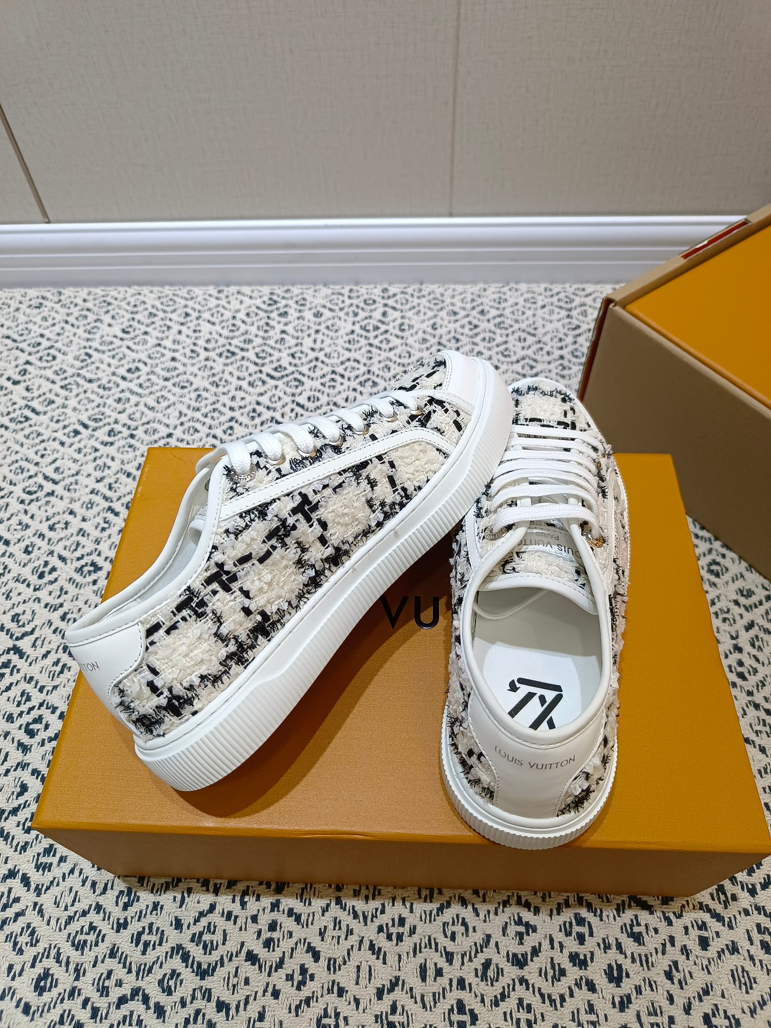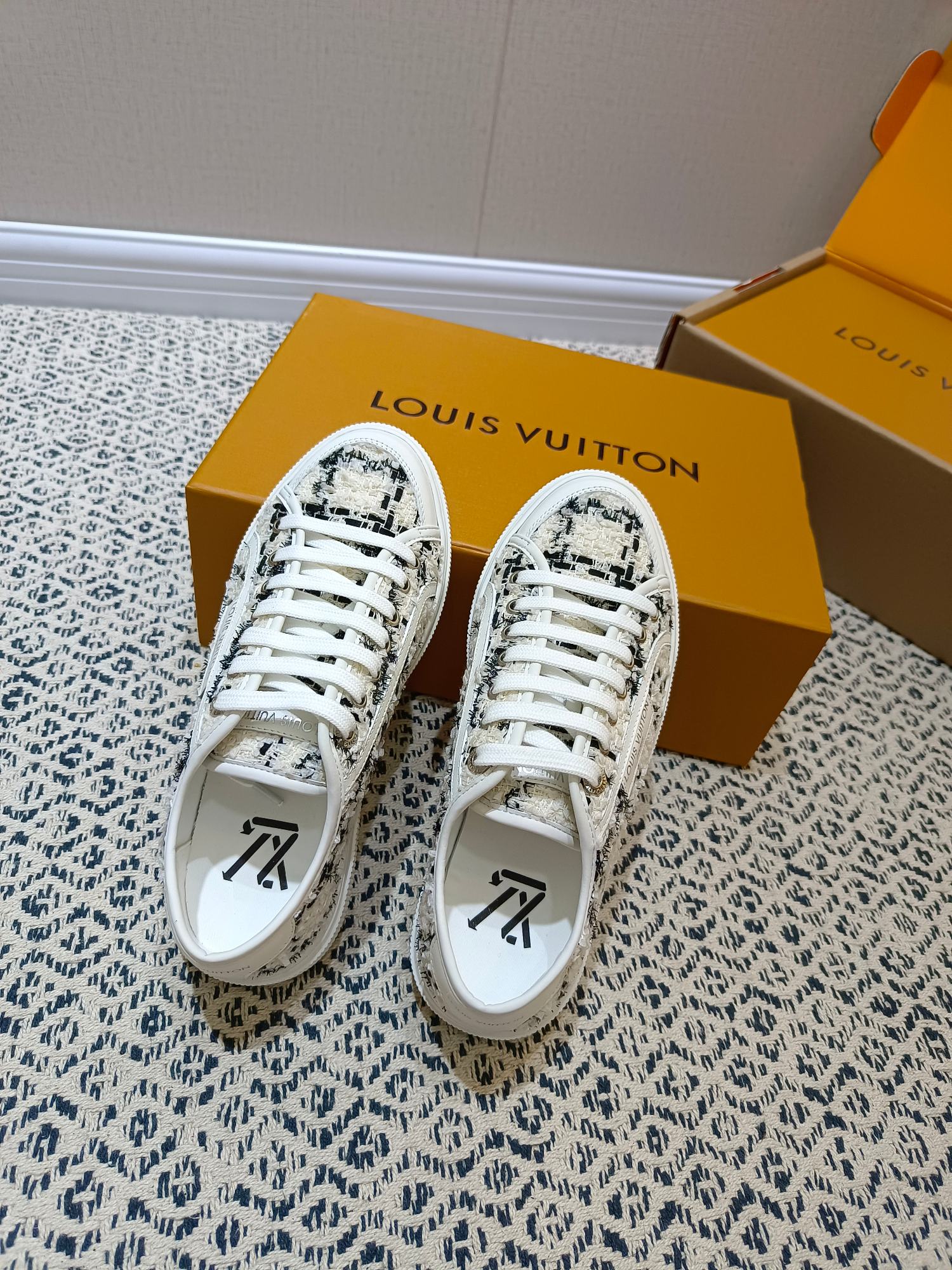 这款鞋子是AAAAA 1:1 质量 (非常棒). 使用了和原版一模一样的材料. 商标部分也保持了和路易威登/Louis Vuitton一样. 图片拍摄是实物鞋子拍摄, 您所收到的实物保证和我们图片一模一样.
