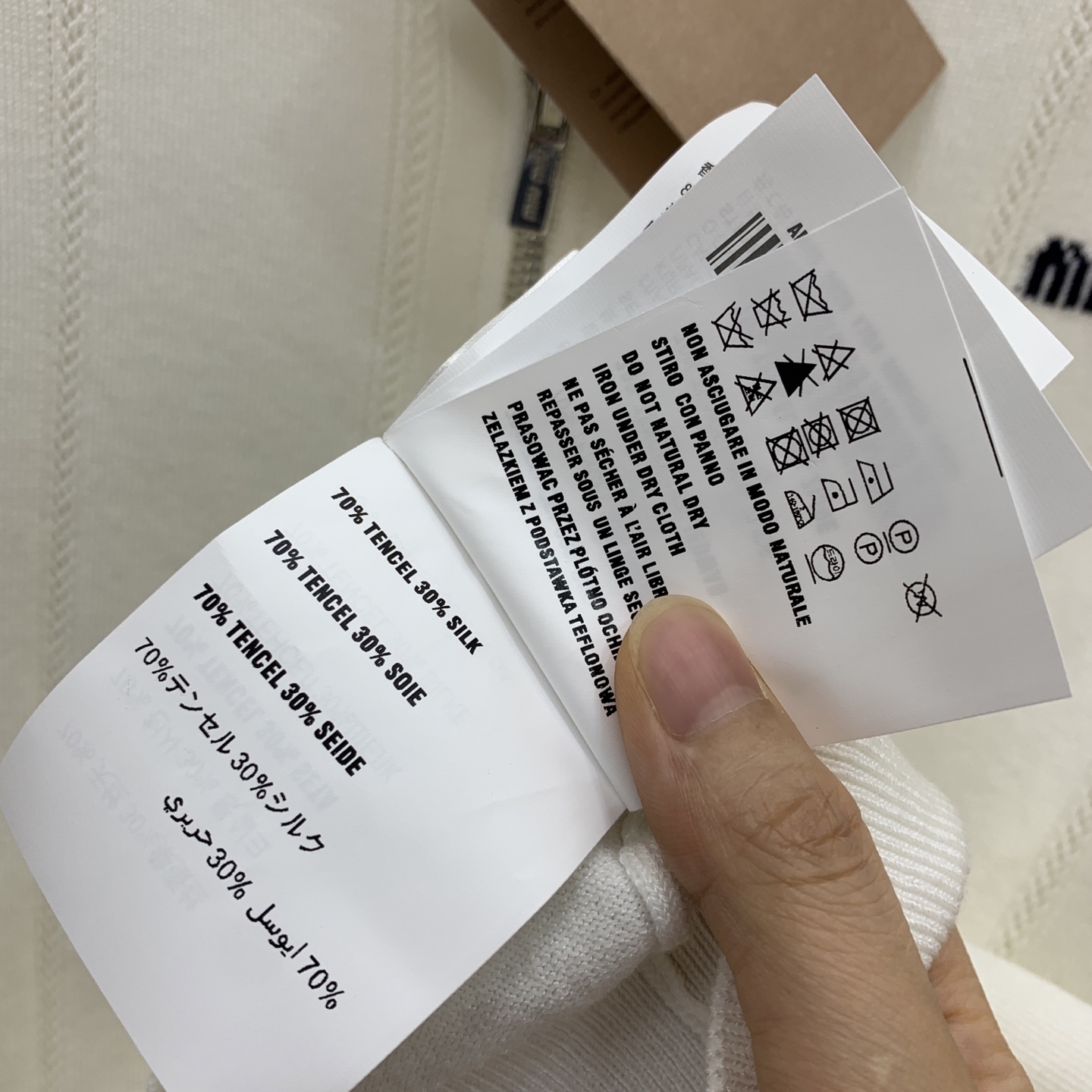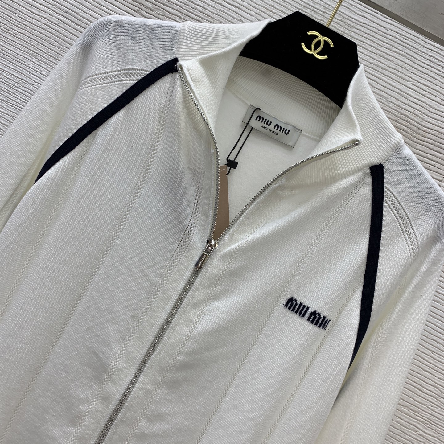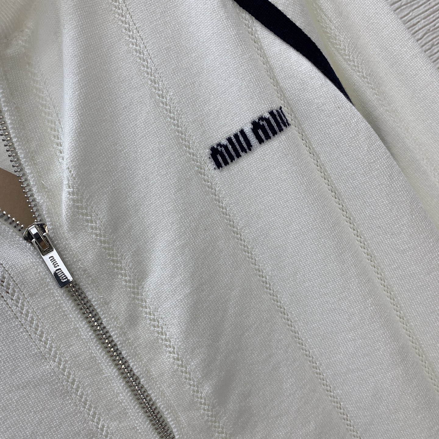 这款衣服是AAAAA 1:1 质量 (非常棒). 使用了和原版一模一样的材料. 商标部分也保持了和缪缪/Miu Miu一样. 图片拍摄是实物衣服拍摄, 您所收到的实物保证和我们图片一模一样.