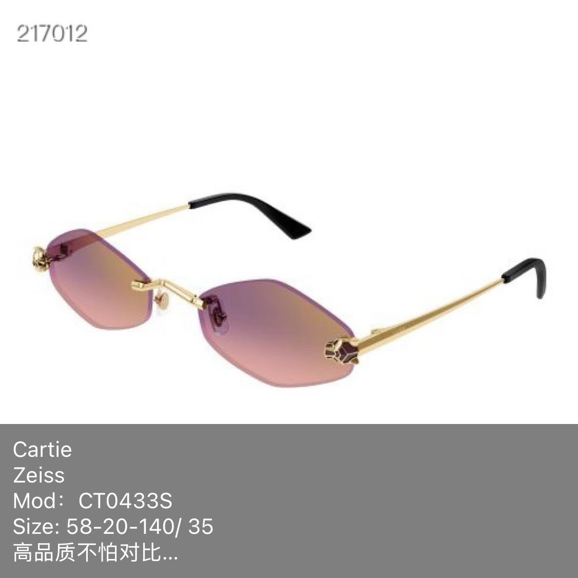 这款太阳眼镜是AAAAA 1:1 质量 (非常棒). 使用了和原版一模一样的材料. 商标部分也保持了和卡地亚/Cartier一样. 图片拍摄是实物太阳眼镜拍摄, 您所收到的实物保证和我们图片一模一样.