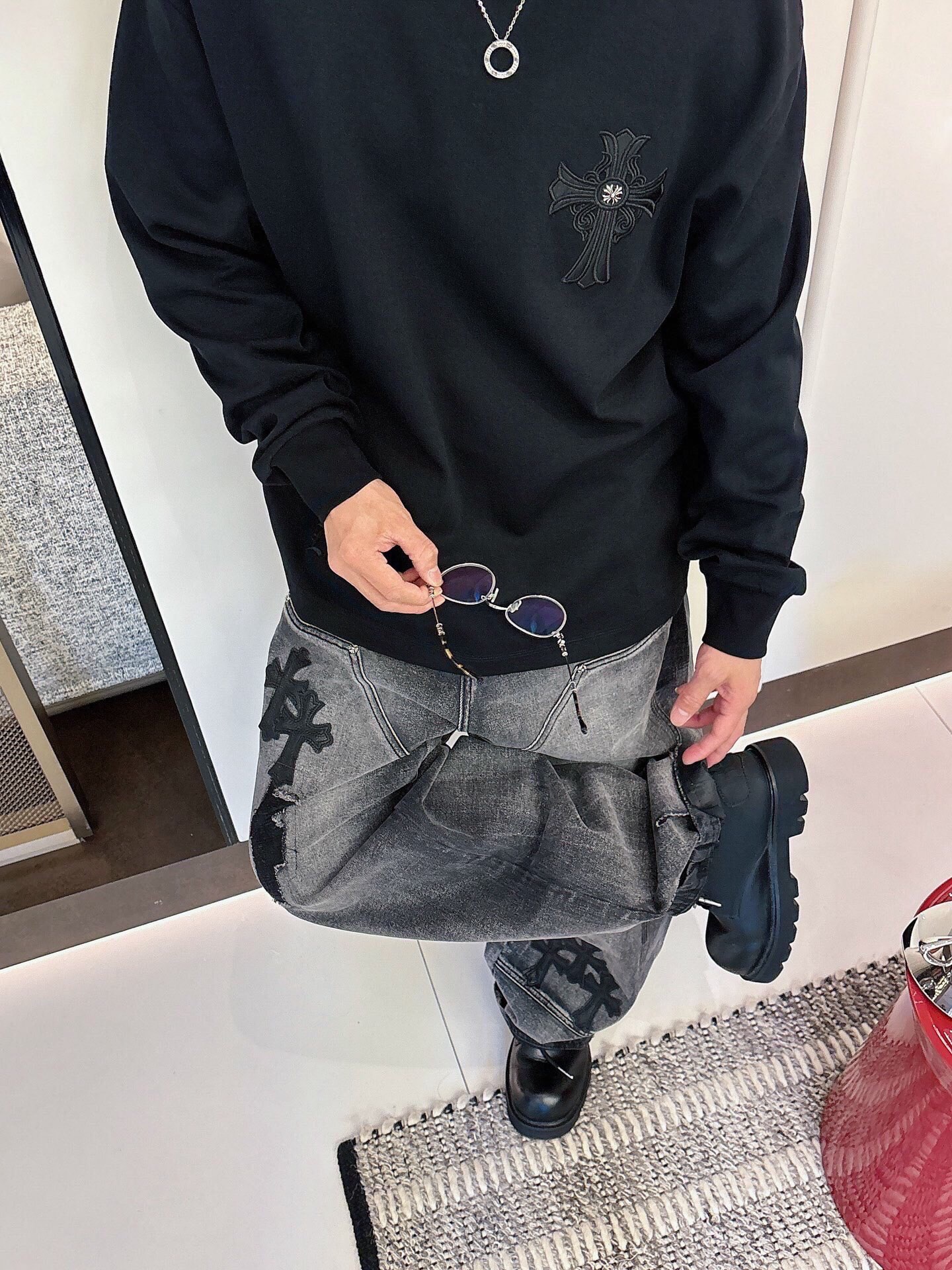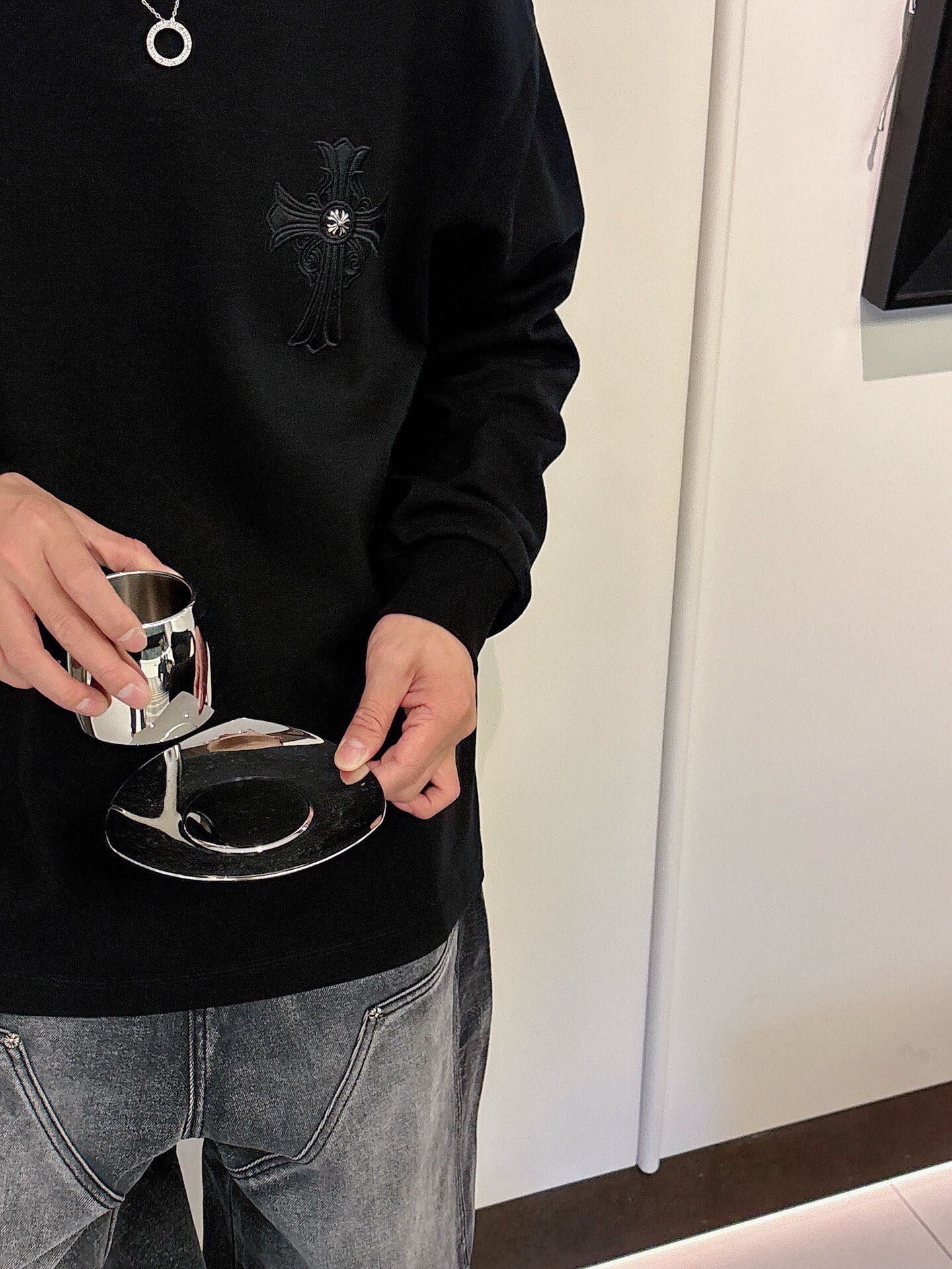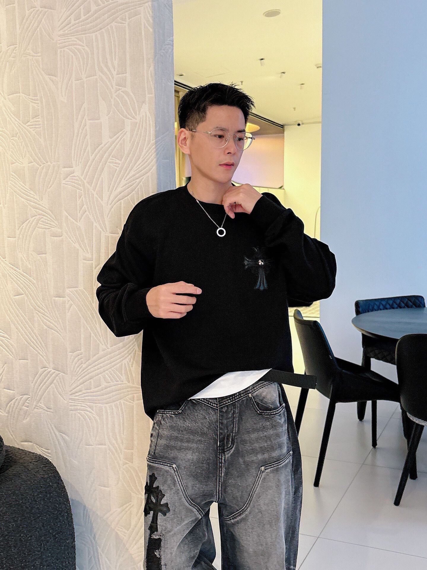 这款衣服是AAAAA 1:1 质量 (非常棒). 使用了和原版一模一样的材料. 商标部分也保持了和克罗心/Chrome Hearts一样. 图片拍摄是实物衣服拍摄, 您所收到的实物保证和我们图片一模一样.