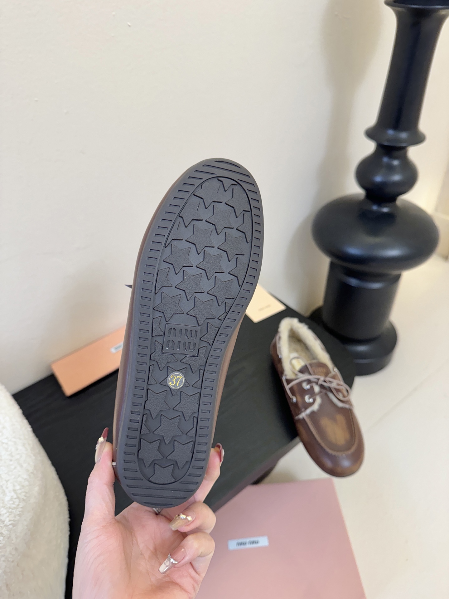 这款鞋子是AAAAA 1:1 质量 (非常棒). 使用了和原版一模一样的材料. 商标部分也保持了和缪缪/Miu Miu一样. 图片拍摄是实物鞋子拍摄, 您所收到的实物保证和我们图片一模一样.