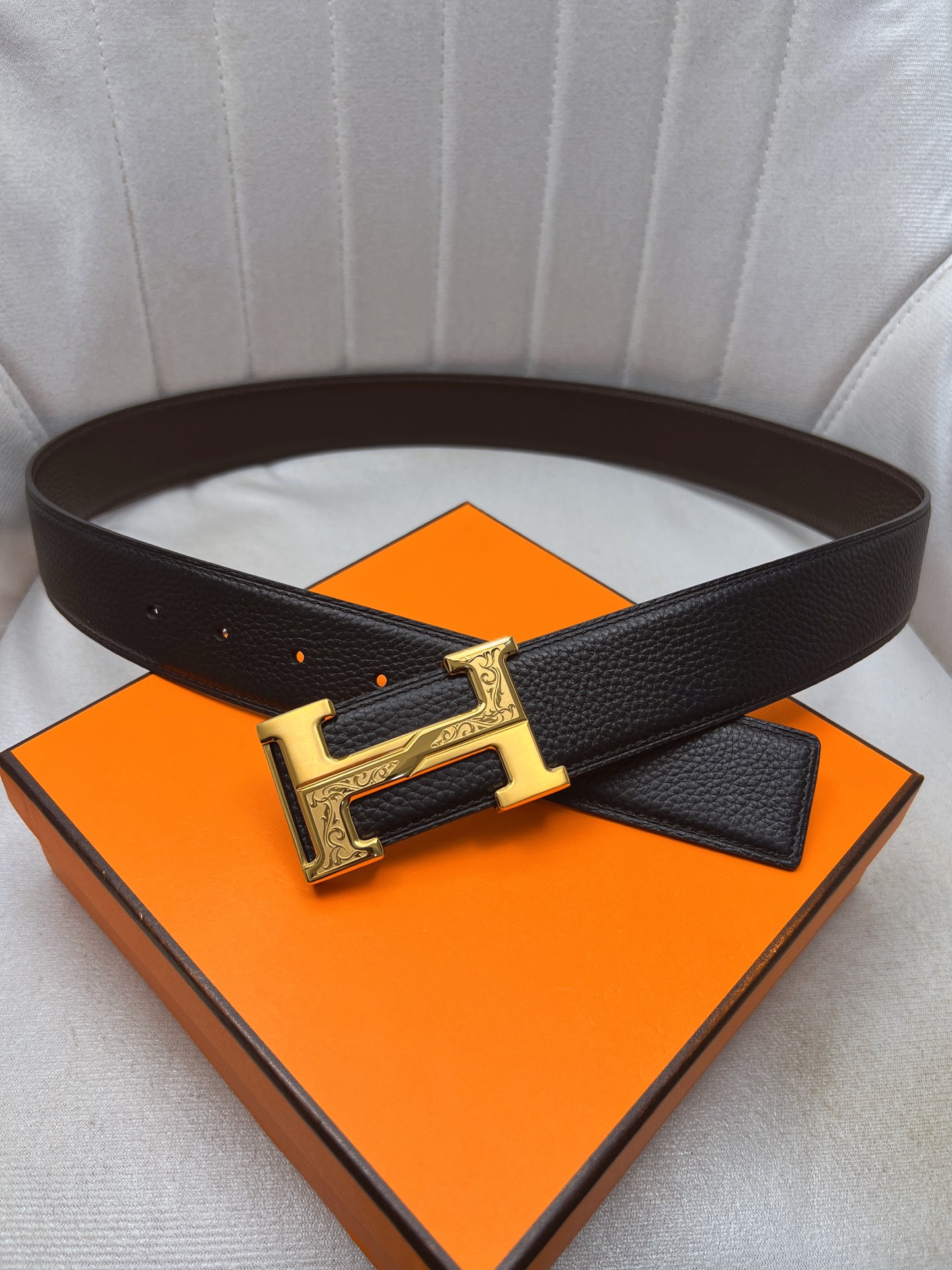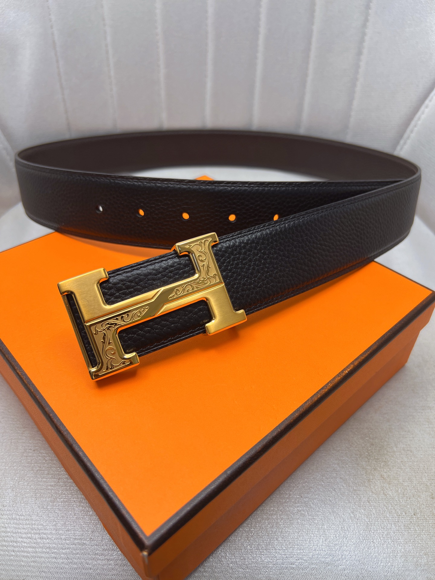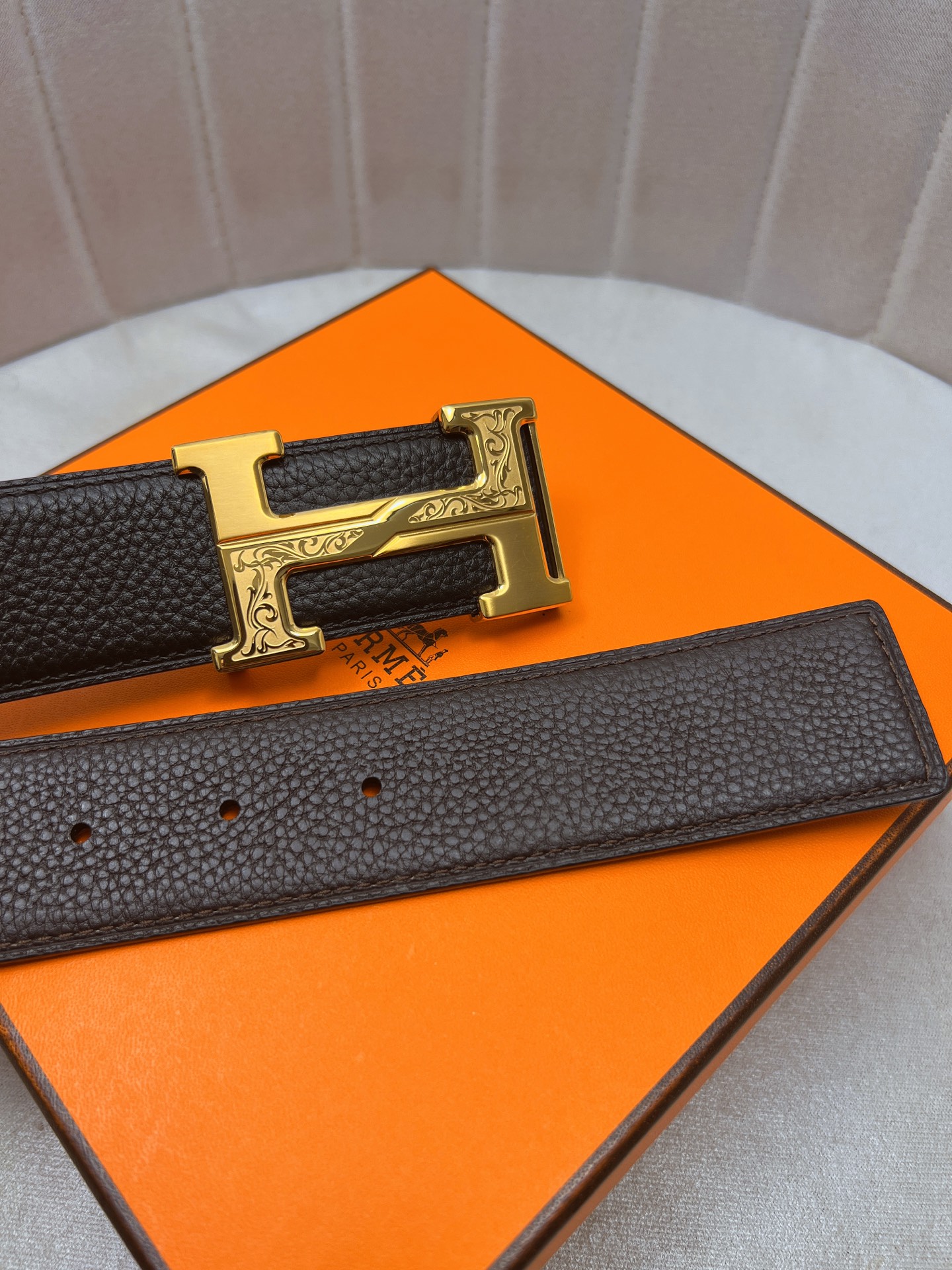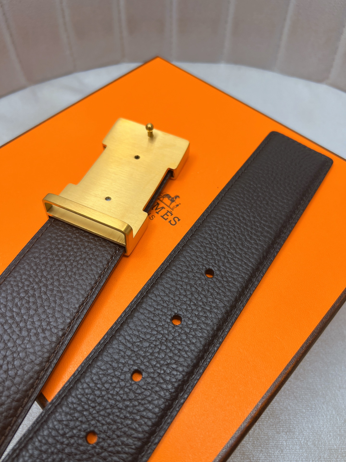 这款皮带是AAAAA 1:1 质量 (非常棒). 使用了和原版一模一样的材料. 商标部分也保持了和爱马仕/Hermes一样. 图片拍摄是实物皮带拍摄, 您所收到的实物保证和我们图片一模一样.