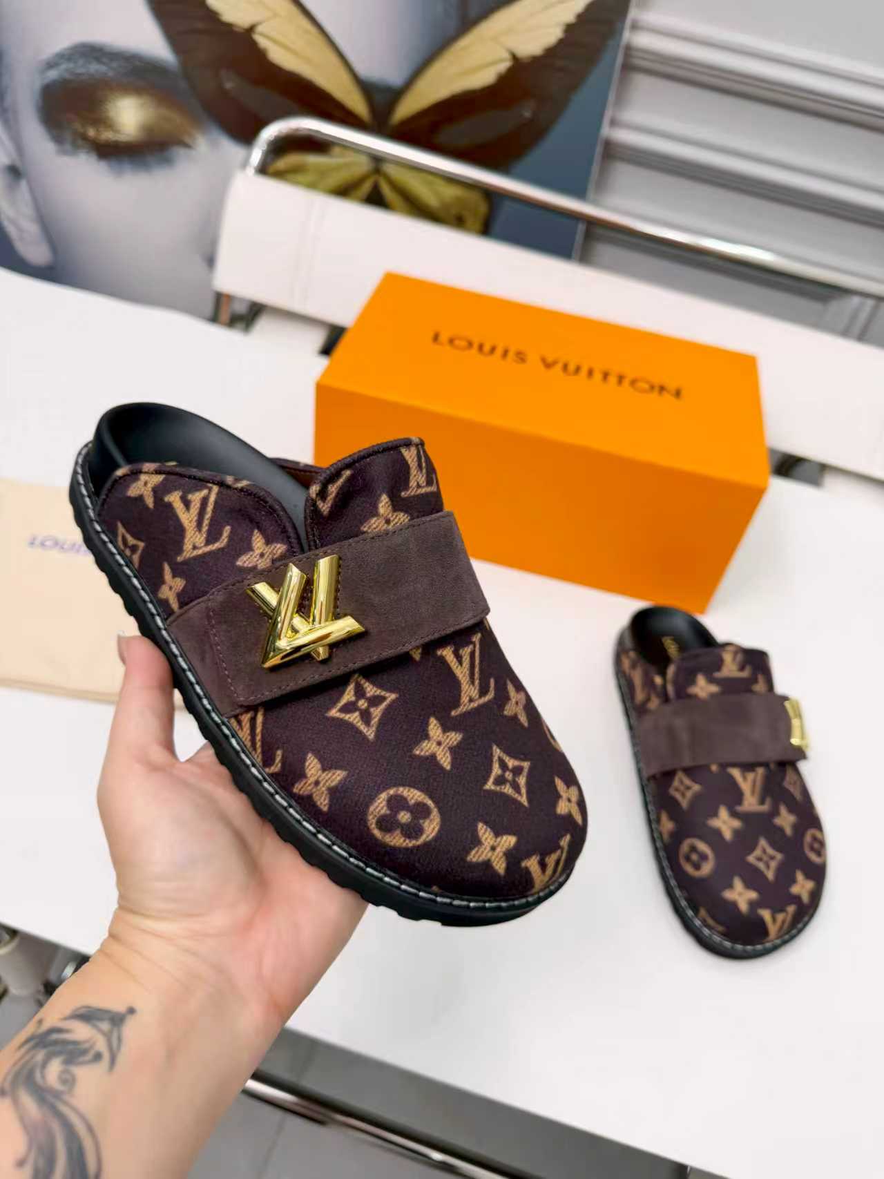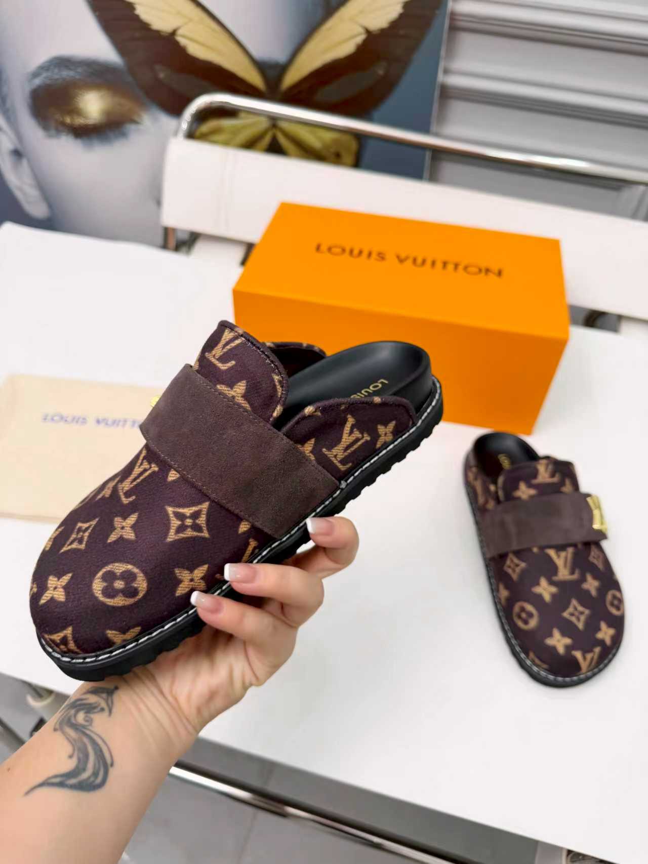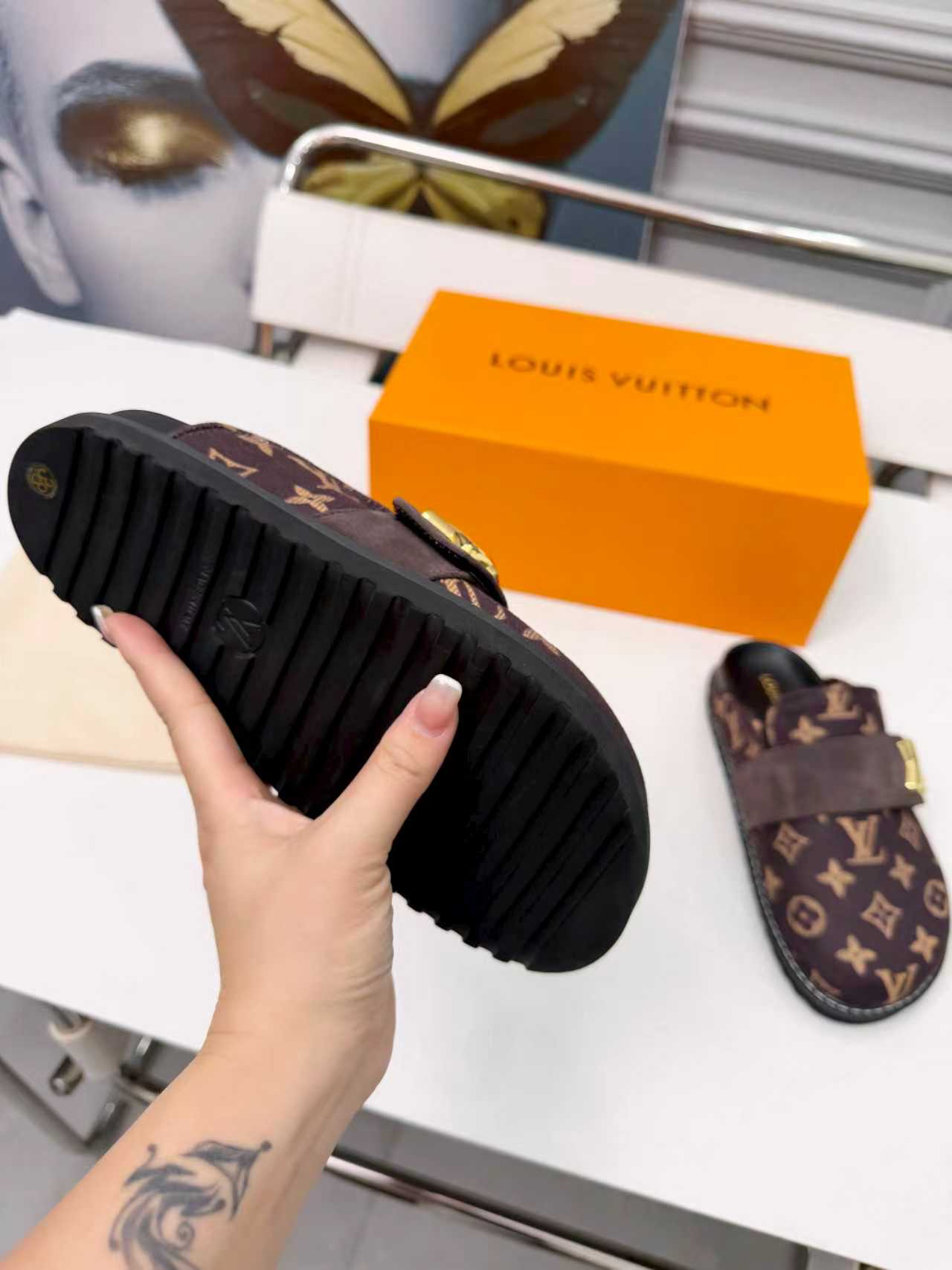 这款鞋子是AAAAA 1:1 质量 (非常棒). 使用了和原版一模一样的材料. 商标部分也保持了和路易威登/Louis Vuitton一样. 图片拍摄是实物鞋子拍摄, 您所收到的实物保证和我们图片一模一样.