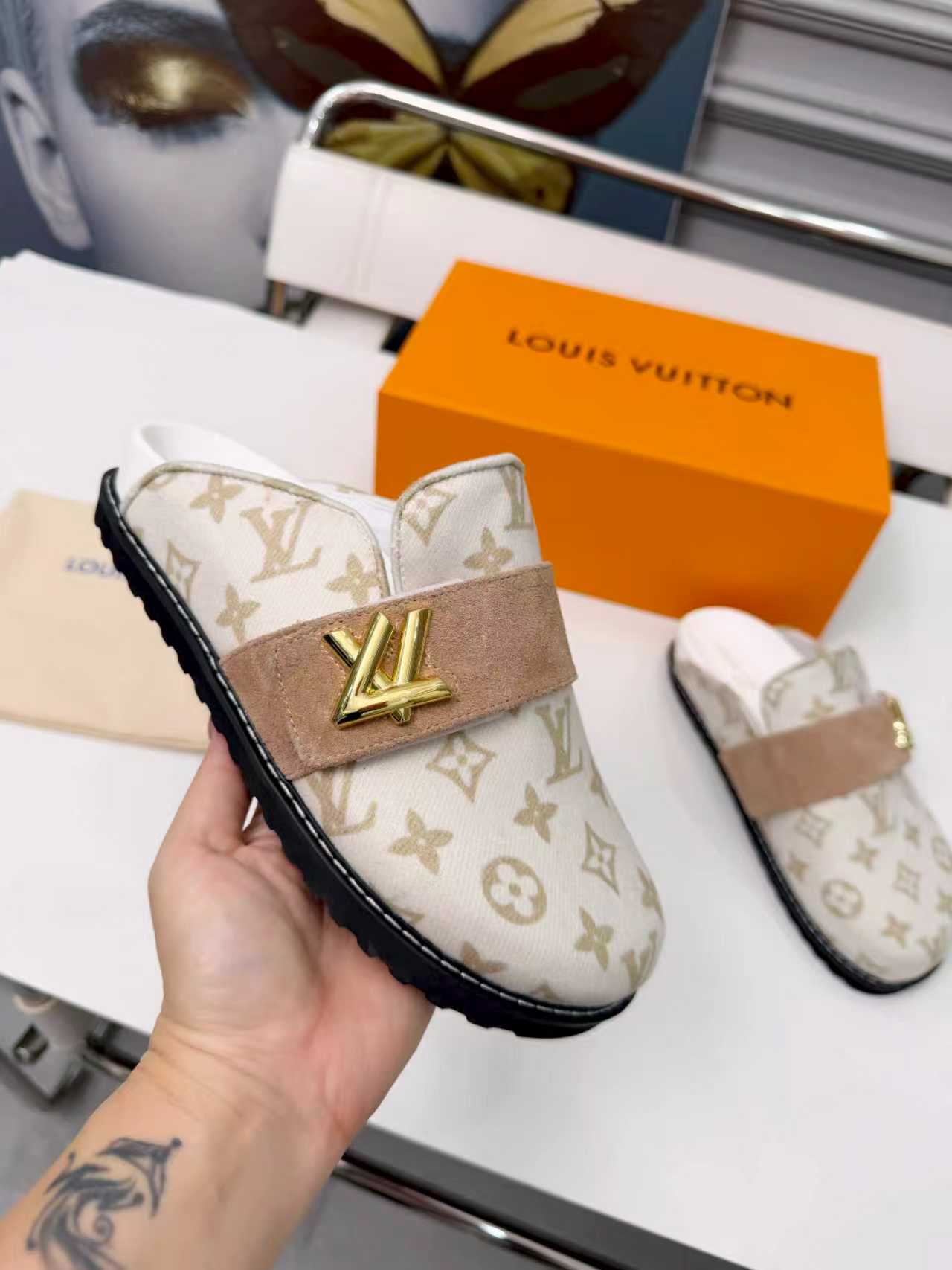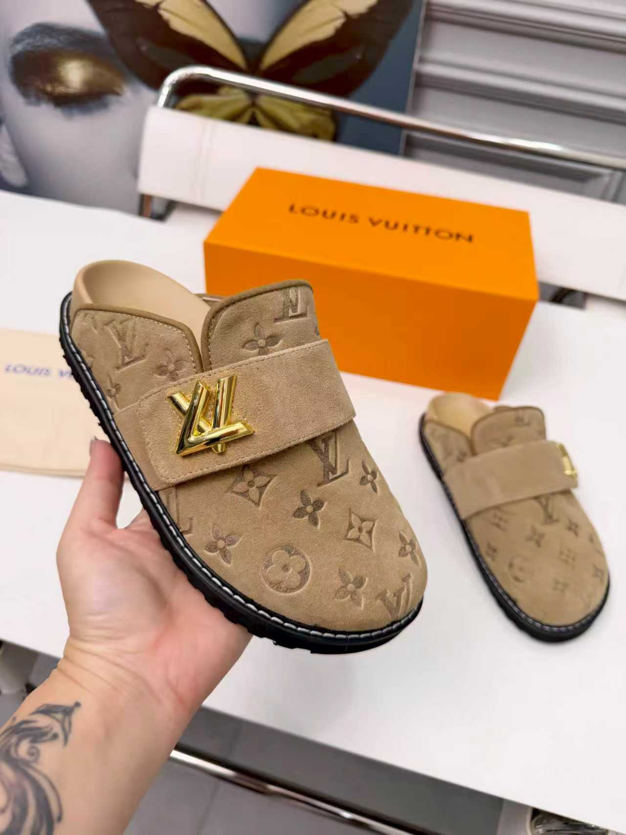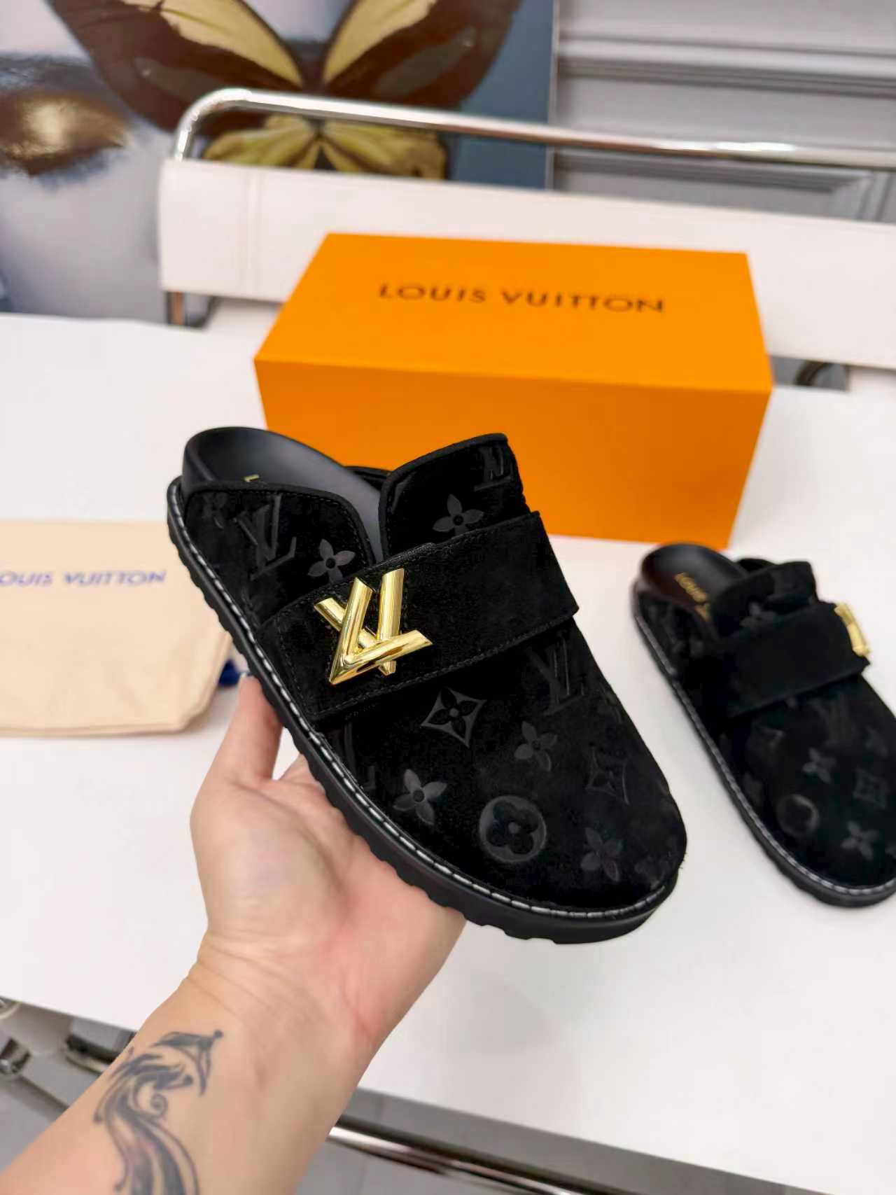这款鞋子是AAAAA 1:1 质量 (非常棒). 使用了和原版一模一样的材料. 商标部分也保持了和路易威登/Louis Vuitton一样. 图片拍摄是实物鞋子拍摄, 您所收到的实物保证和我们图片一模一样.