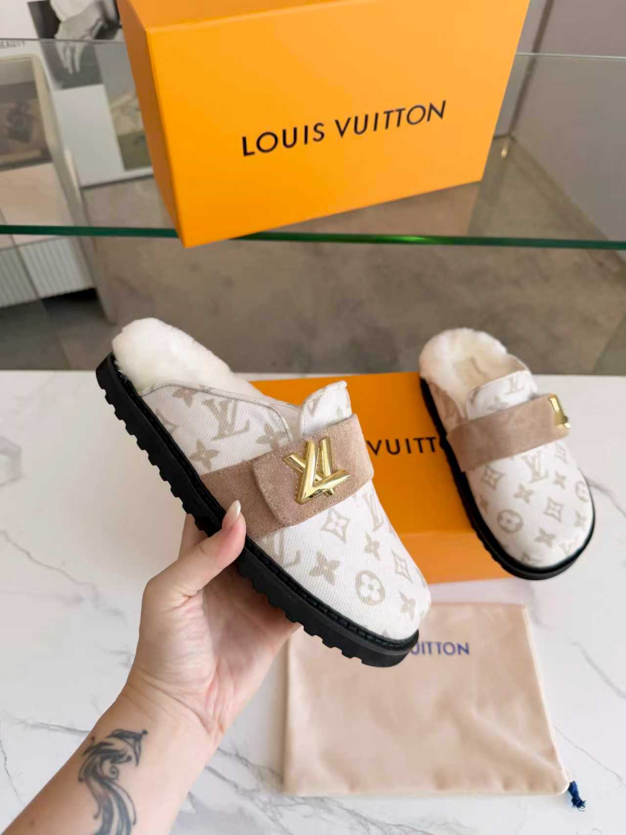 这款鞋子是AAAAA 1:1 质量 (非常棒). 使用了和原版一模一样的材料. 商标部分也保持了和路易威登/Louis Vuitton一样. 图片拍摄是实物鞋子拍摄, 您所收到的实物保证和我们图片一模一样.