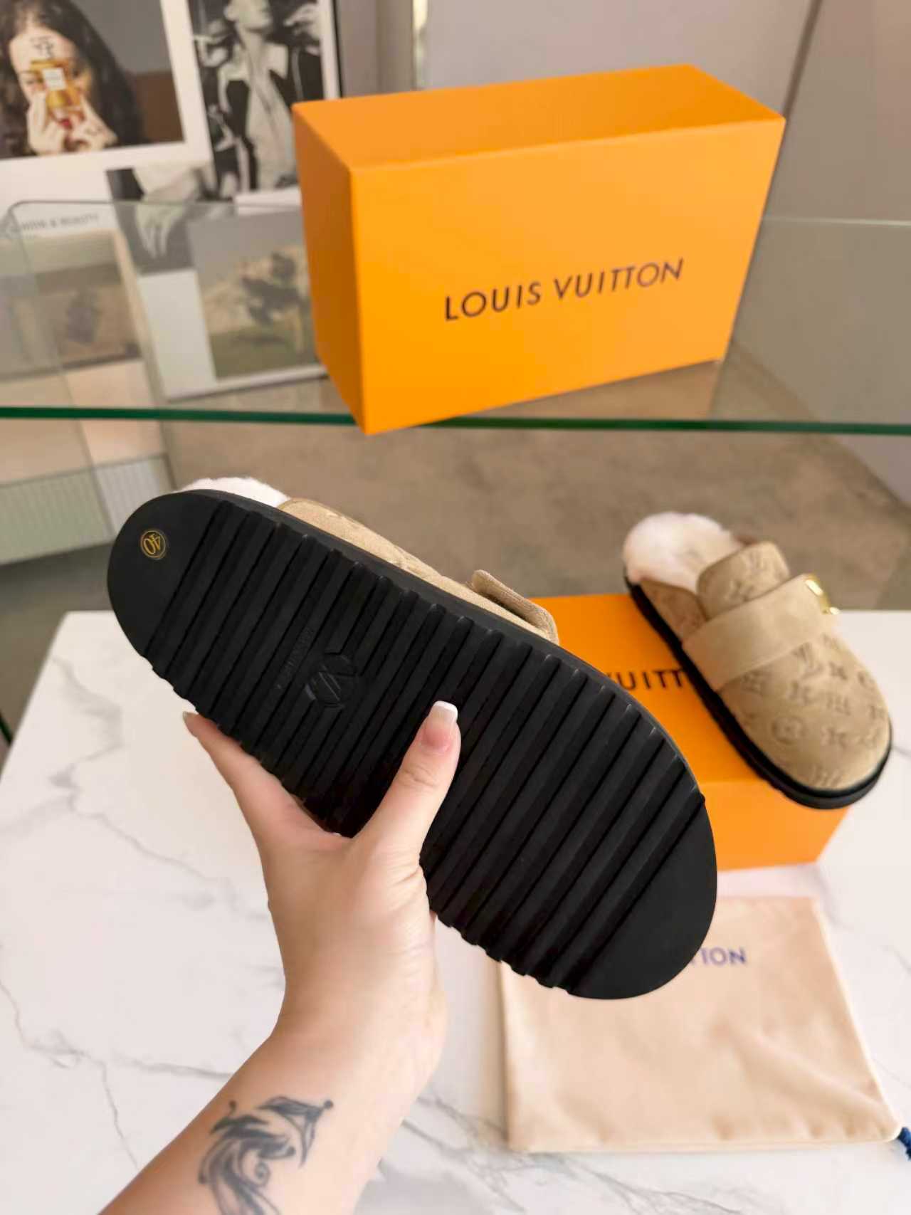 这款鞋子是AAAAA 1:1 质量 (非常棒). 使用了和原版一模一样的材料. 商标部分也保持了和路易威登/Louis Vuitton一样. 图片拍摄是实物鞋子拍摄, 您所收到的实物保证和我们图片一模一样.