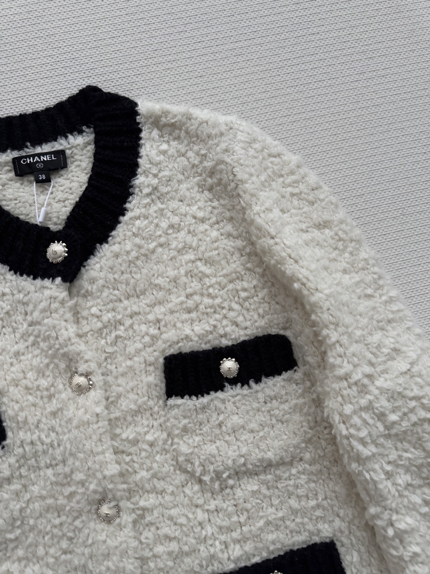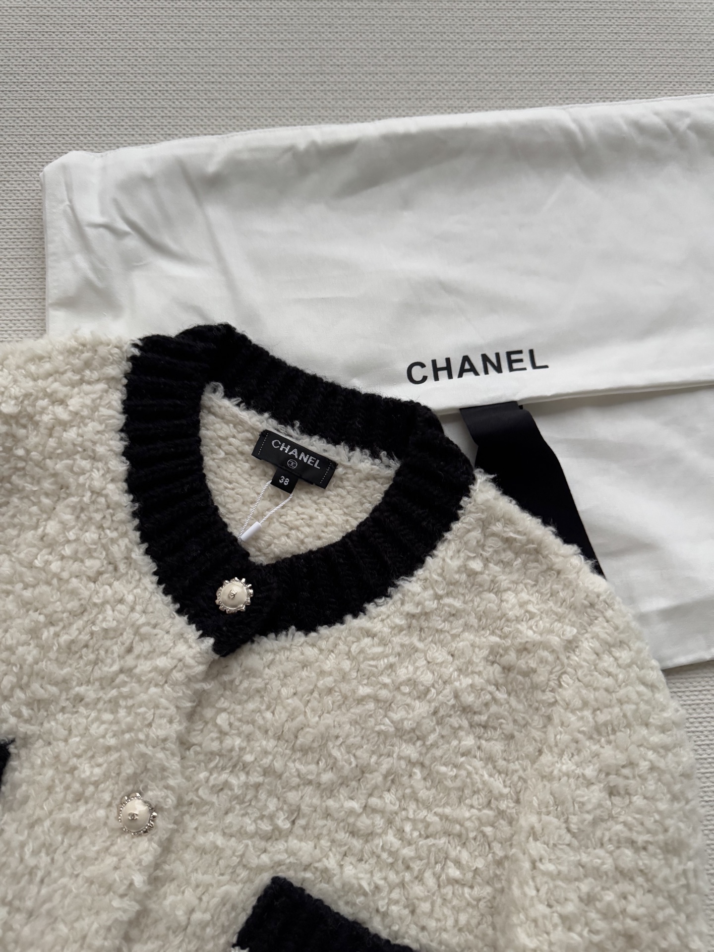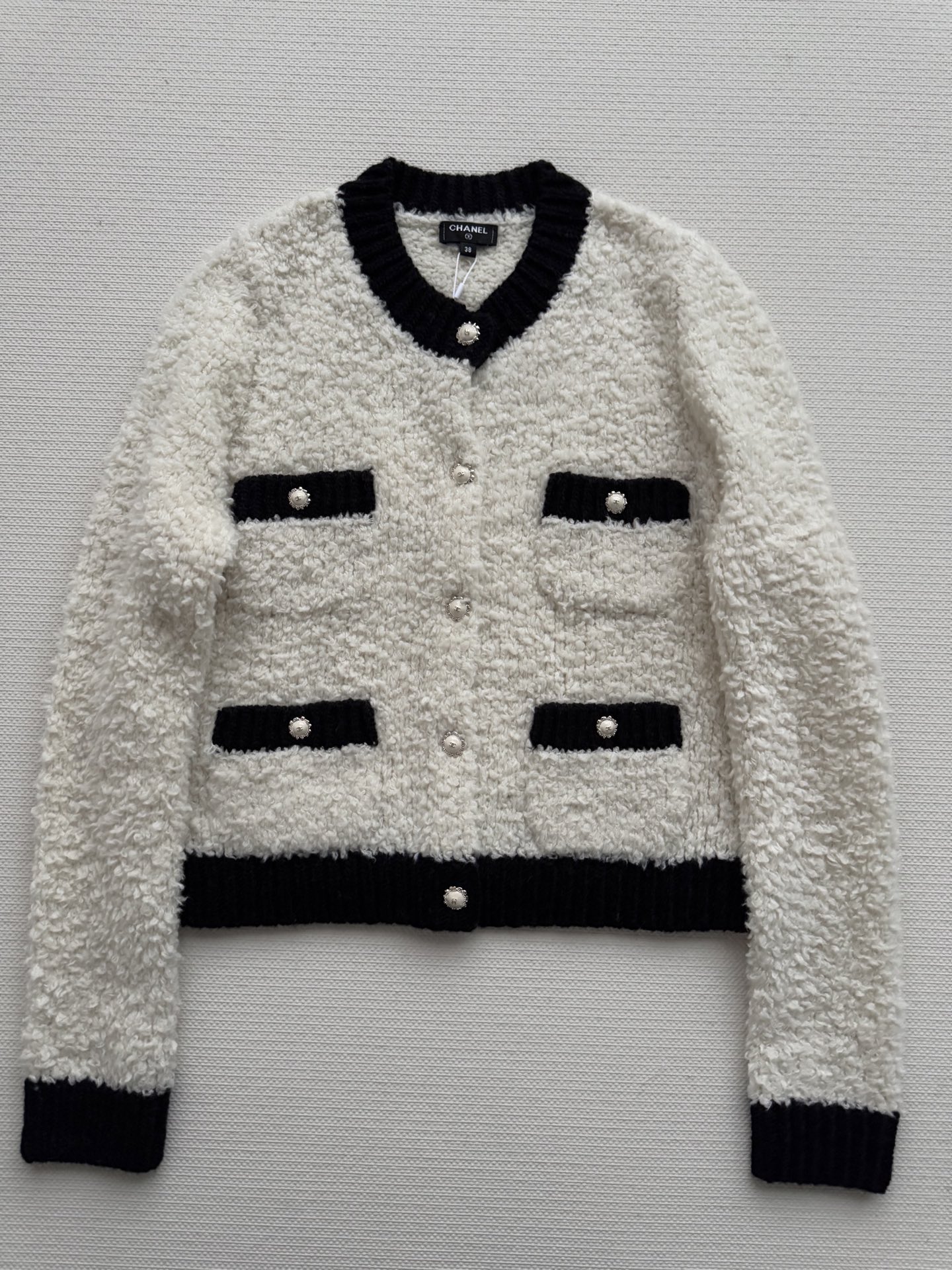 这款衣服是AAAAA 1:1 质量 (非常棒). 使用了和原版一模一样的材料. 商标部分也保持了和香奈儿/Chanel一样. 图片拍摄是实物衣服拍摄, 您所收到的实物保证和我们图片一模一样.