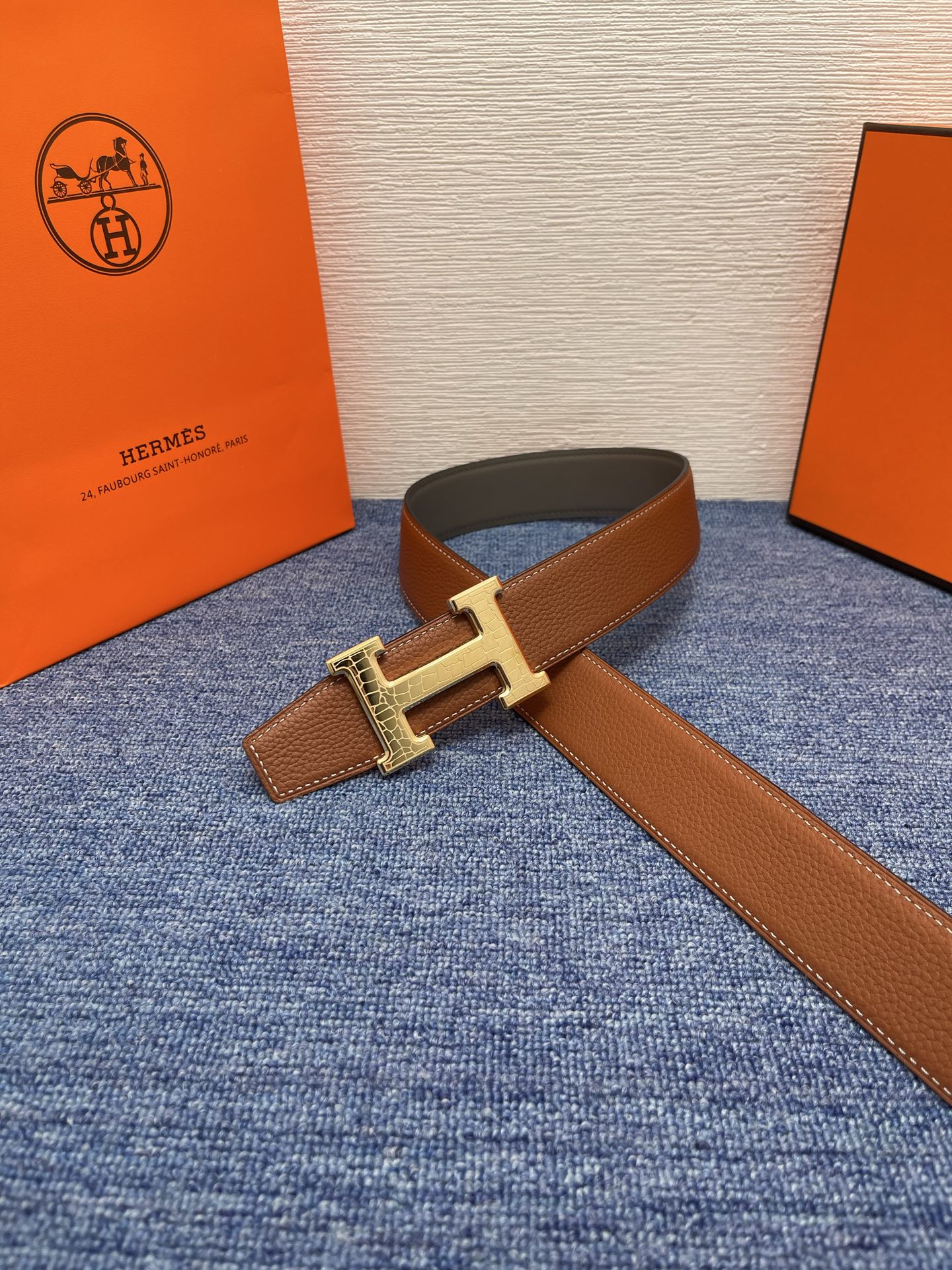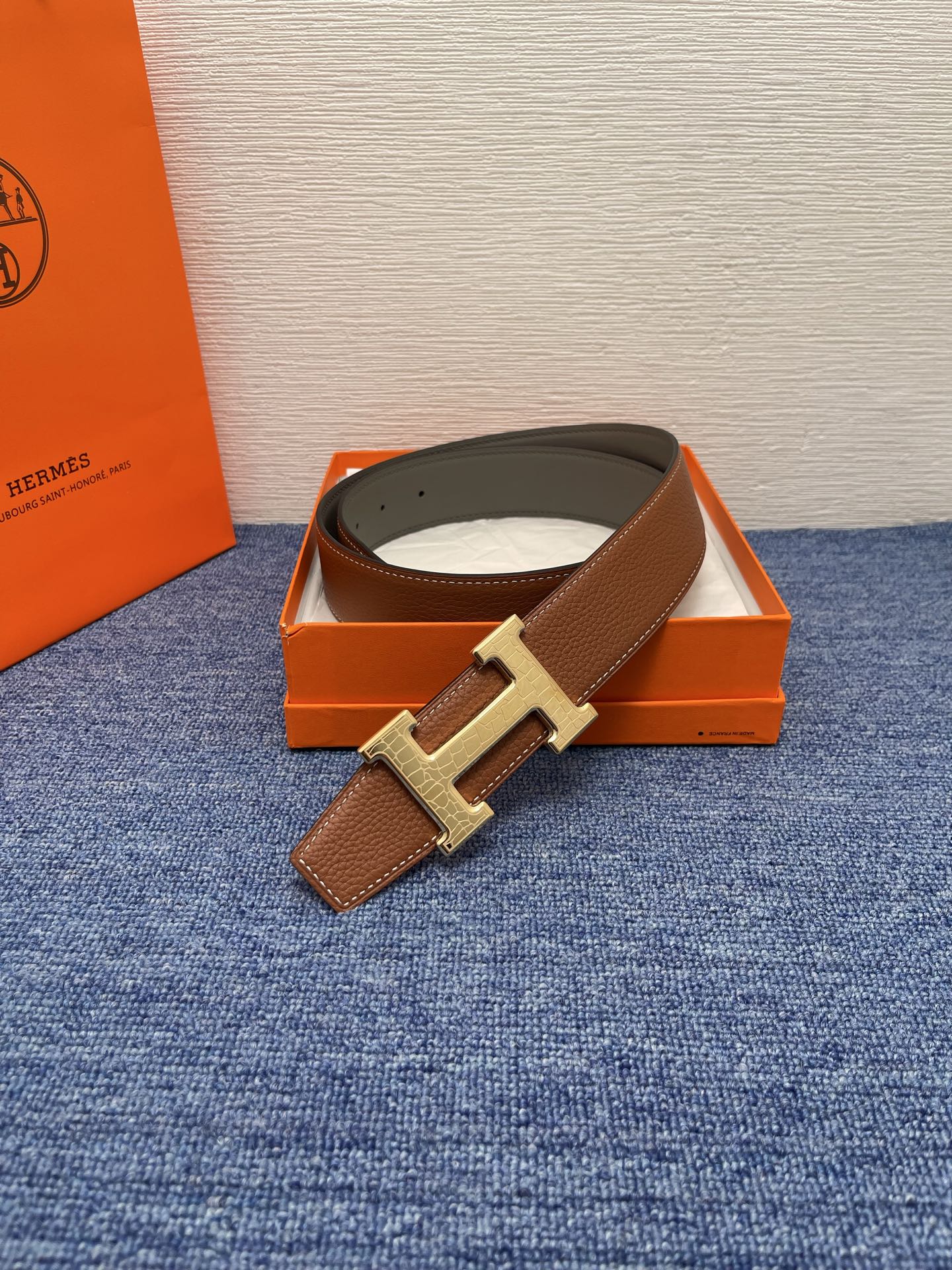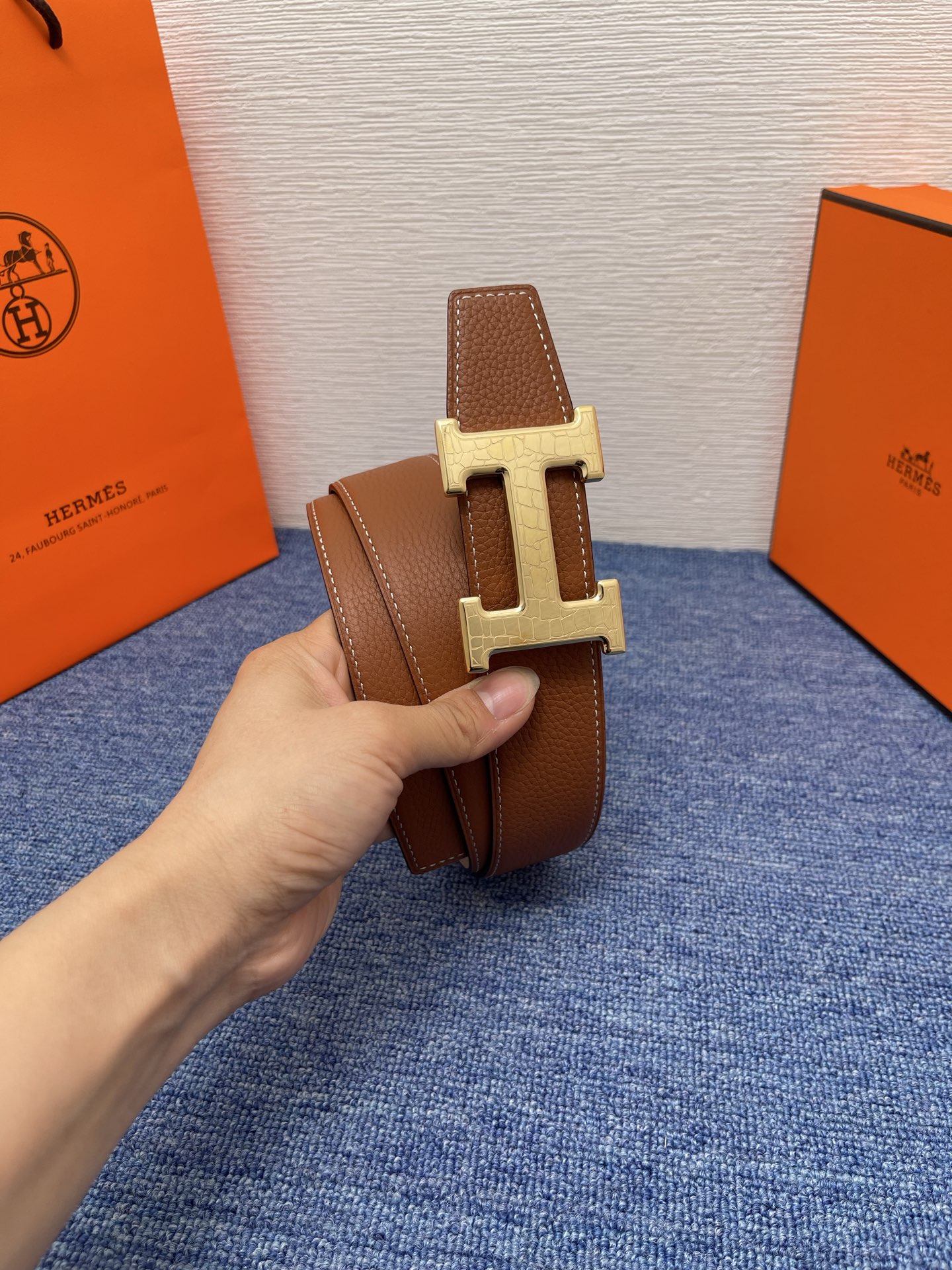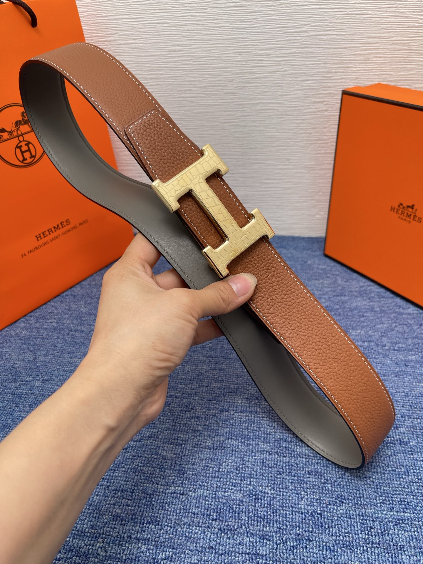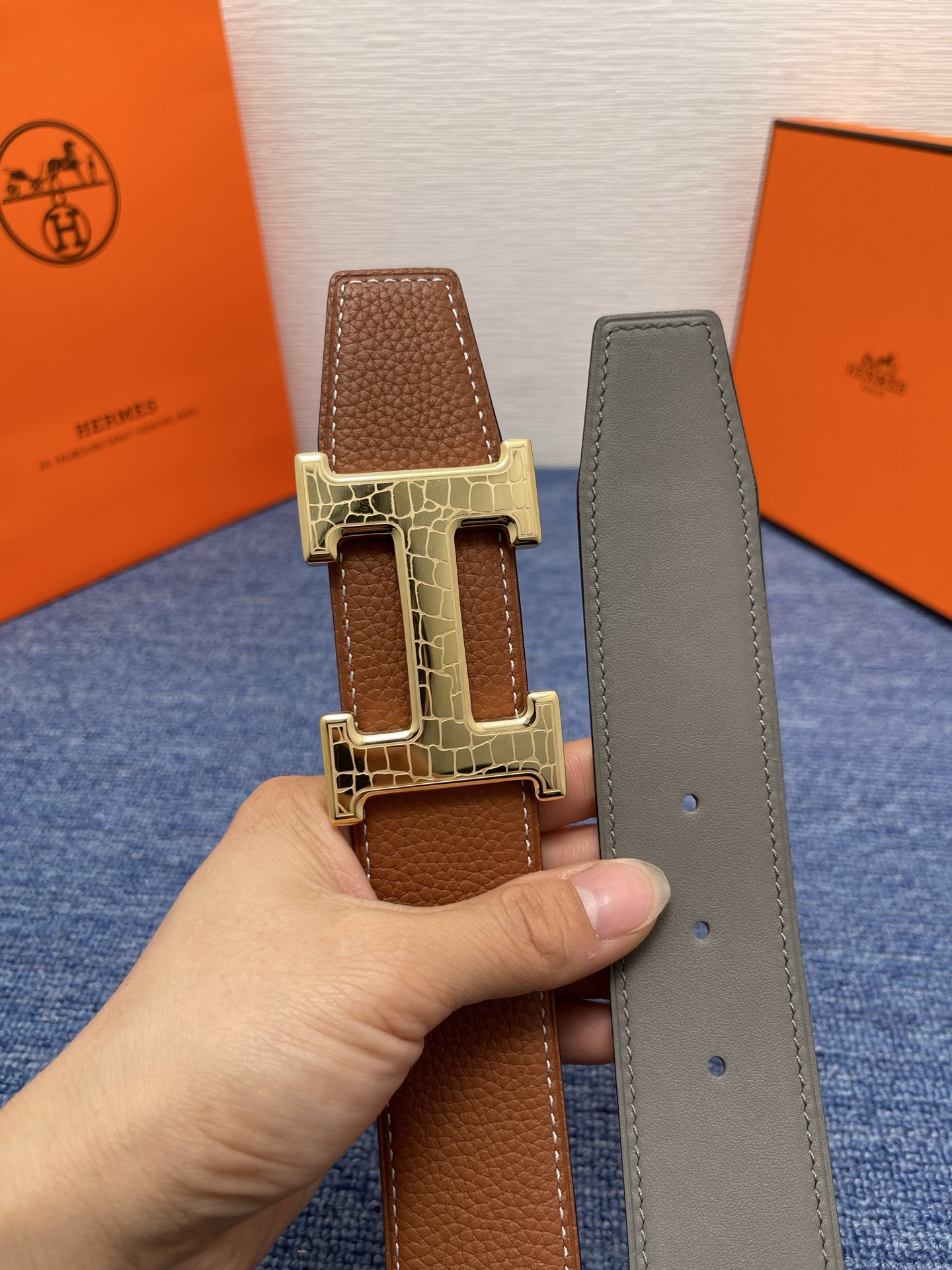 这款皮带是AAAAA 1:1 质量 (非常棒). 使用了和原版一模一样的材料. 商标部分也保持了和爱马仕/Hermes一样. 图片拍摄是实物皮带拍摄, 您所收到的实物保证和我们图片一模一样.