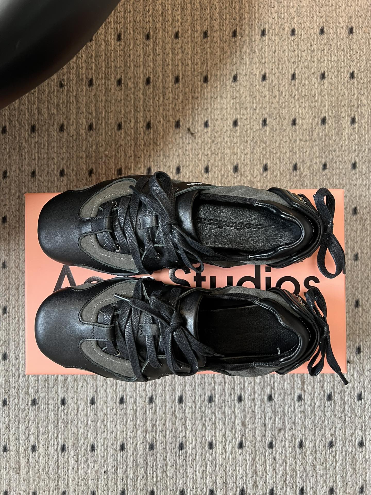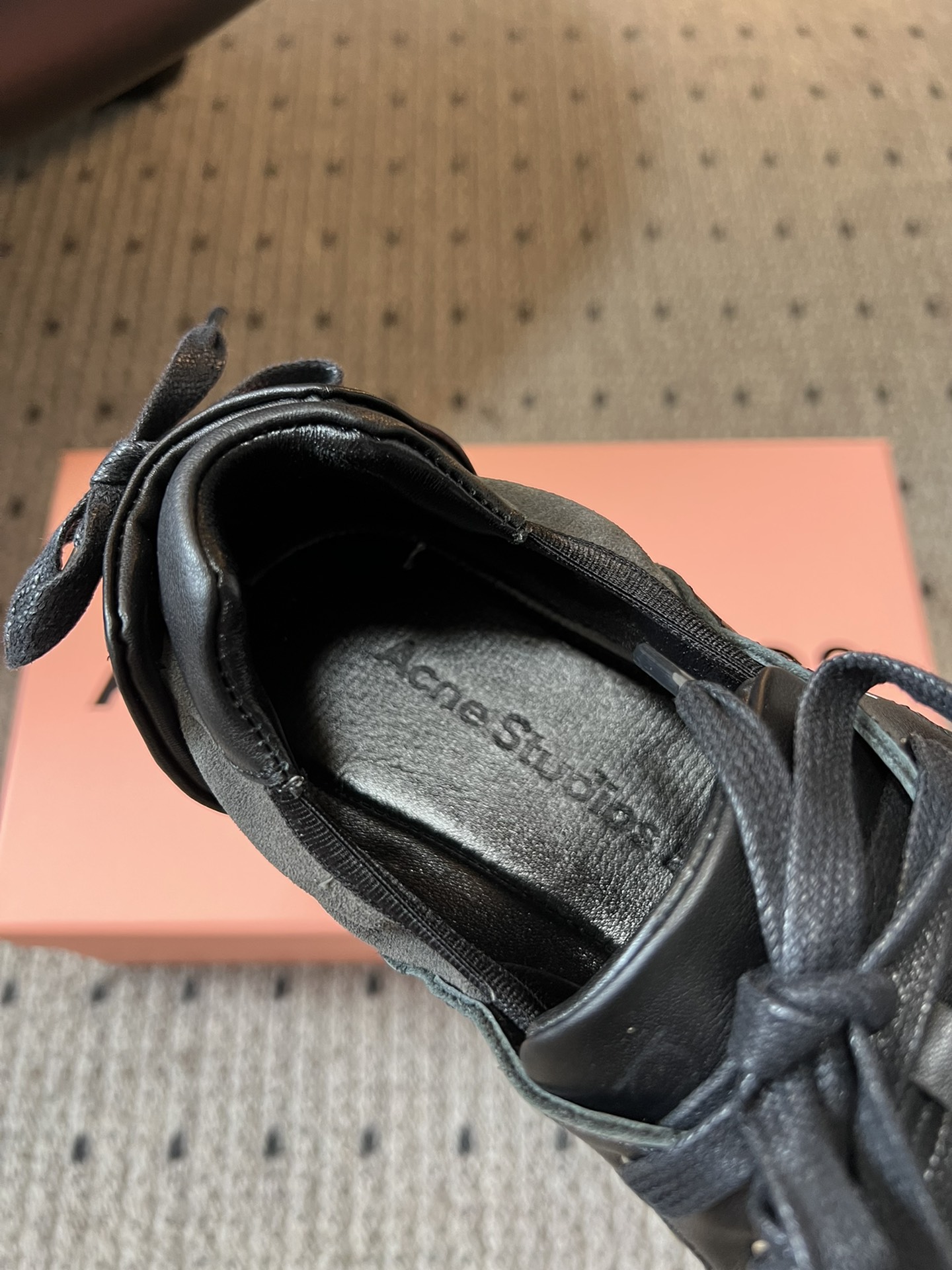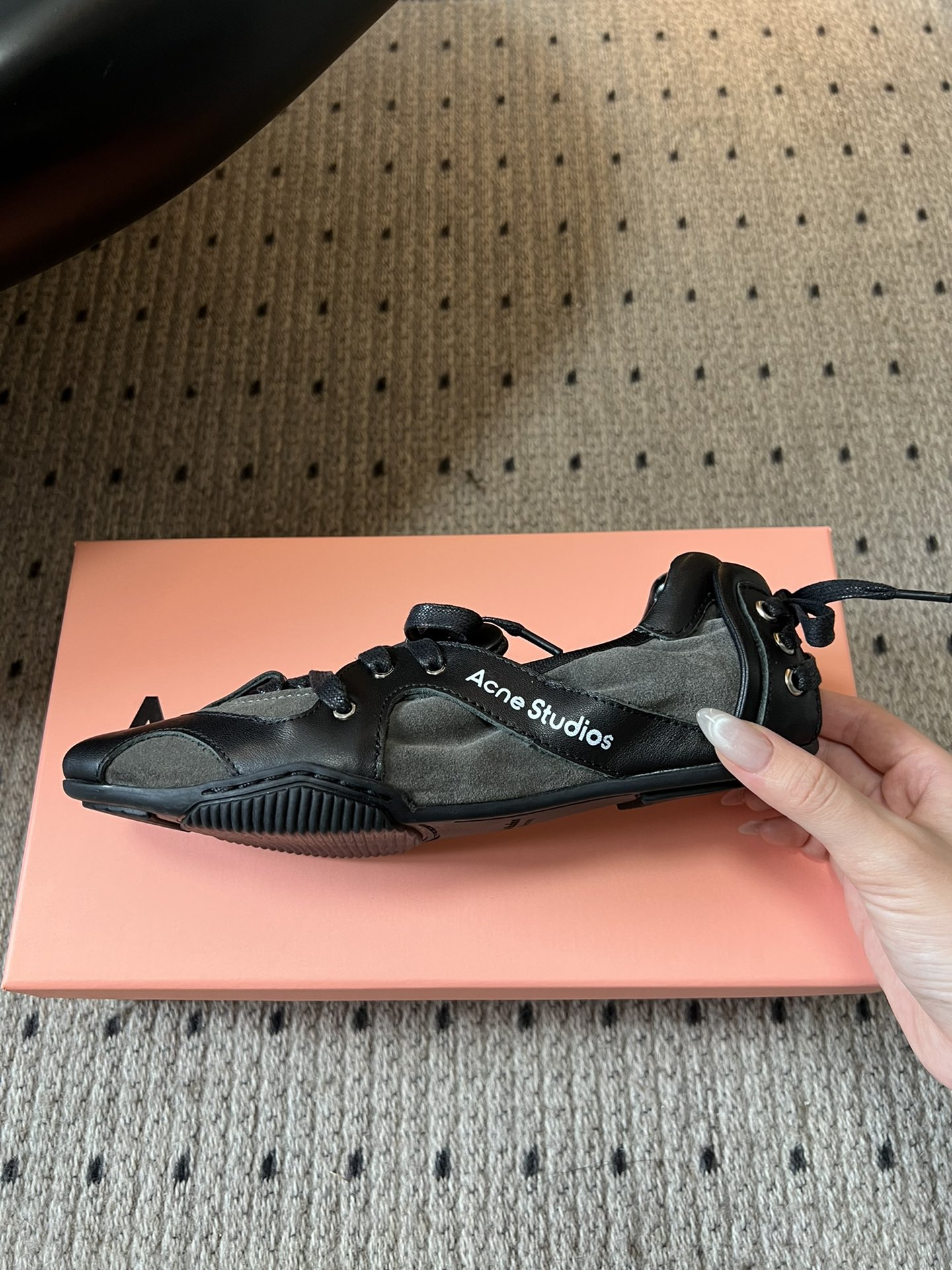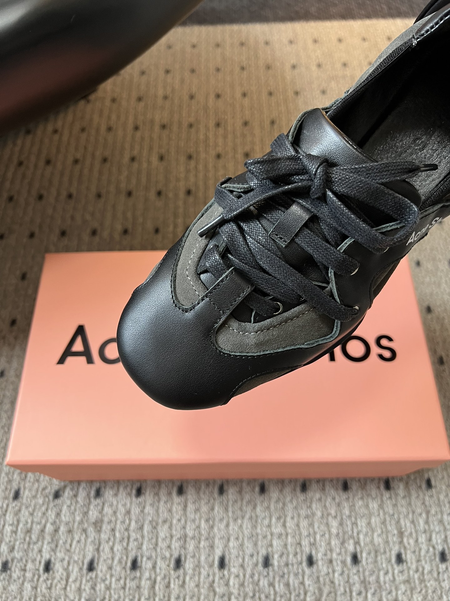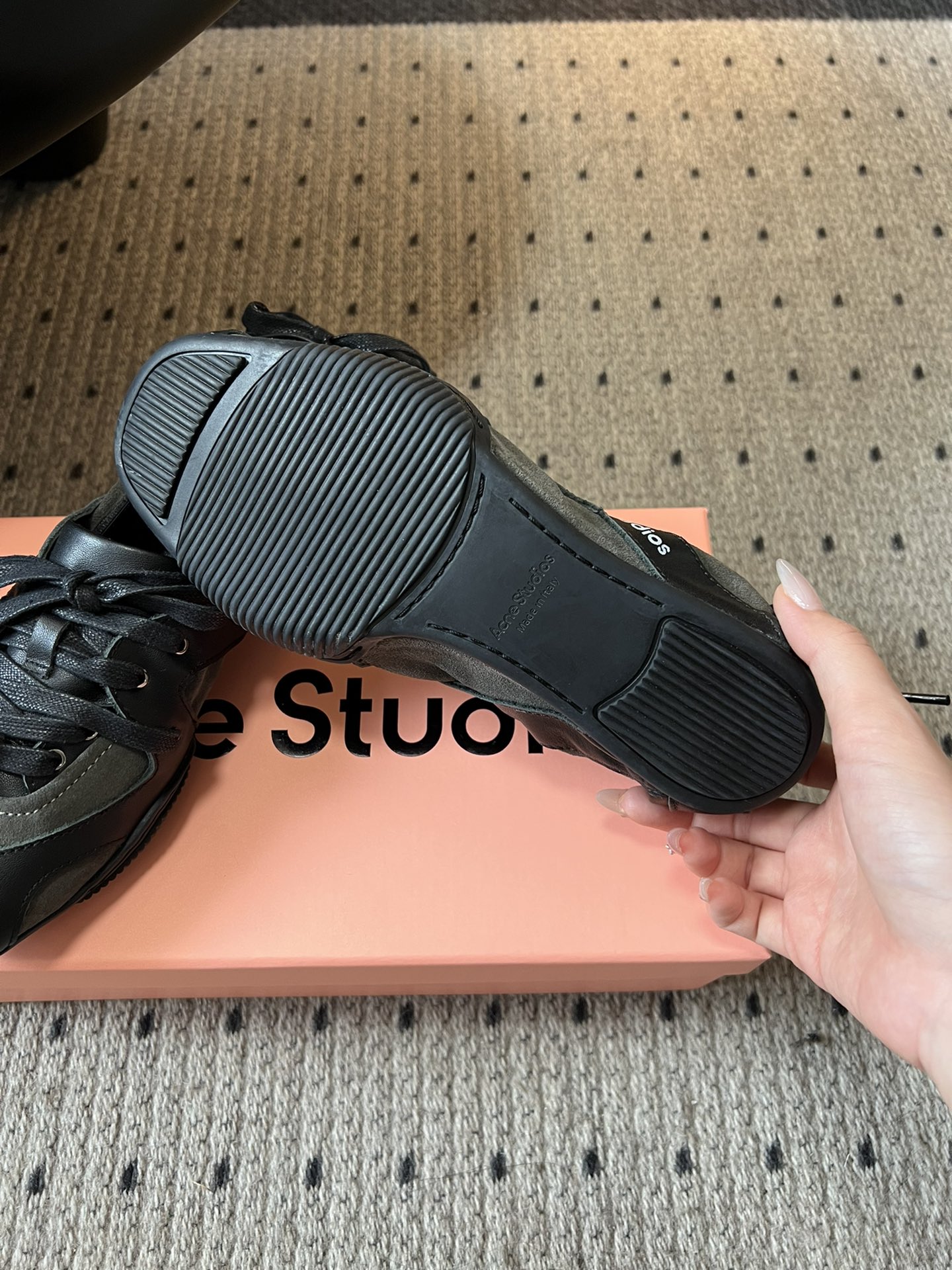这款鞋子是AAAAA 1:1 质量 (非常棒). 使用了和原版一模一样的材料. 商标部分也保持了和Acne一样. 图片拍摄是实物鞋子拍摄, 您所收到的实物保证和我们图片一模一样.