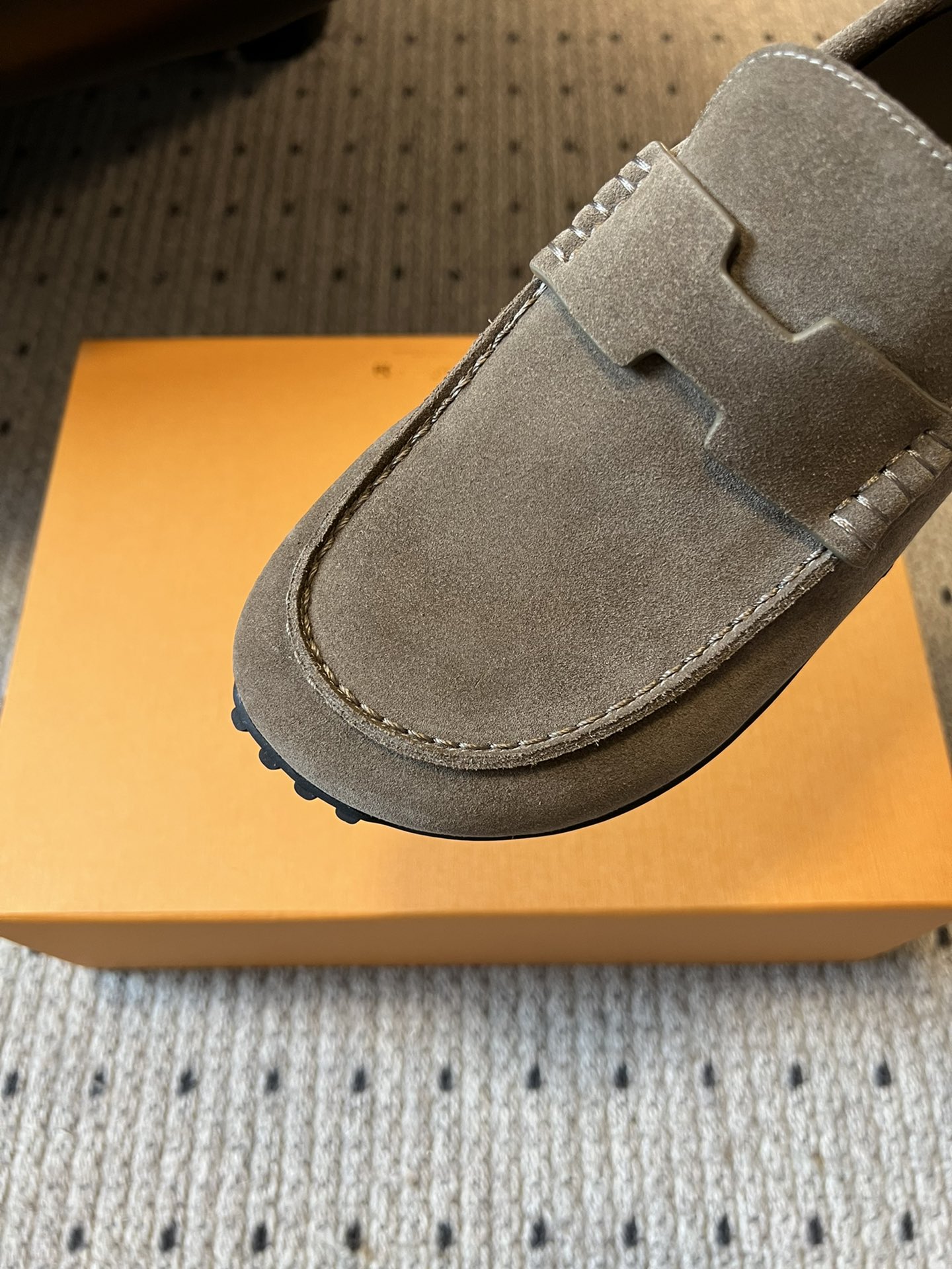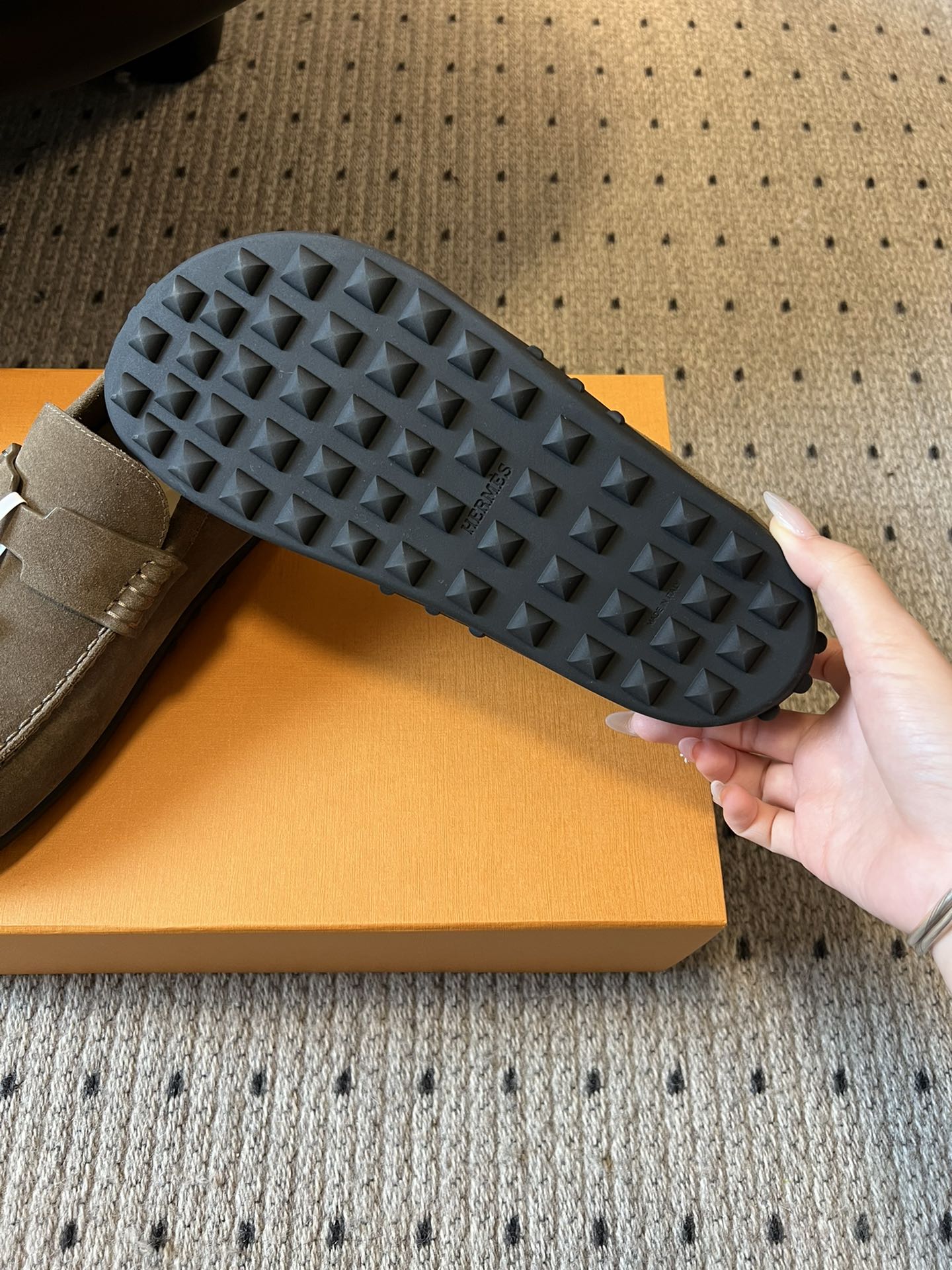 这款鞋子是AAAAA 1:1 质量 (非常棒). 使用了和原版一模一样的材料. 商标部分也保持了和爱马仕/Hermes一样. 图片拍摄是实物鞋子拍摄, 您所收到的实物保证和我们图片一模一样.