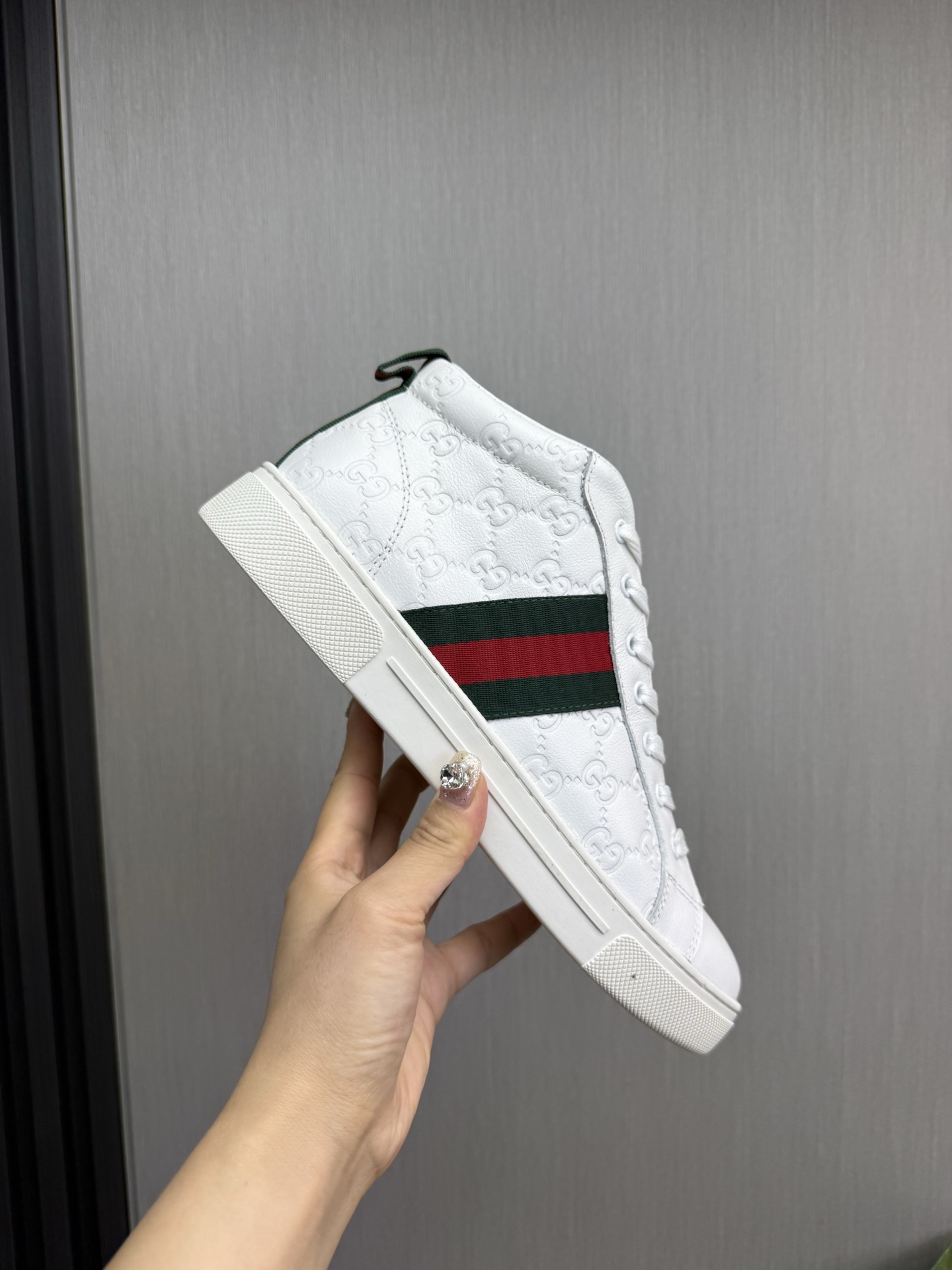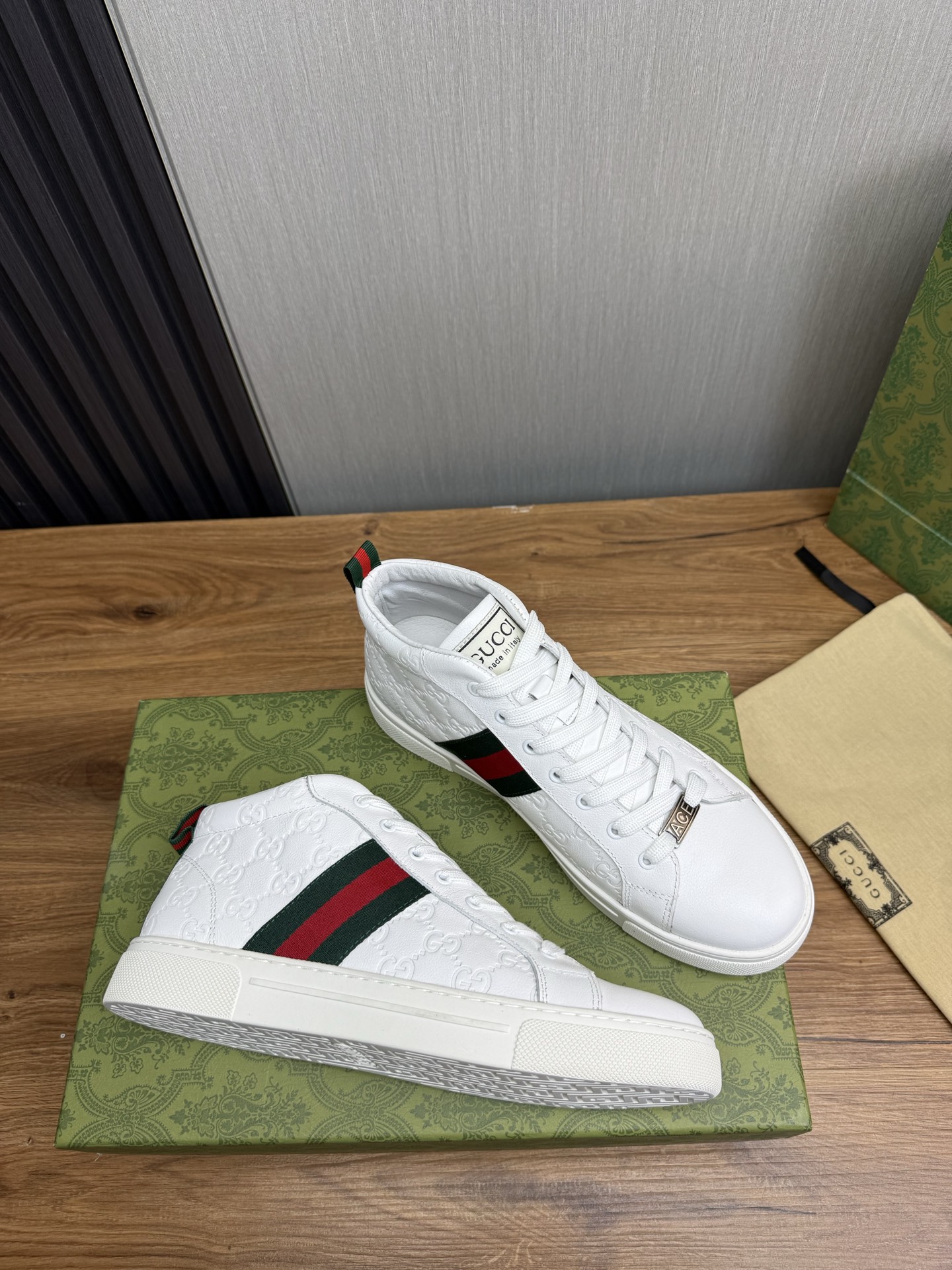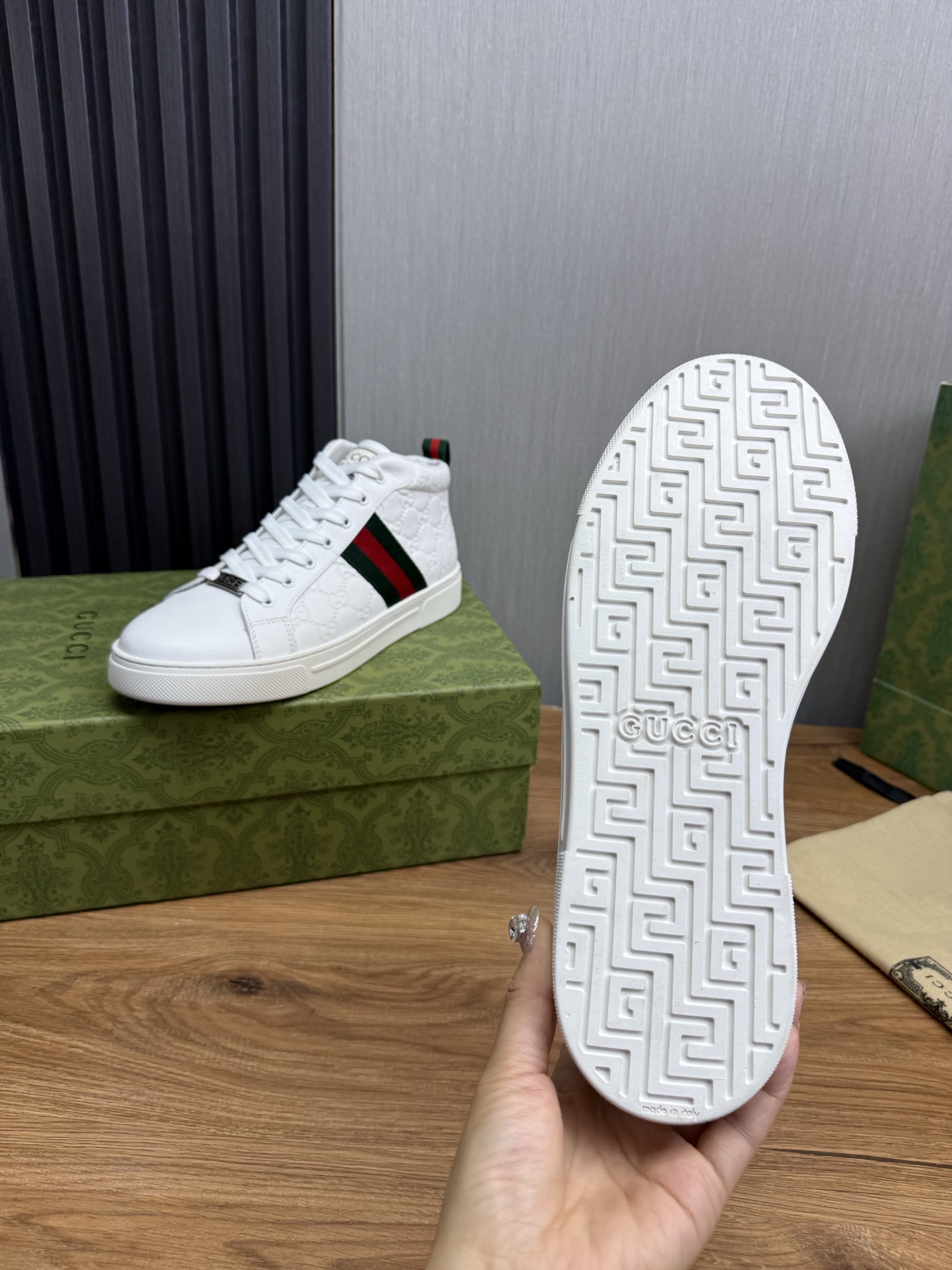 这款鞋子是AAAAA 1:1 质量 (非常棒). 使用了和原版一模一样的材料. 商标部分也保持了和古奇/Gucci一样. 图片拍摄是实物鞋子拍摄, 您所收到的实物保证和我们图片一模一样.
