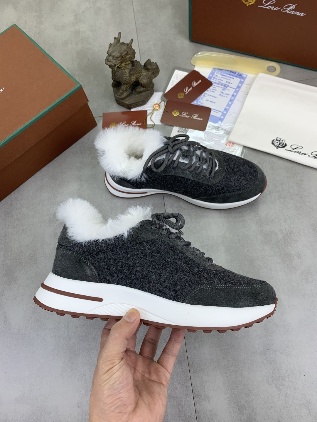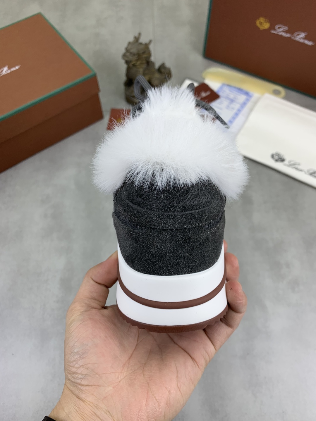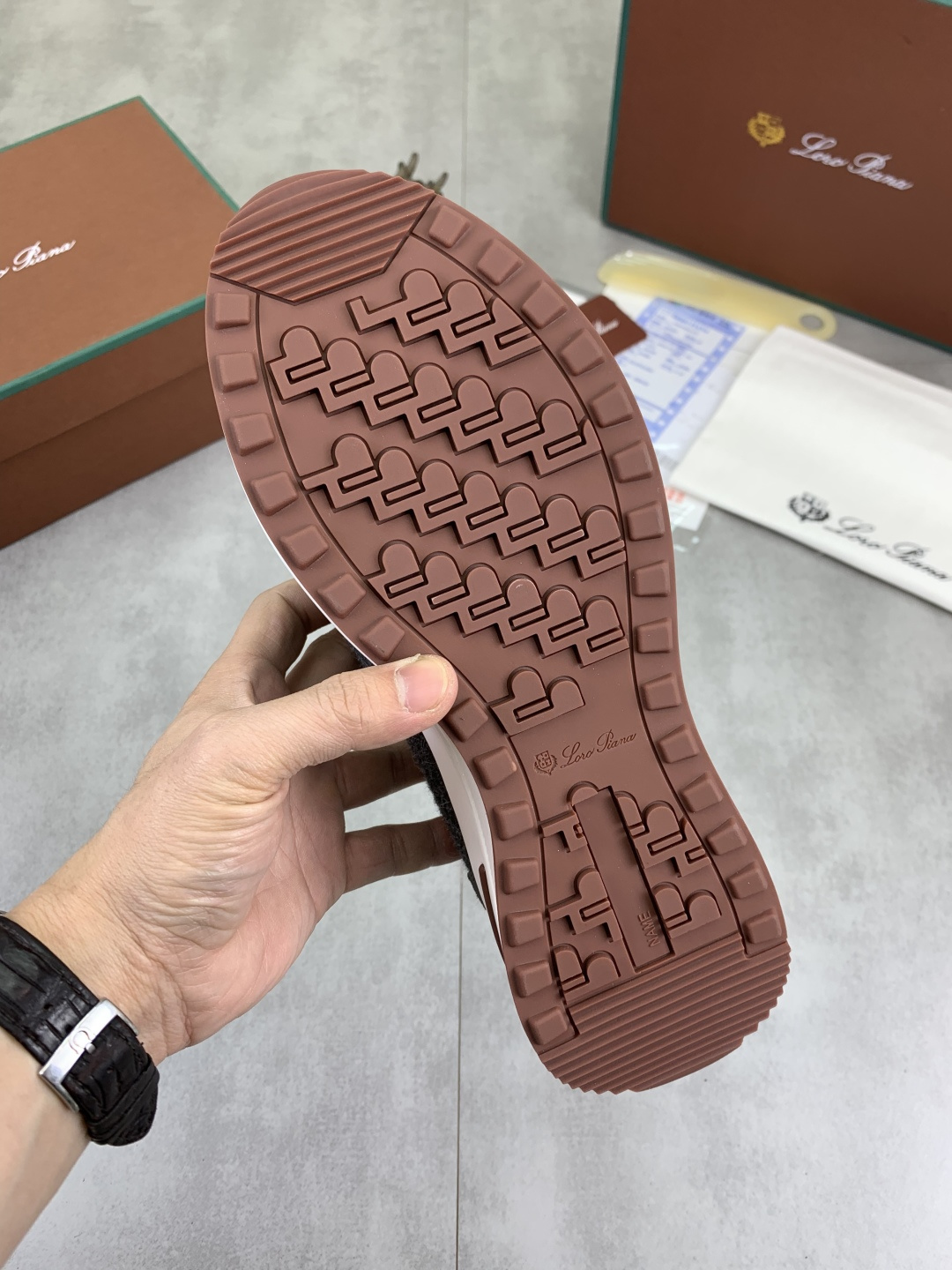 这款鞋子是AAAAA 1:1 质量 (非常棒). 使用了和原版一模一样的材料. 商标部分也保持了和洛罗皮亚纳/Loro Piana一样. 图片拍摄是实物鞋子拍摄, 您所收到的实物保证和我们图片一模一样.