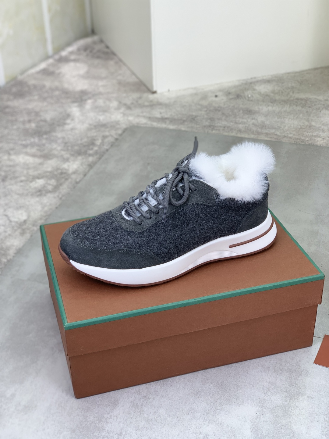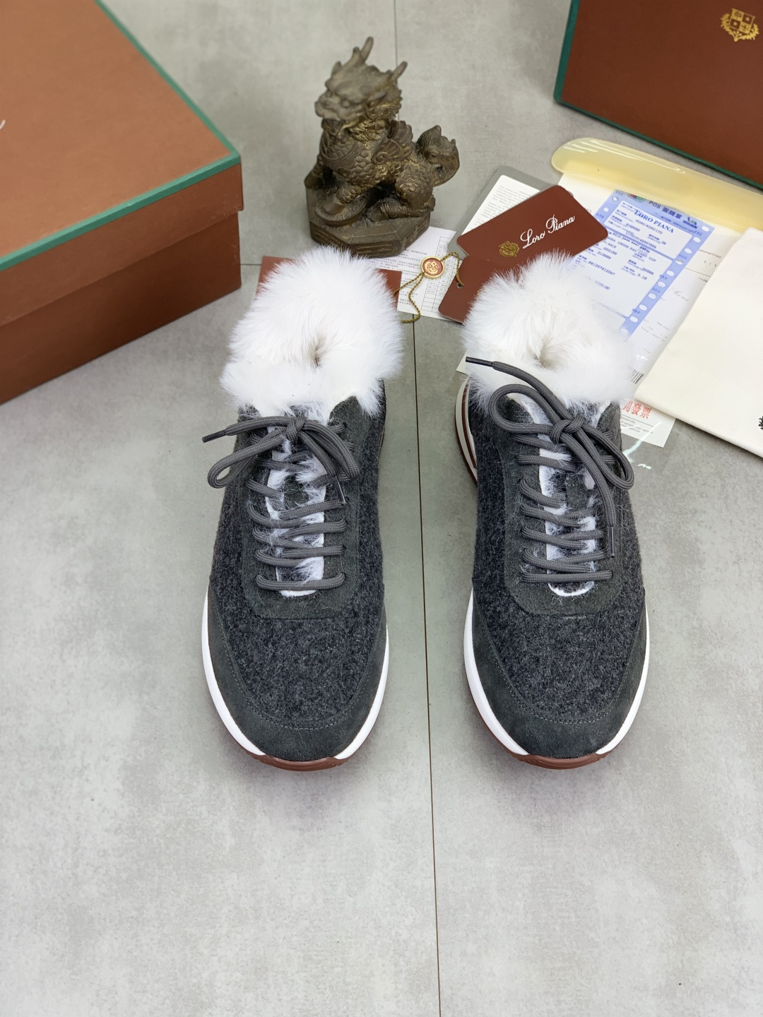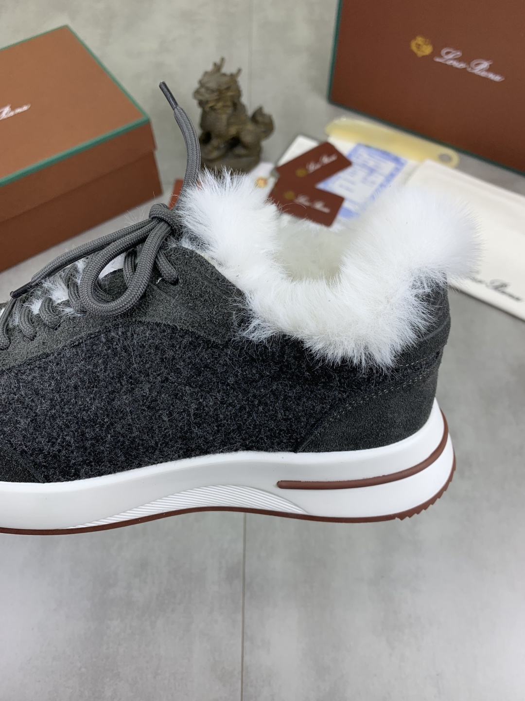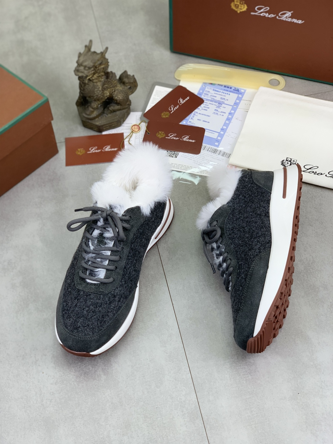 这款鞋子是AAAAA 1:1 质量 (非常棒). 使用了和原版一模一样的材料. 商标部分也保持了和洛罗皮亚纳/Loro Piana一样. 图片拍摄是实物鞋子拍摄, 您所收到的实物保证和我们图片一模一样.