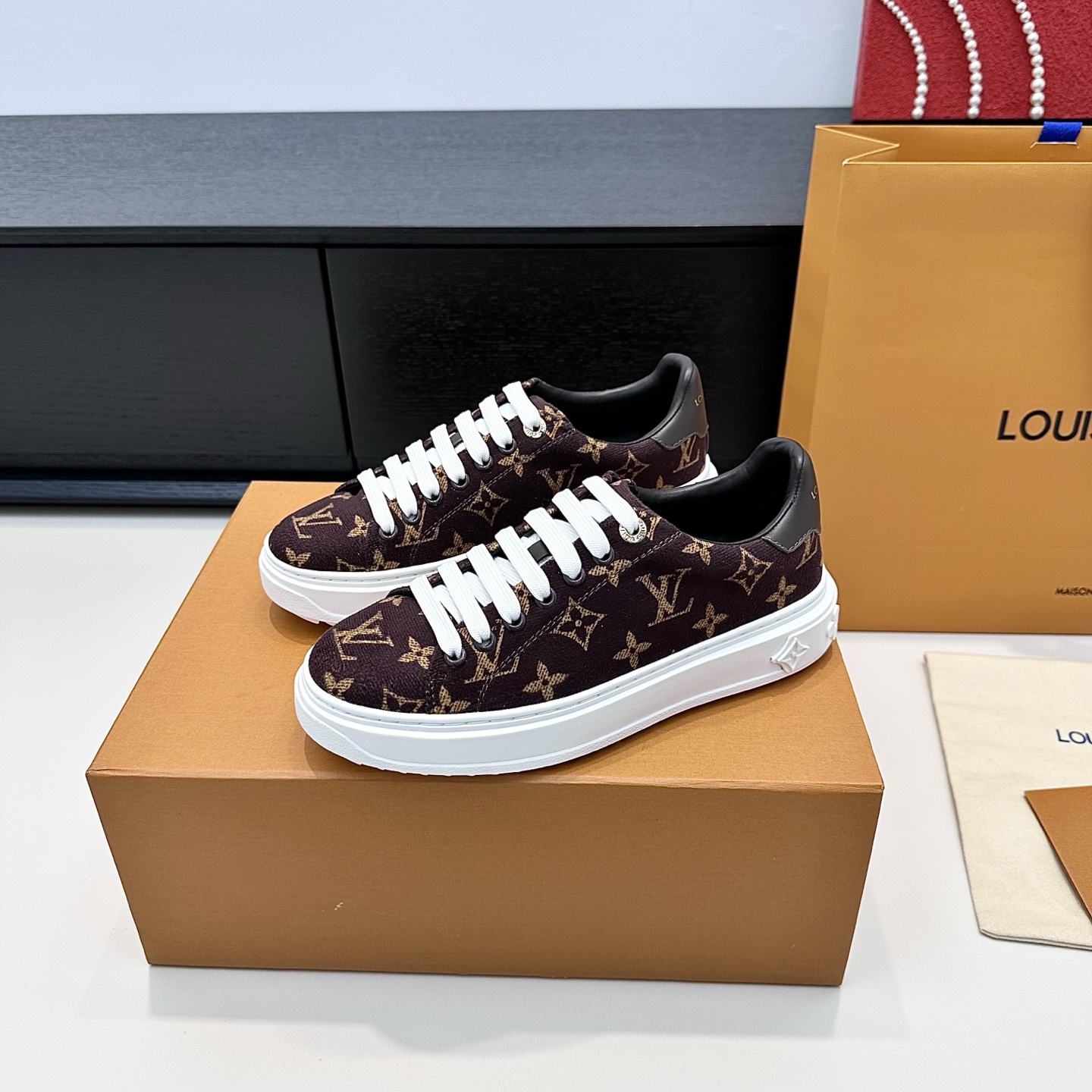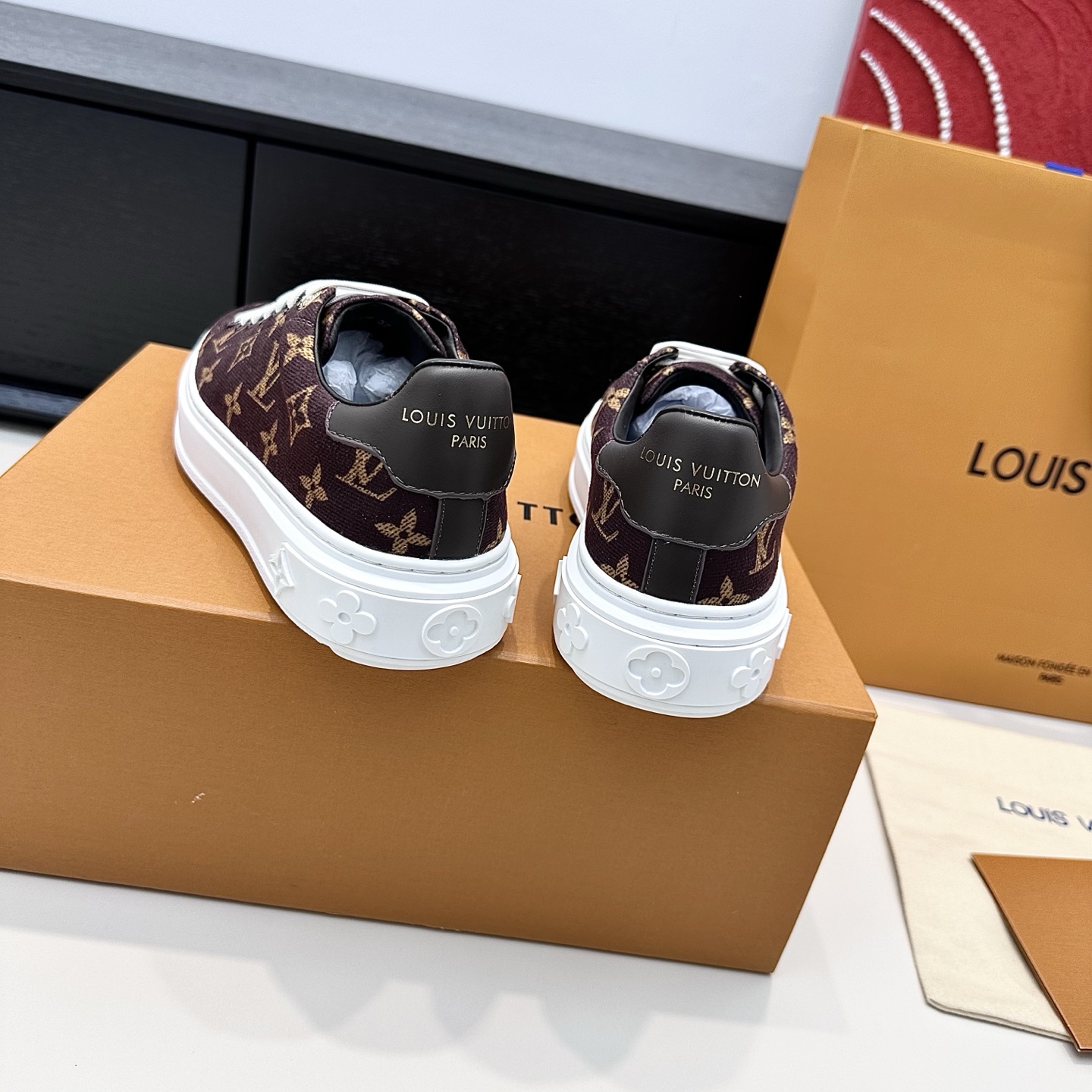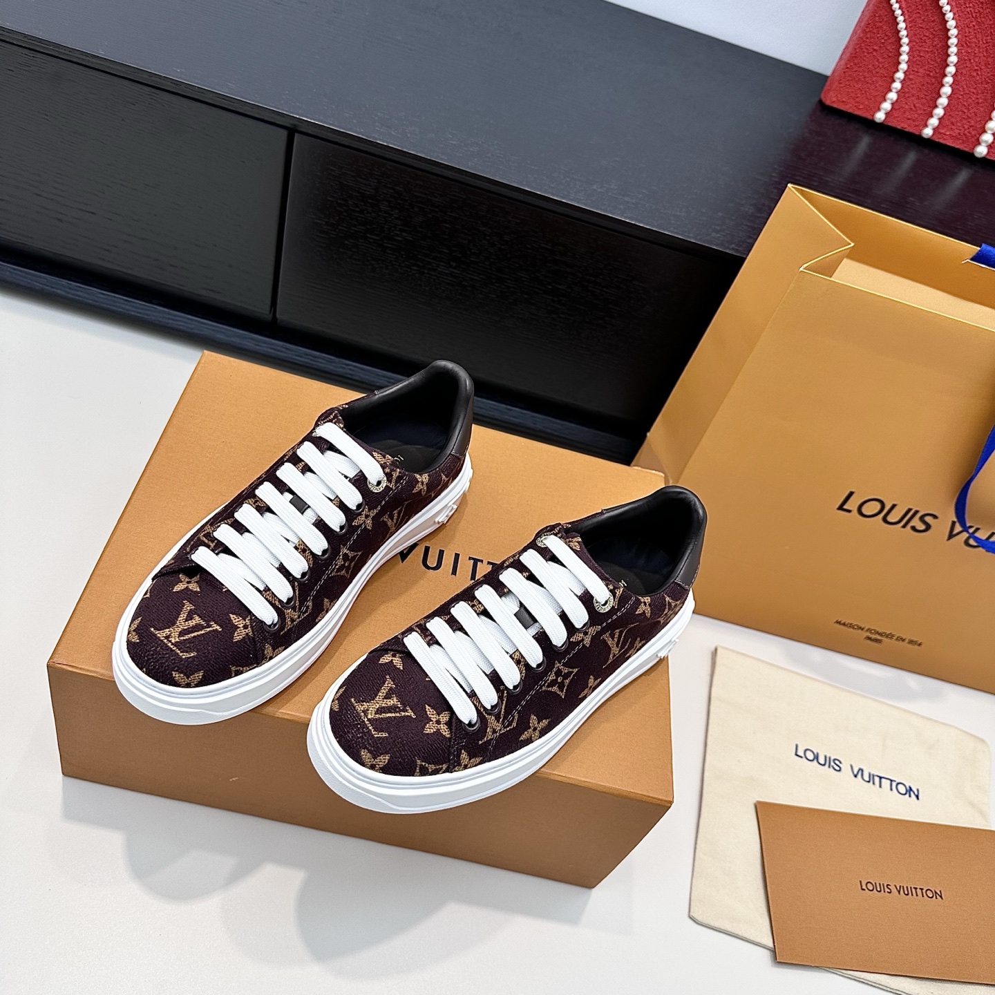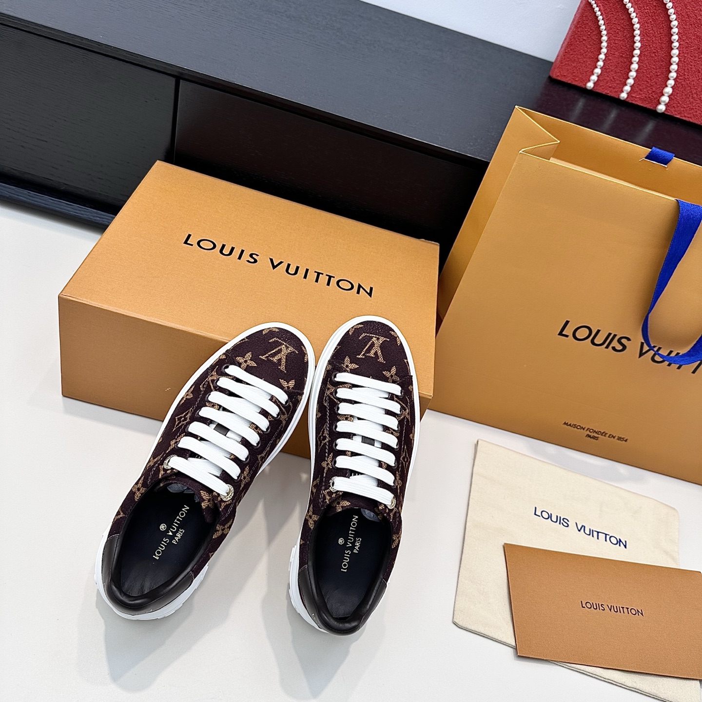 这款鞋子是AAAAA 1:1 质量 (非常棒). 使用了和原版一模一样的材料. 商标部分也保持了和路易威登/Louis Vuitton一样. 图片拍摄是实物鞋子拍摄, 您所收到的实物保证和我们图片一模一样.