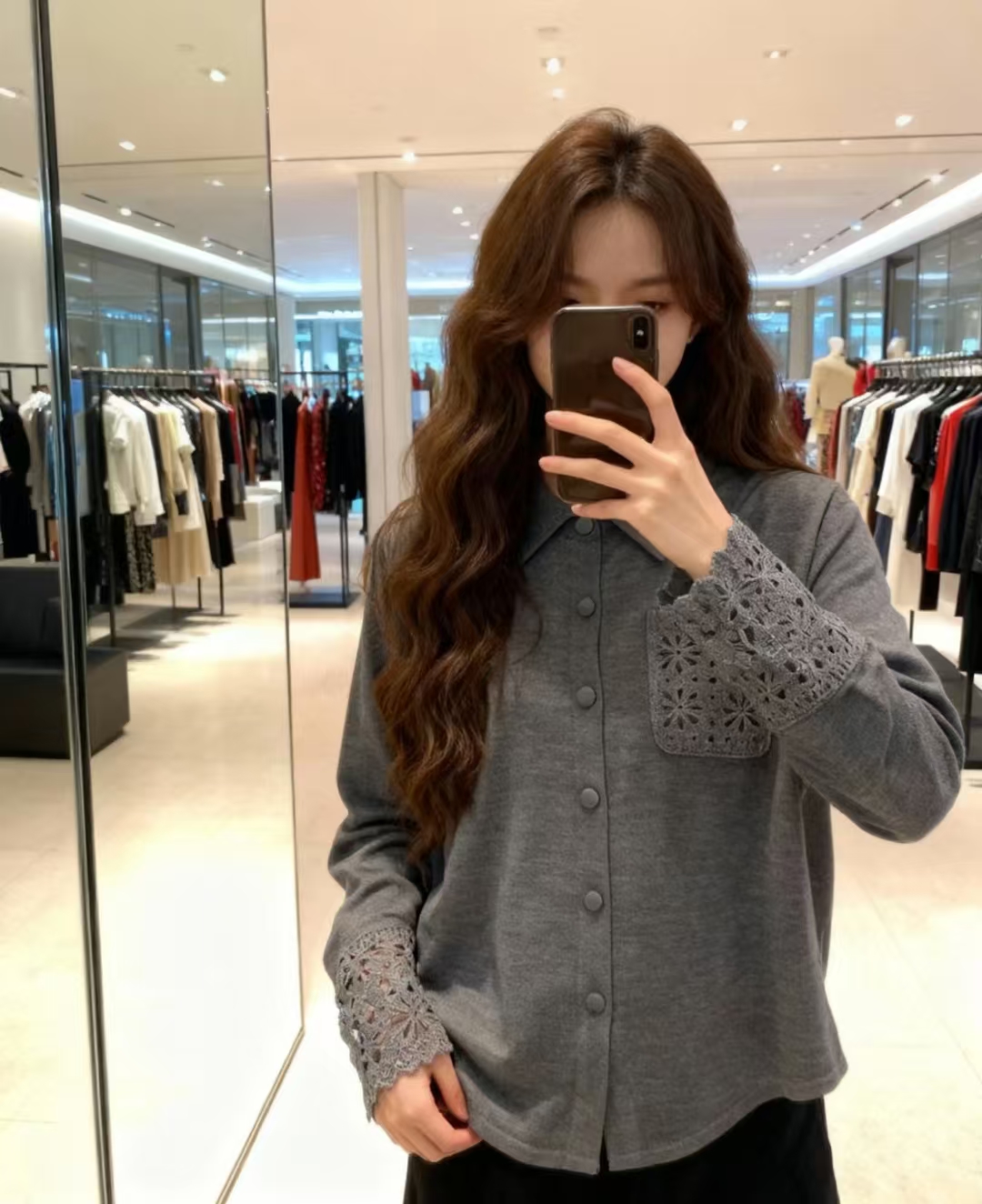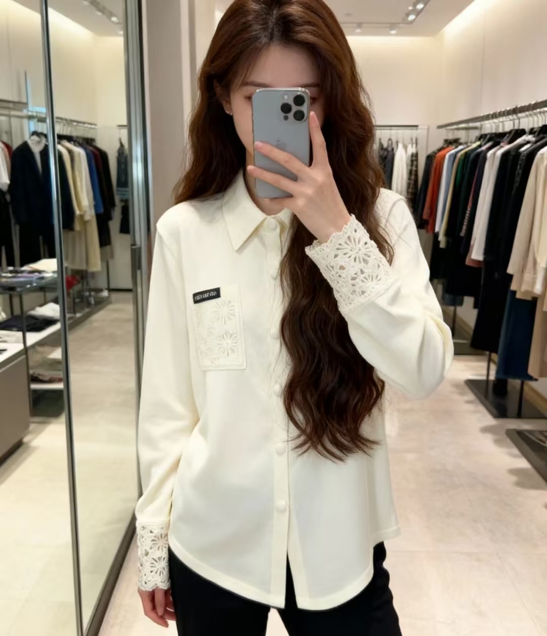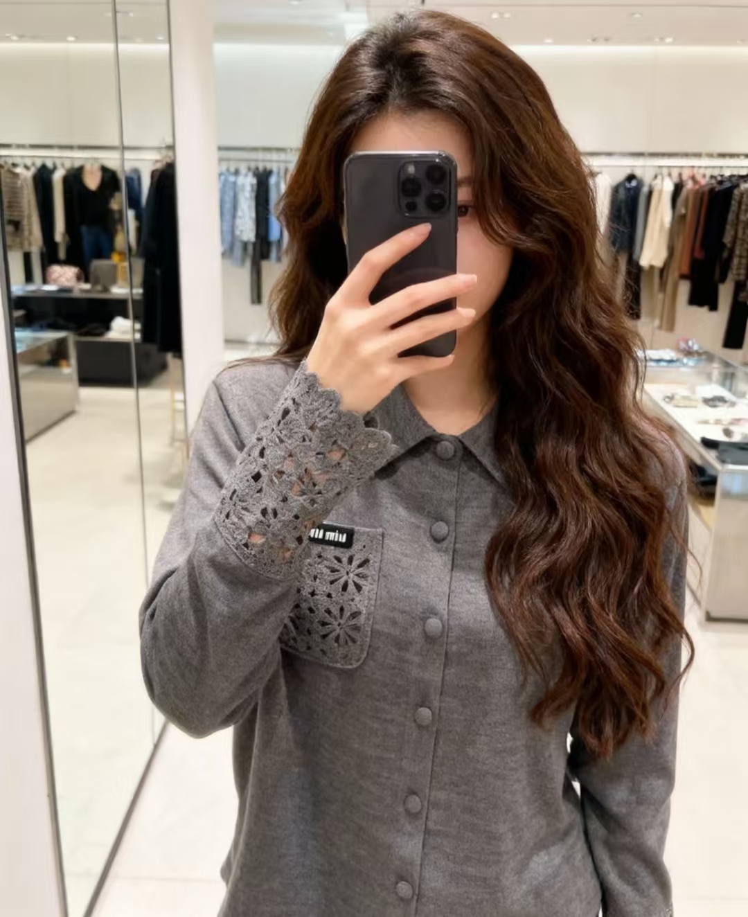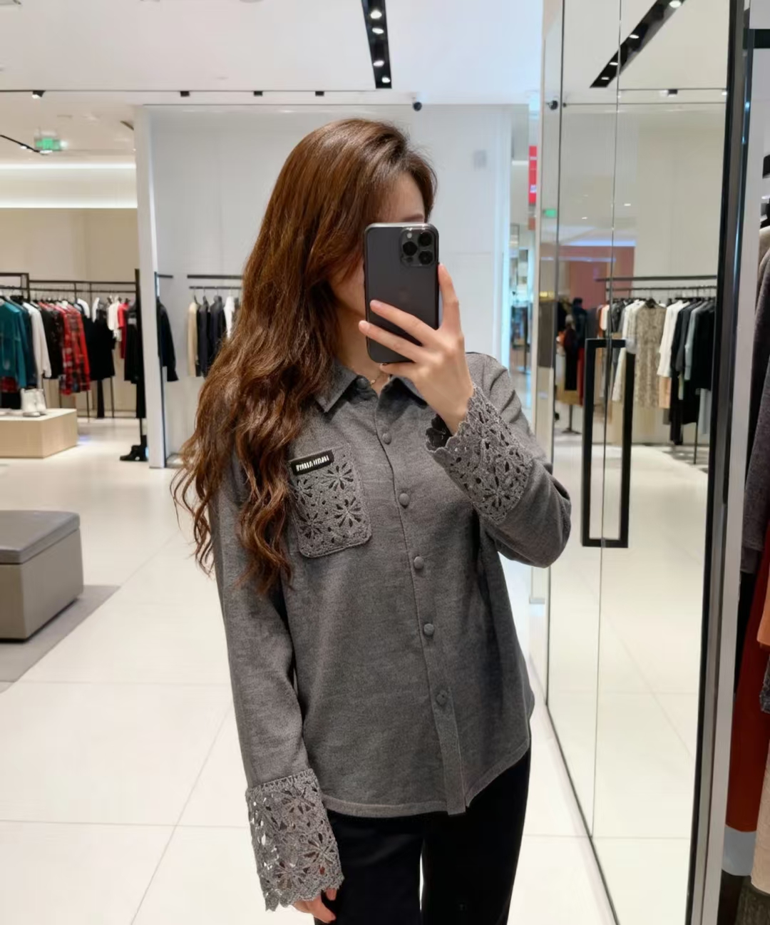 这款衣服是AAAAA 1:1 质量 (非常棒). 使用了和原版一模一样的材料. 商标部分也保持了和缪缪/Miu Miu一样. 图片拍摄是实物衣服拍摄, 您所收到的实物保证和我们图片一模一样.