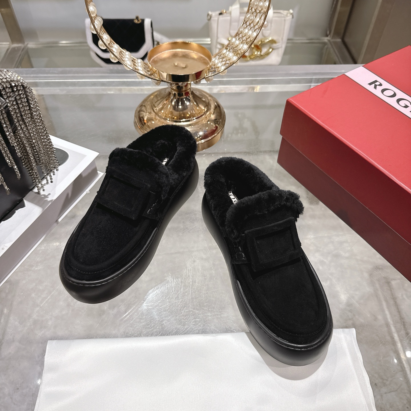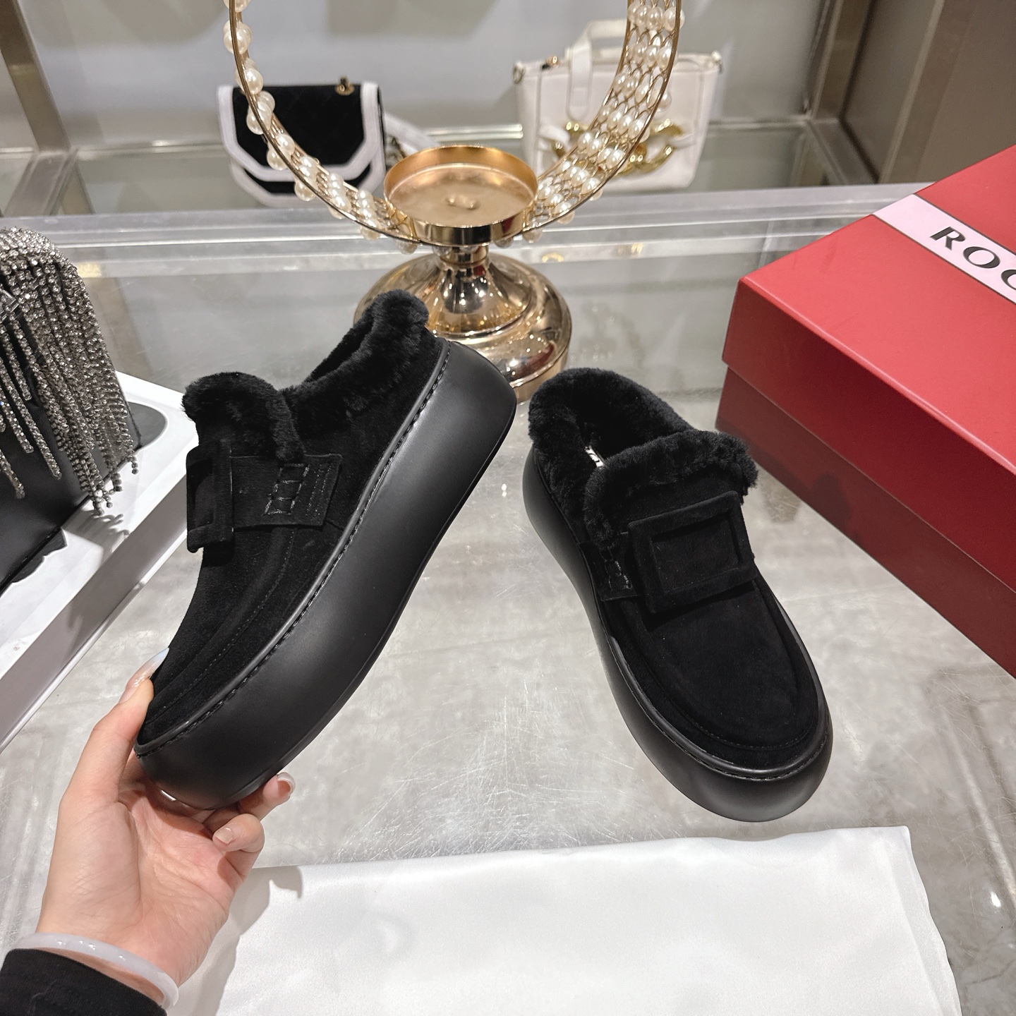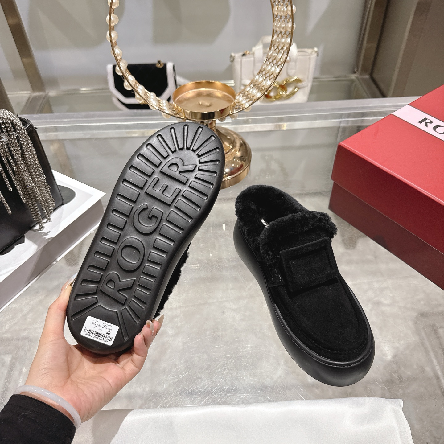 这款鞋子是AAAAA 1:1 质量 (非常棒). 使用了和原版一模一样的材料. 商标部分也保持了和罗杰维维耶/Roger Vivier一样. 图片拍摄是实物鞋子拍摄, 您所收到的实物保证和我们图片一模一样.