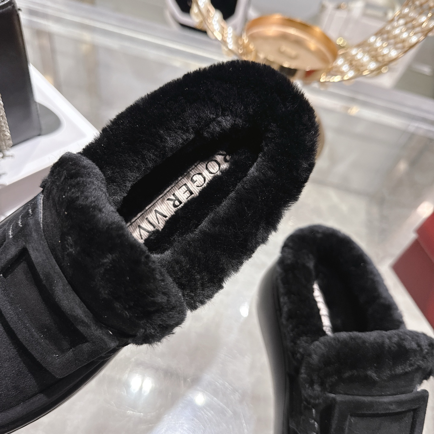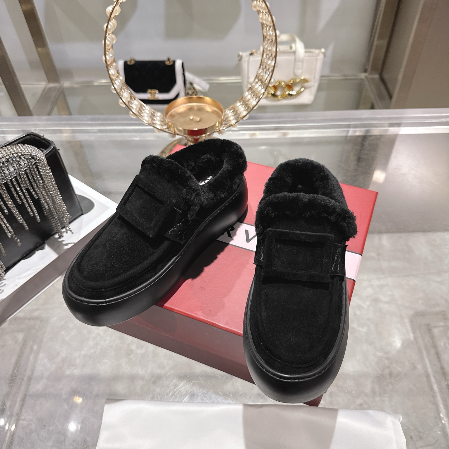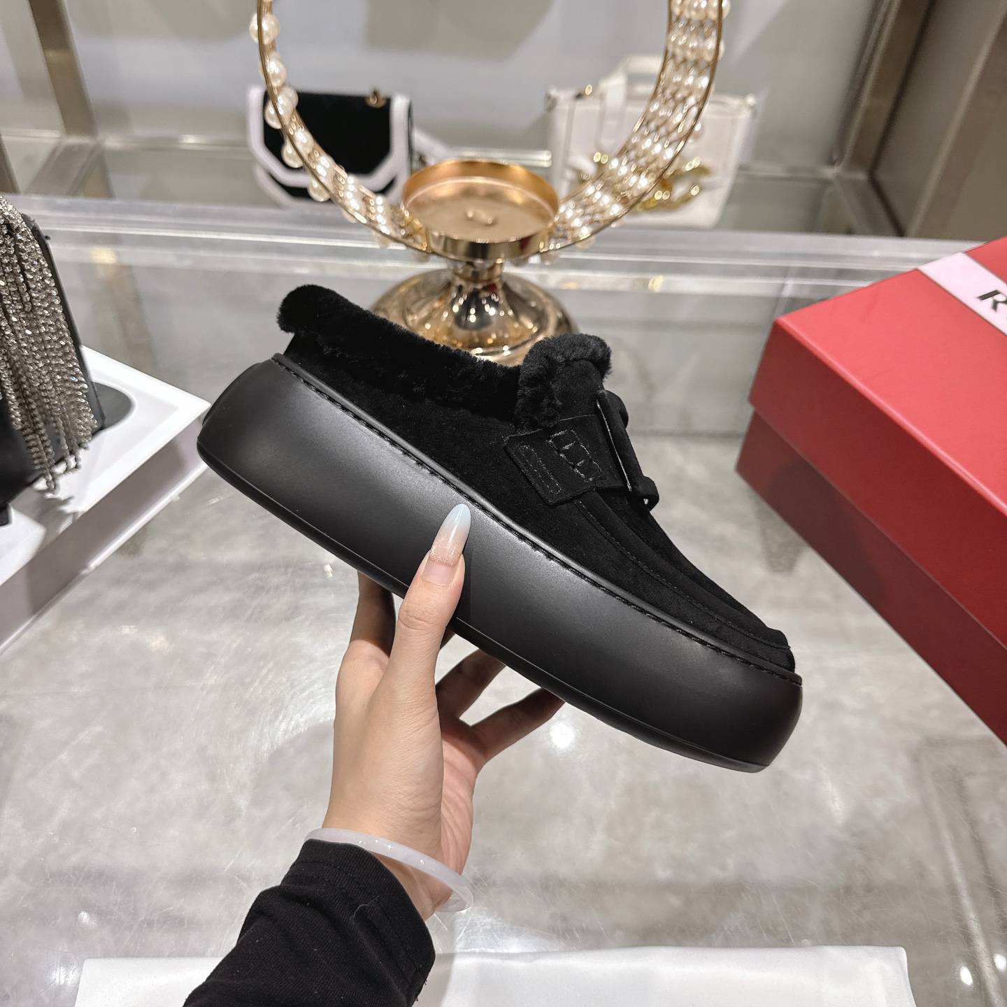 这款鞋子是AAAAA 1:1 质量 (非常棒). 使用了和原版一模一样的材料. 商标部分也保持了和罗杰维维耶/Roger Vivier一样. 图片拍摄是实物鞋子拍摄, 您所收到的实物保证和我们图片一模一样.