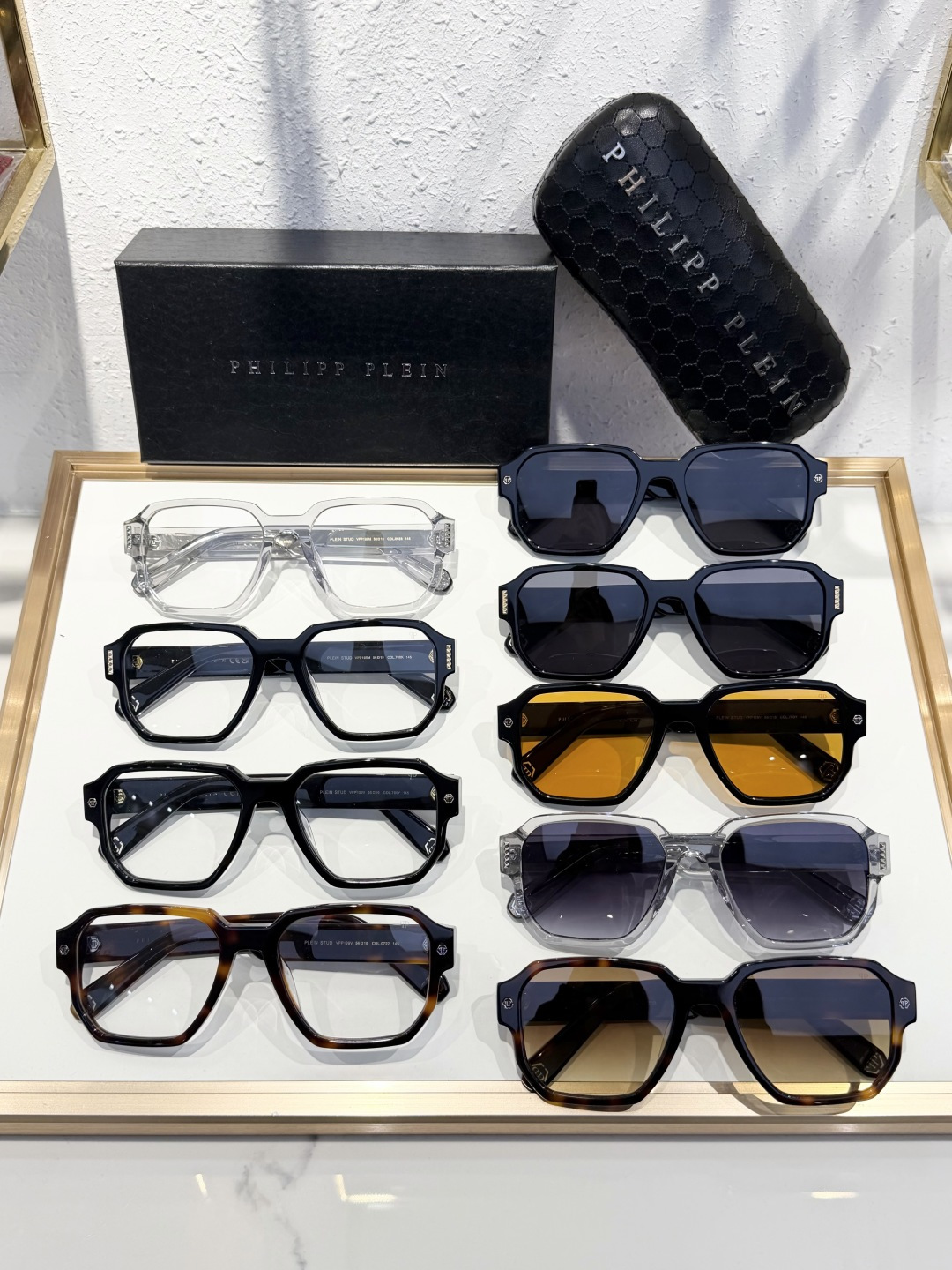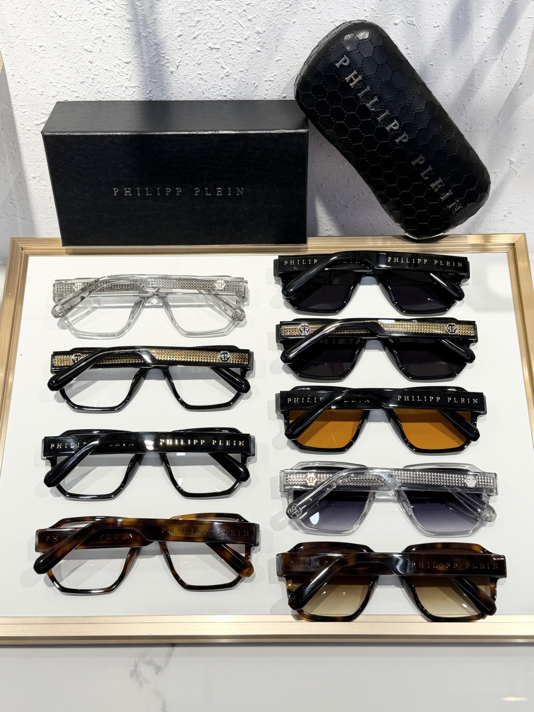 这款太阳眼镜是AAAAA 1:1 质量 (非常棒). 使用了和原版一模一样的材料. 商标部分也保持了和菲利普·普林/Philipp Plein一样. 图片拍摄是实物太阳眼镜拍摄, 您所收到的实物保证和我们图片一模一样.