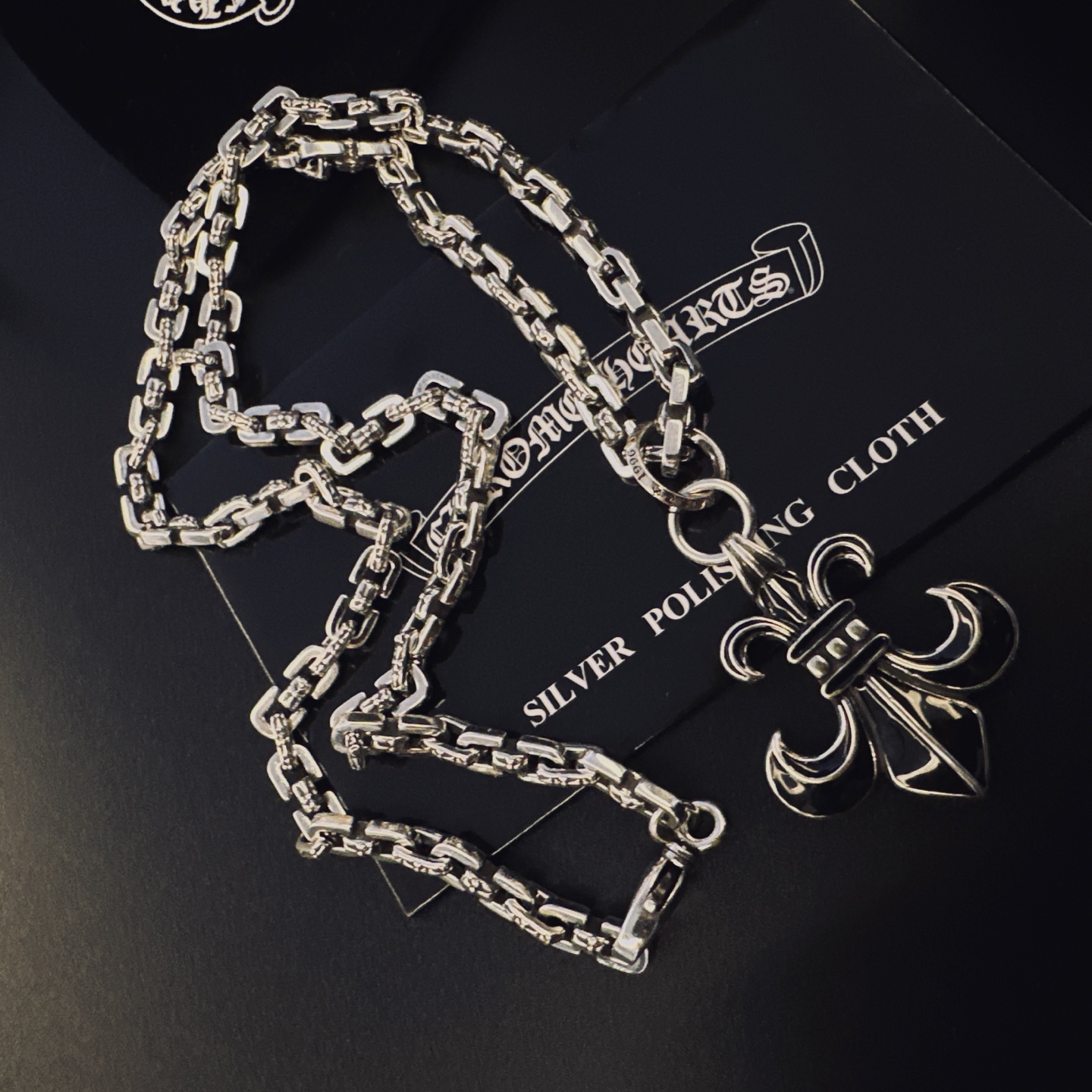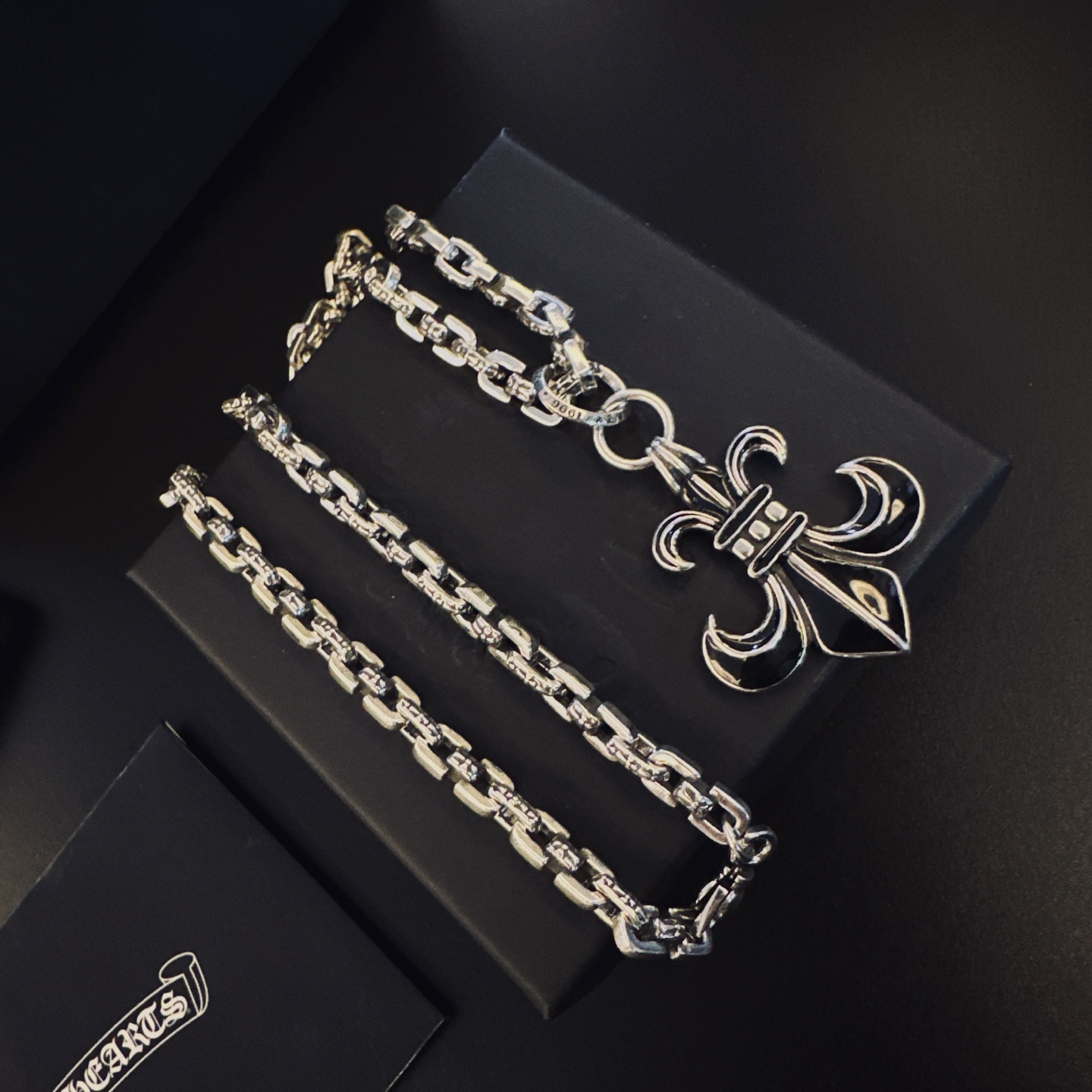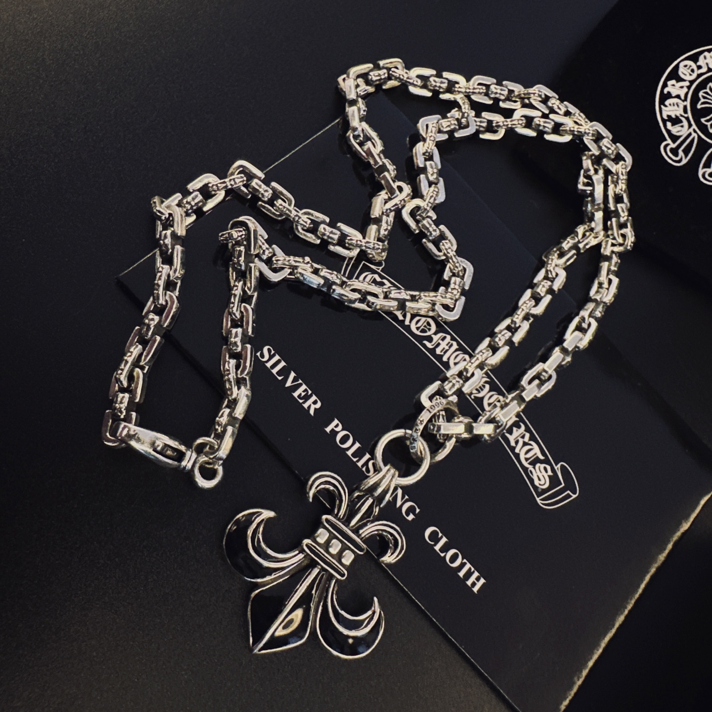 这款首饰是AAAAA 1:1 质量 (非常棒). 使用了和原版一模一样的材料. 商标部分也保持了和克罗心/Chrome Hearts一样. 图片拍摄是实物首饰拍摄, 您所收到的实物保证和我们图片一模一样.