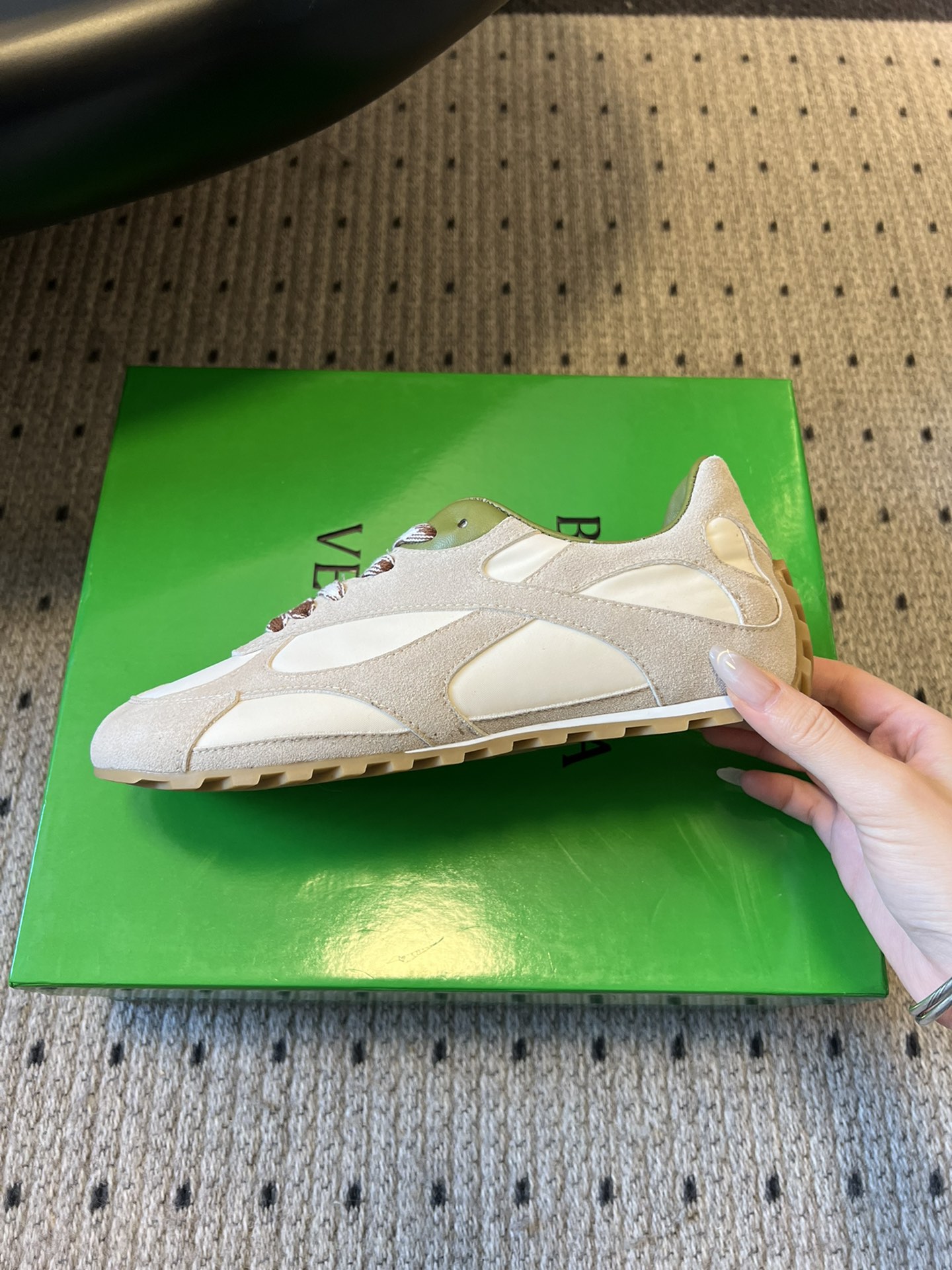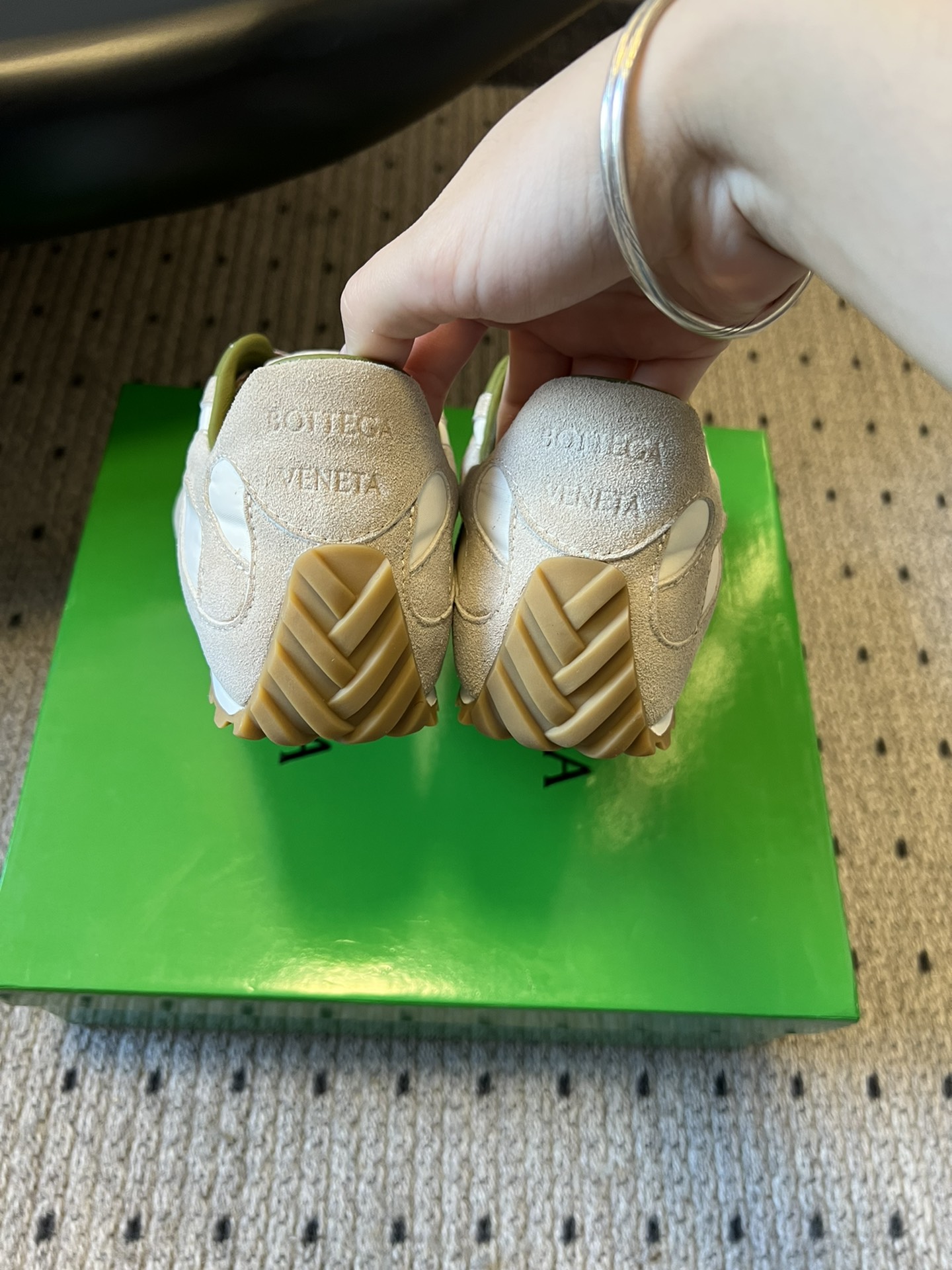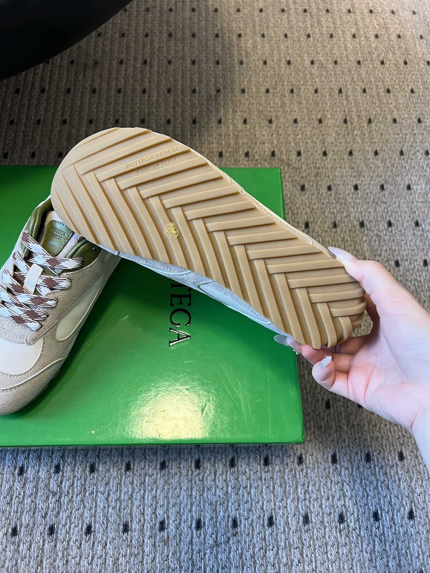 这款鞋子是AAAAA 1:1 质量 (非常棒). 使用了和原版一模一样的材料. 商标部分也保持了和葆蝶家/Bottega Veneta一样. 图片拍摄是实物鞋子拍摄, 您所收到的实物保证和我们图片一模一样.