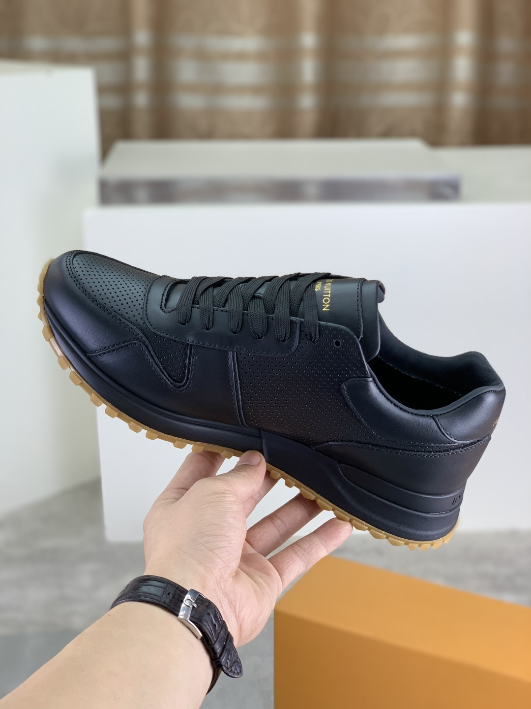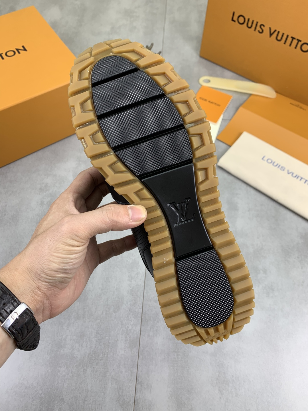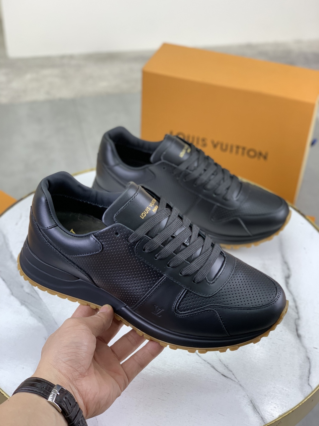 这款鞋子是AAAAA 1:1 质量 (非常棒). 使用了和原版一模一样的材料. 商标部分也保持了和路易威登/Louis Vuitton一样. 图片拍摄是实物鞋子拍摄, 您所收到的实物保证和我们图片一模一样.