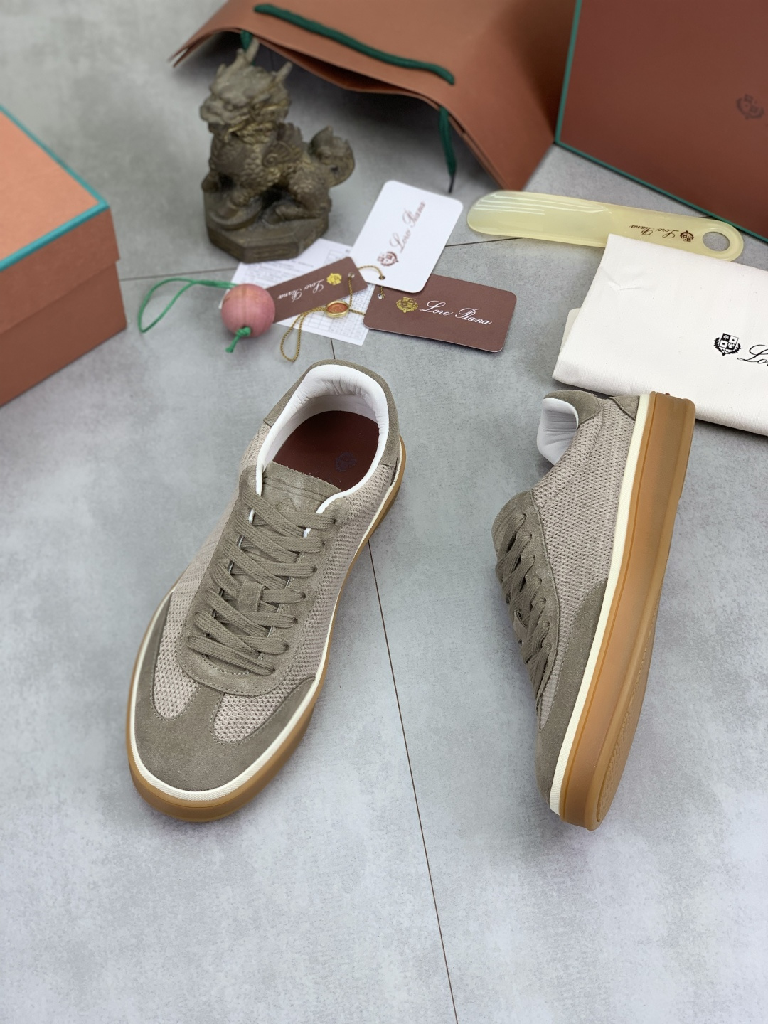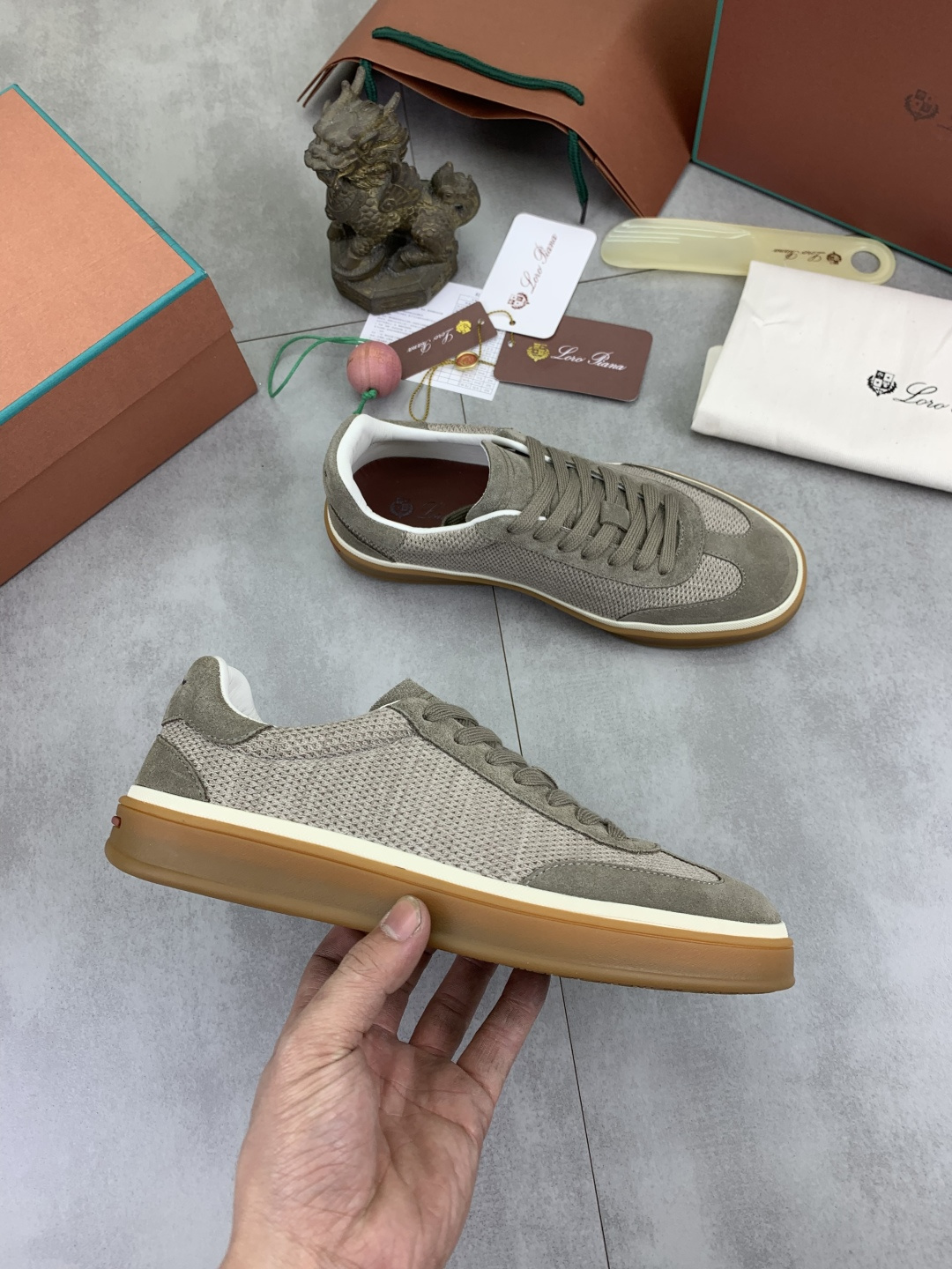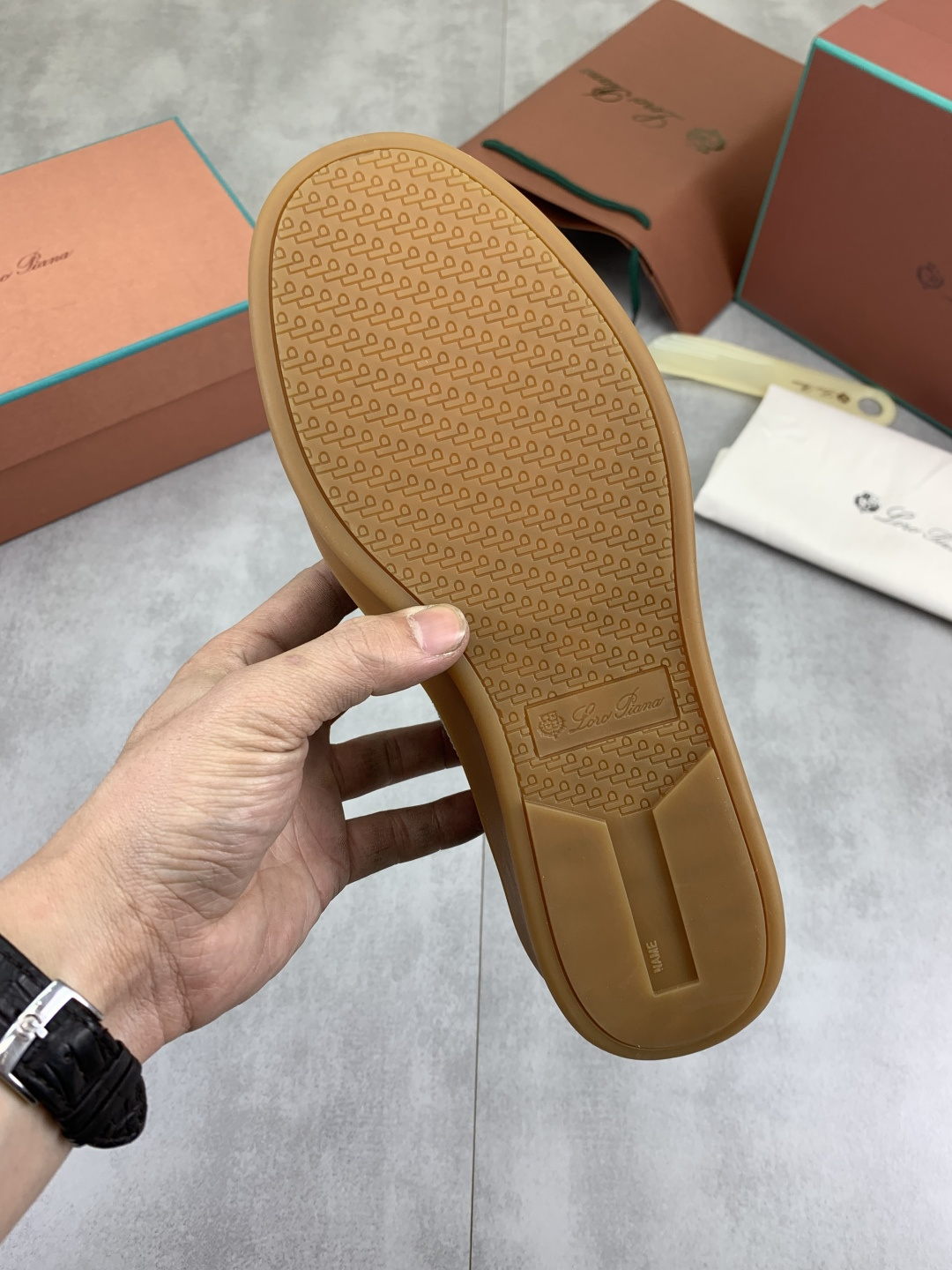 这款鞋子是AAAAA 1:1 质量 (非常棒). 使用了和原版一模一样的材料. 商标部分也保持了和洛罗皮亚纳/Loro Piana一样. 图片拍摄是实物鞋子拍摄, 您所收到的实物保证和我们图片一模一样.