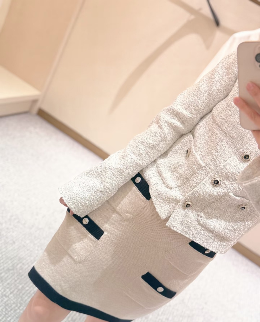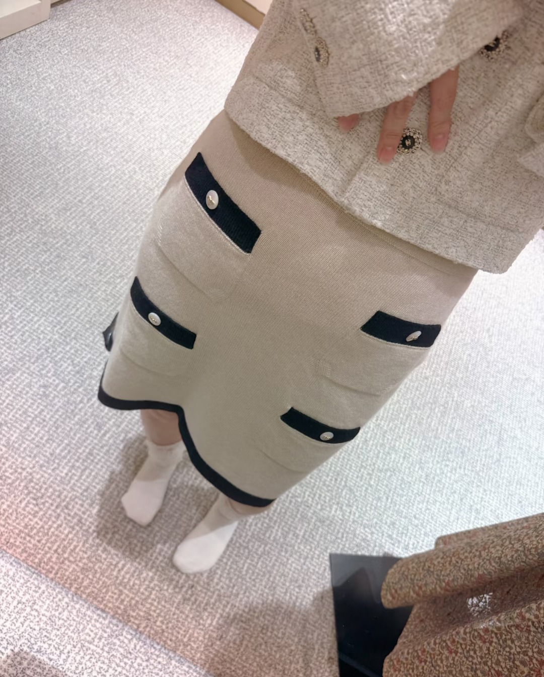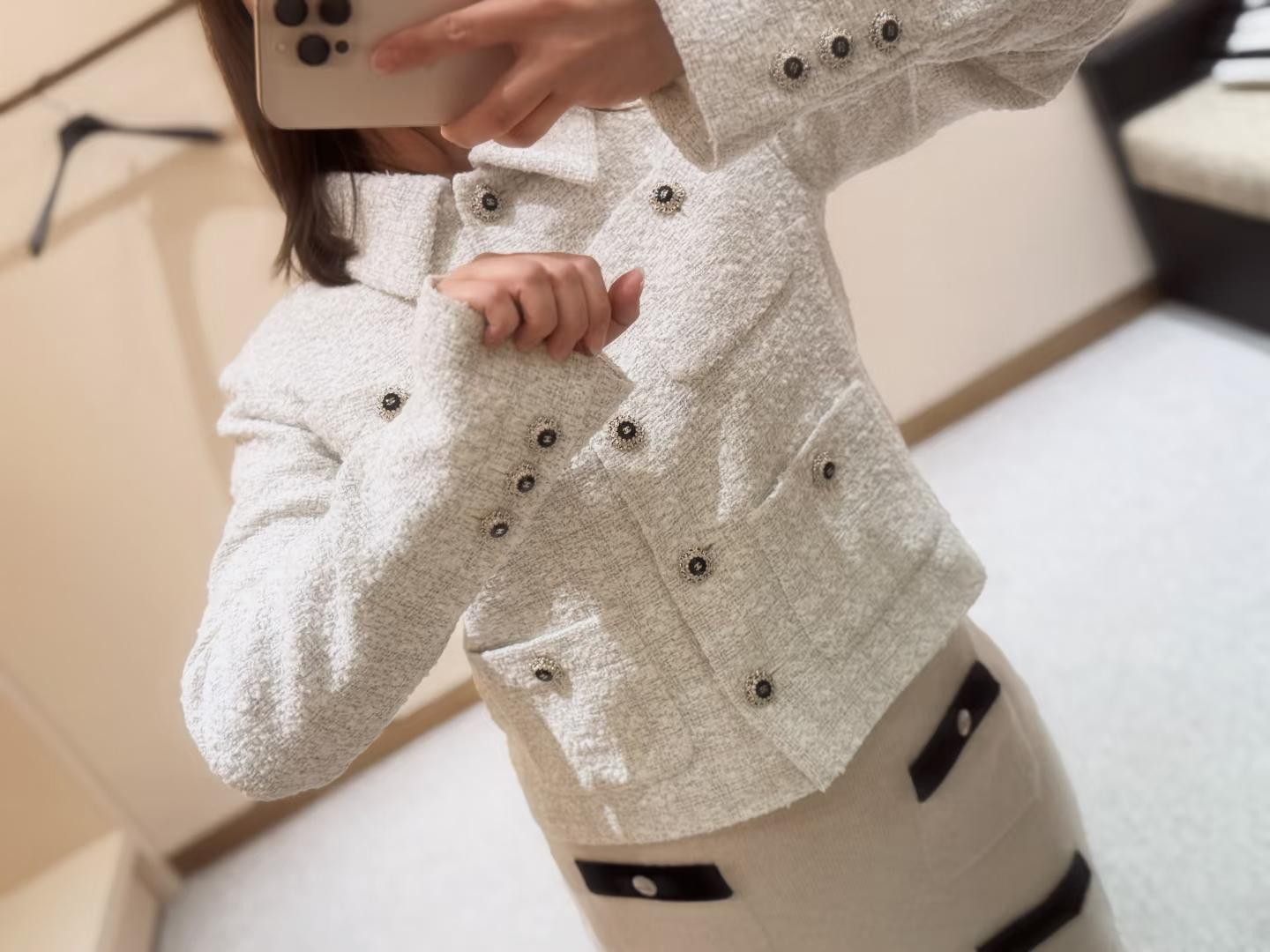 这款衣服是AAAAA 1:1 质量 (非常棒). 使用了和原版一模一样的材料. 商标部分也保持了和香奈儿/Chanel一样. 图片拍摄是实物衣服拍摄, 您所收到的实物保证和我们图片一模一样.