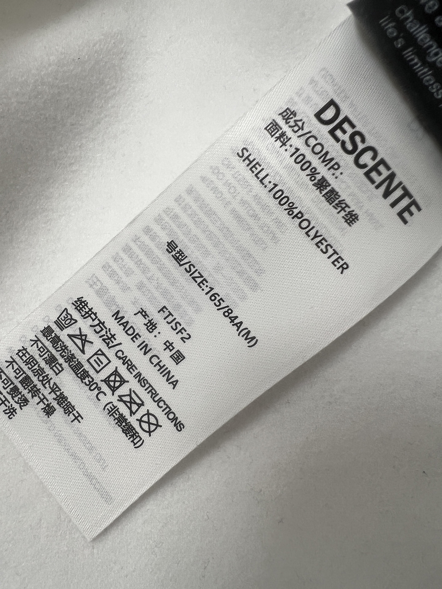这款衣服是AAAAA 1:1 质量 (非常棒). 使用了和原版一模一样的材料. 商标部分也保持了和Descente一样. 图片拍摄是实物衣服拍摄, 您所收到的实物保证和我们图片一模一样.