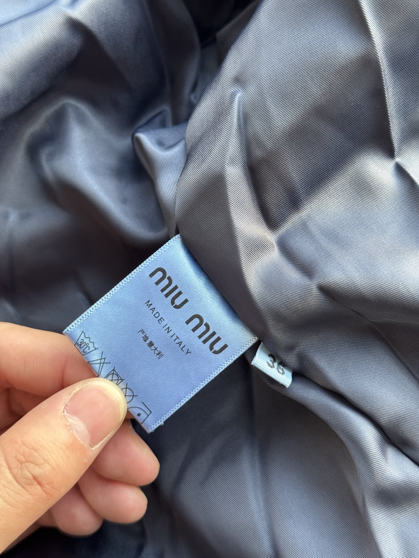 这款衣服是AAAAA 1:1 质量 (非常棒). 使用了和原版一模一样的材料. 商标部分也保持了和缪缪/Miu Miu一样. 图片拍摄是实物衣服拍摄, 您所收到的实物保证和我们图片一模一样.