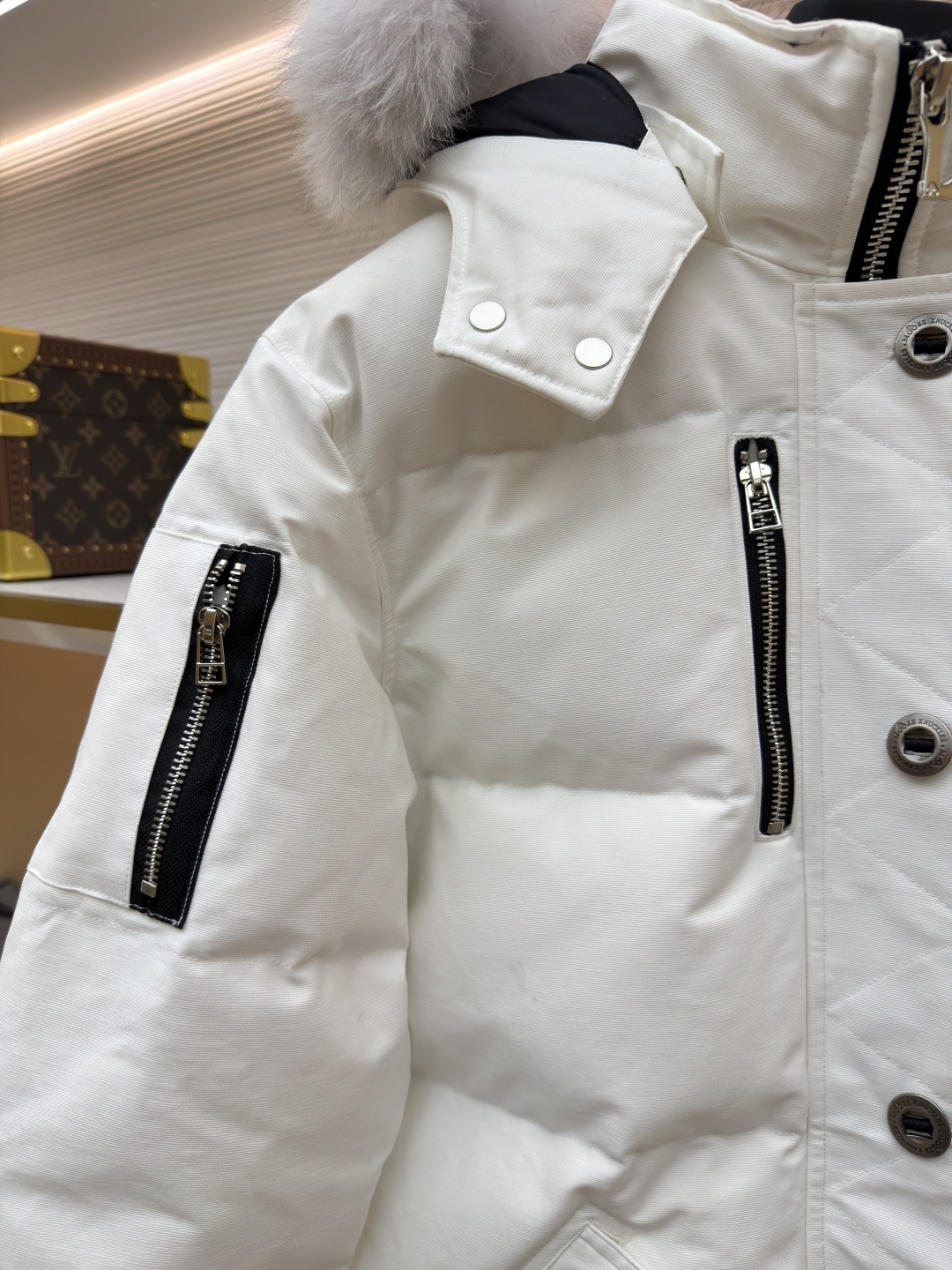 这款衣服是AAAAA 1:1 质量 (非常棒). 使用了和原版一模一样的材料. 商标部分也保持了和Moose Knuckles一样. 图片拍摄是实物衣服拍摄, 您所收到的实物保证和我们图片一模一样.