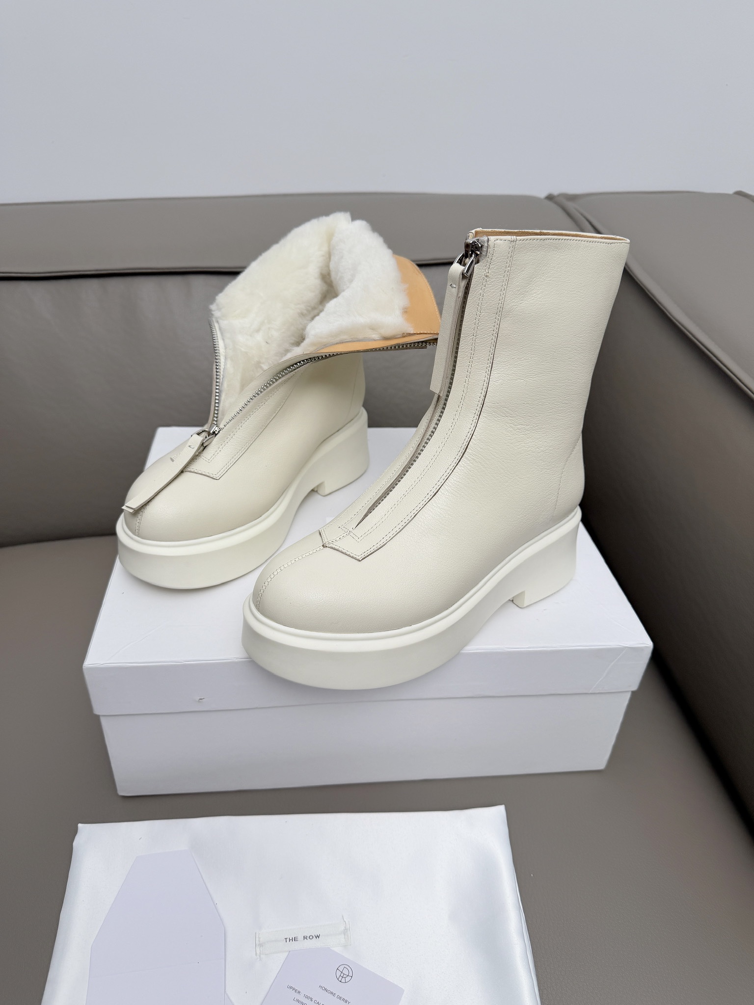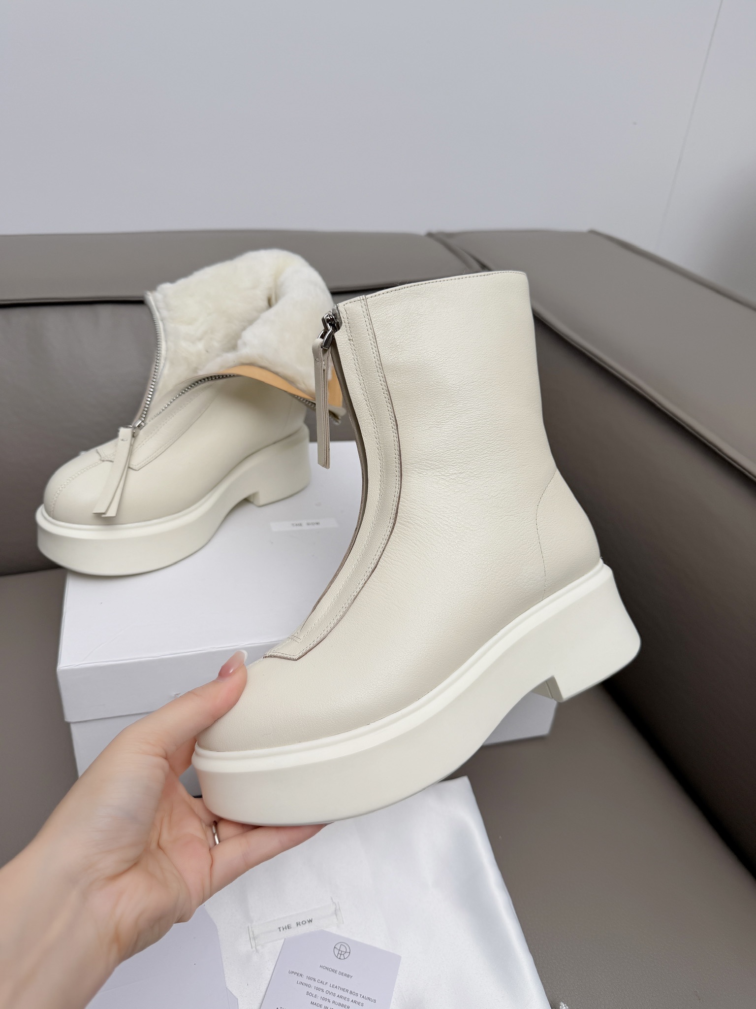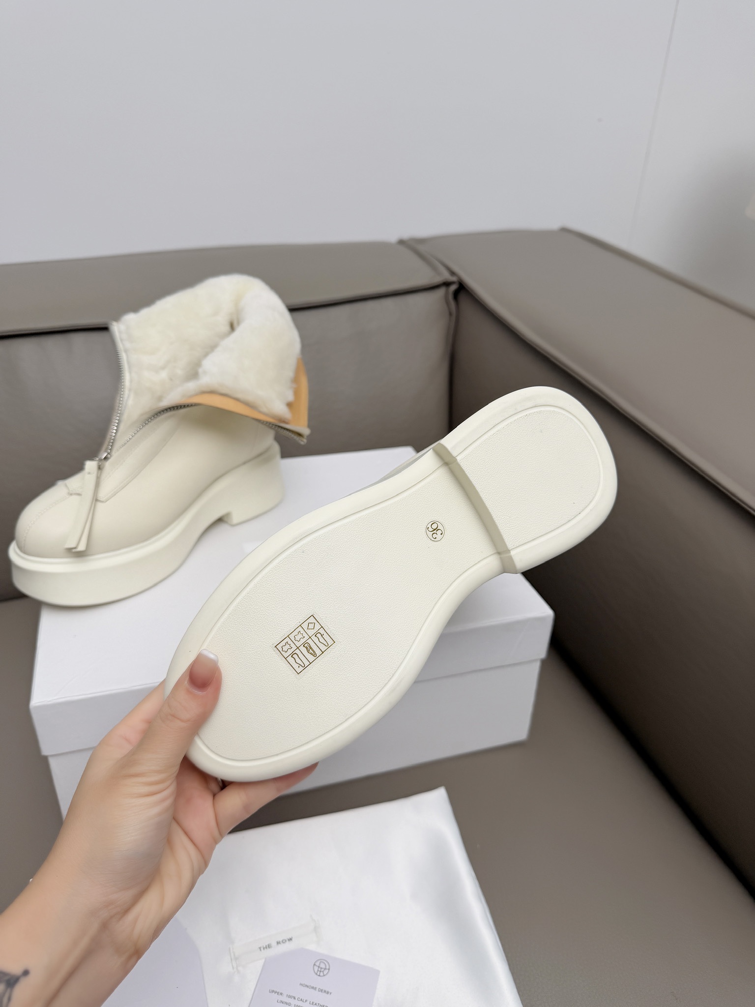 这款鞋子是AAAAA 1:1 质量 (非常棒). 使用了和原版一模一样的材料. 商标部分也保持了和The Row一样. 图片拍摄是实物鞋子拍摄, 您所收到的实物保证和我们图片一模一样.