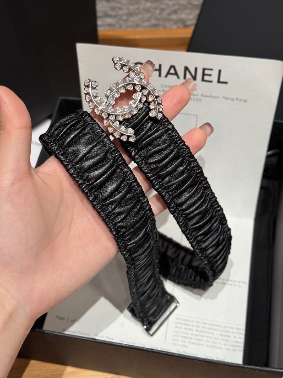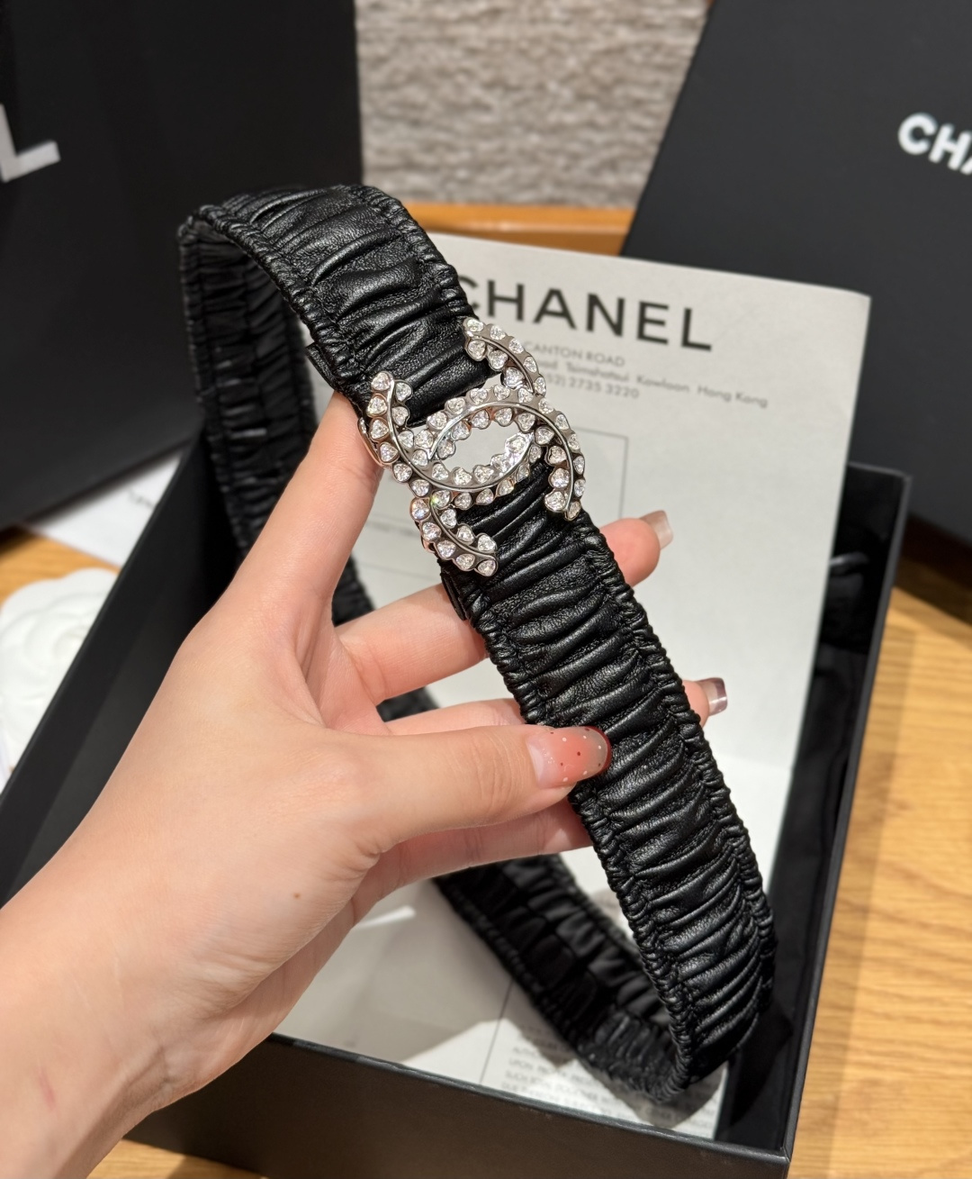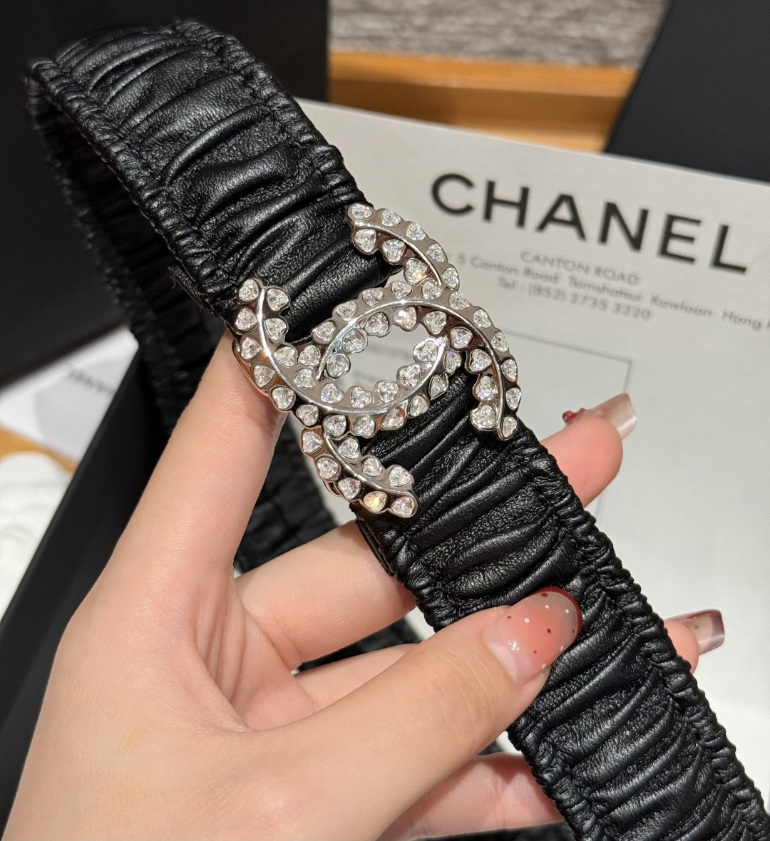 这款皮带是AAAAA 1:1 质量 (非常棒). 使用了和原版一模一样的材料. 商标部分也保持了和香奈儿/Chanel一样. 图片拍摄是实物皮带拍摄, 您所收到的实物保证和我们图片一模一样.