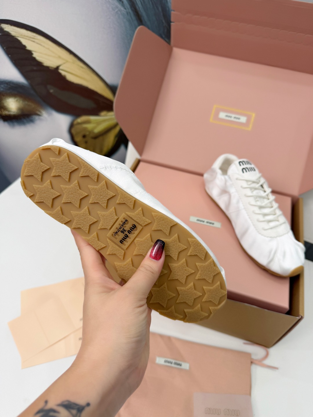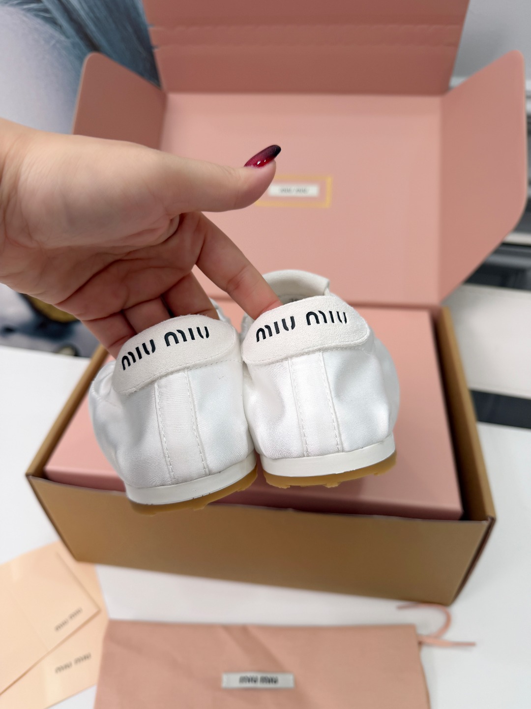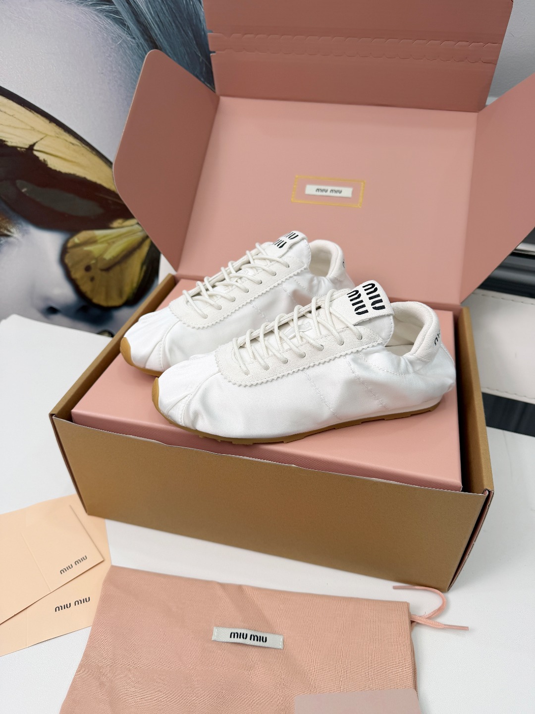 这款鞋子是AAAAA 1:1 质量 (非常棒). 使用了和原版一模一样的材料. 商标部分也保持了和缪缪/Miu Miu一样. 图片拍摄是实物鞋子拍摄, 您所收到的实物保证和我们图片一模一样.