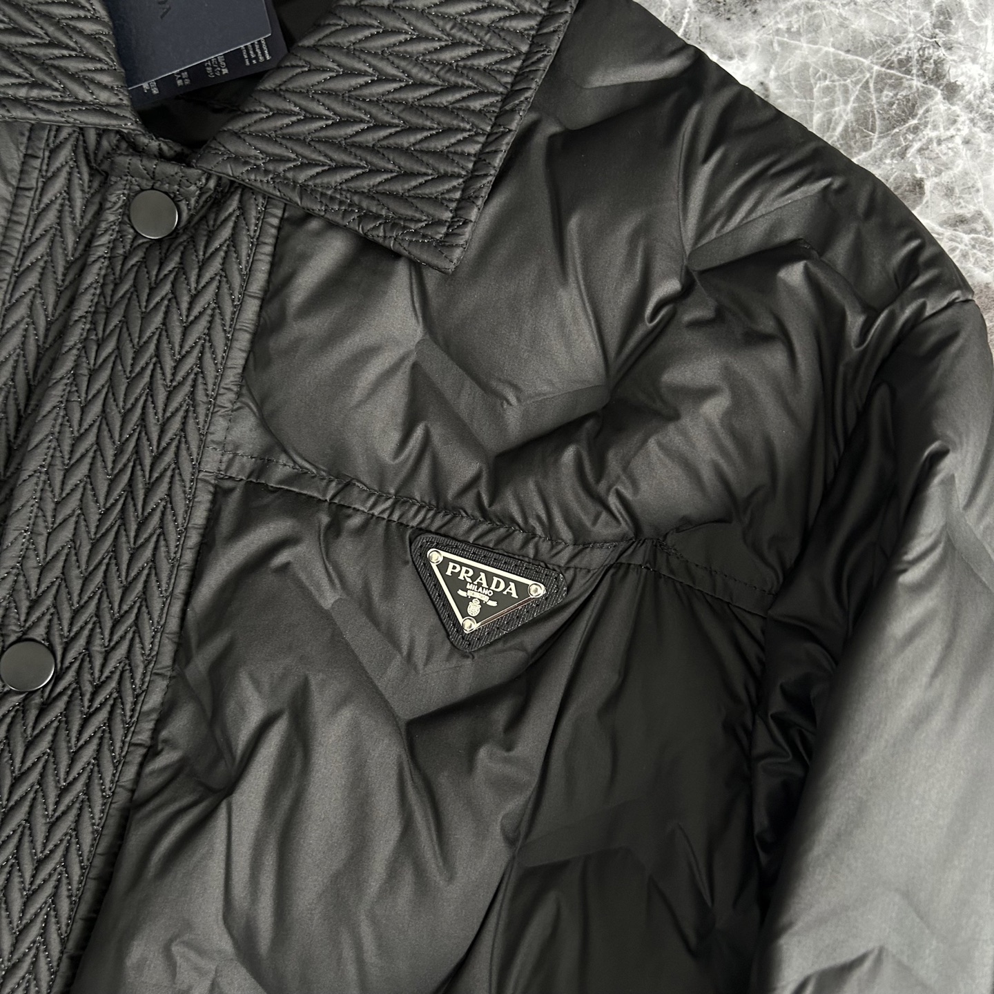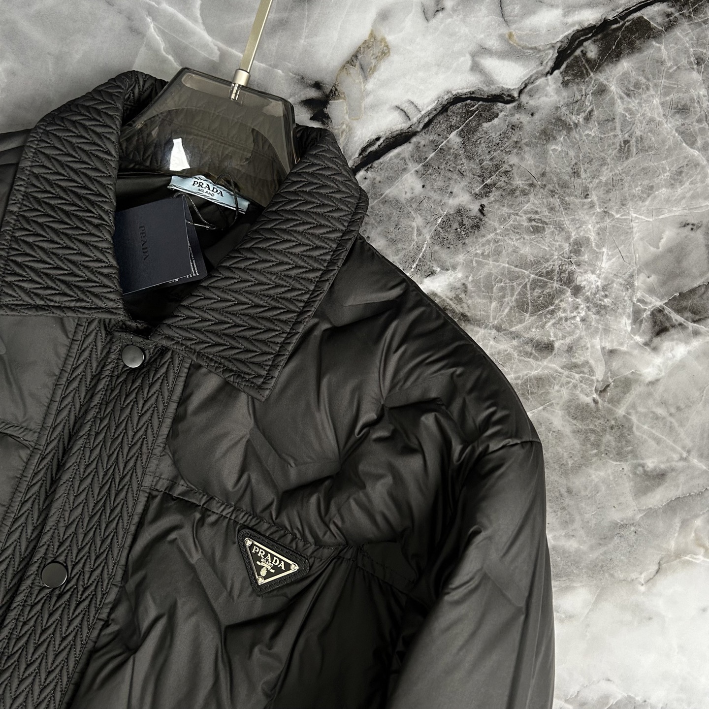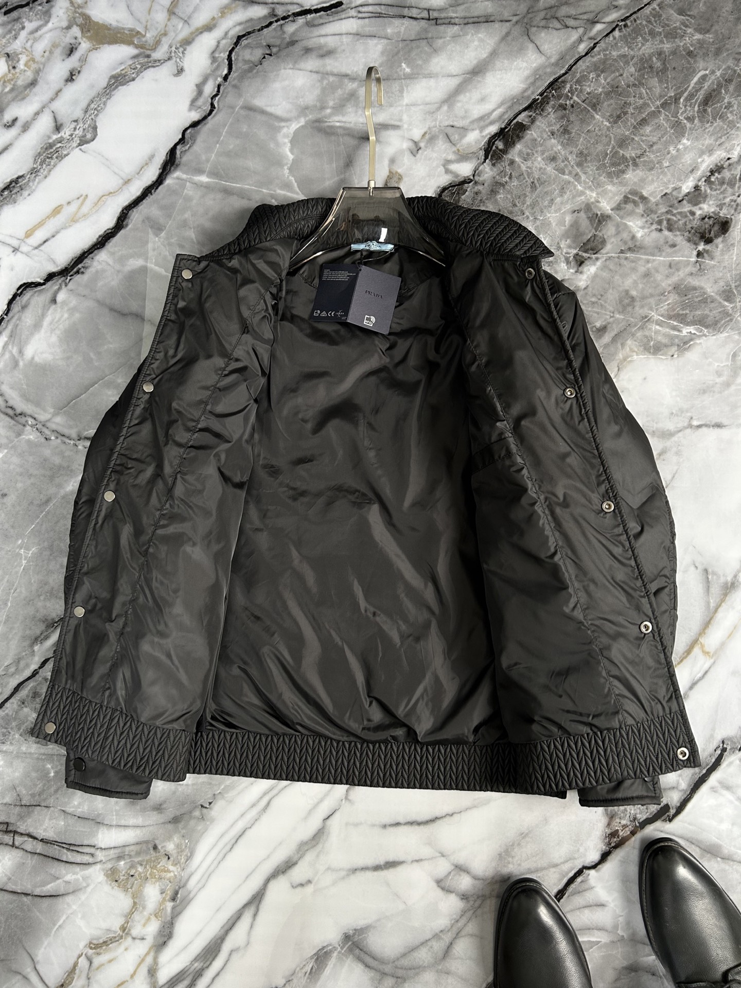 这款衣服是AAAAA 1:1 质量 (非常棒). 使用了和原版一模一样的材料. 商标部分也保持了和普拉达/Prada一样. 图片拍摄是实物衣服拍摄, 您所收到的实物保证和我们图片一模一样.