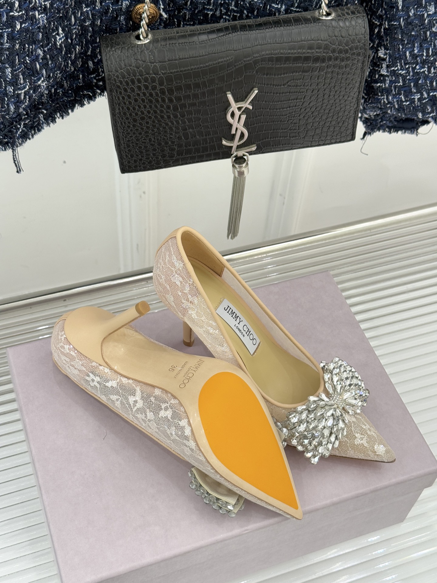 这款鞋子是AAAAA 1:1 质量 (非常棒). 使用了和原版一模一样的材料. 商标部分也保持了和吉米乔/JIMMY CHOO一样. 图片拍摄是实物鞋子拍摄, 您所收到的实物保证和我们图片一模一样.