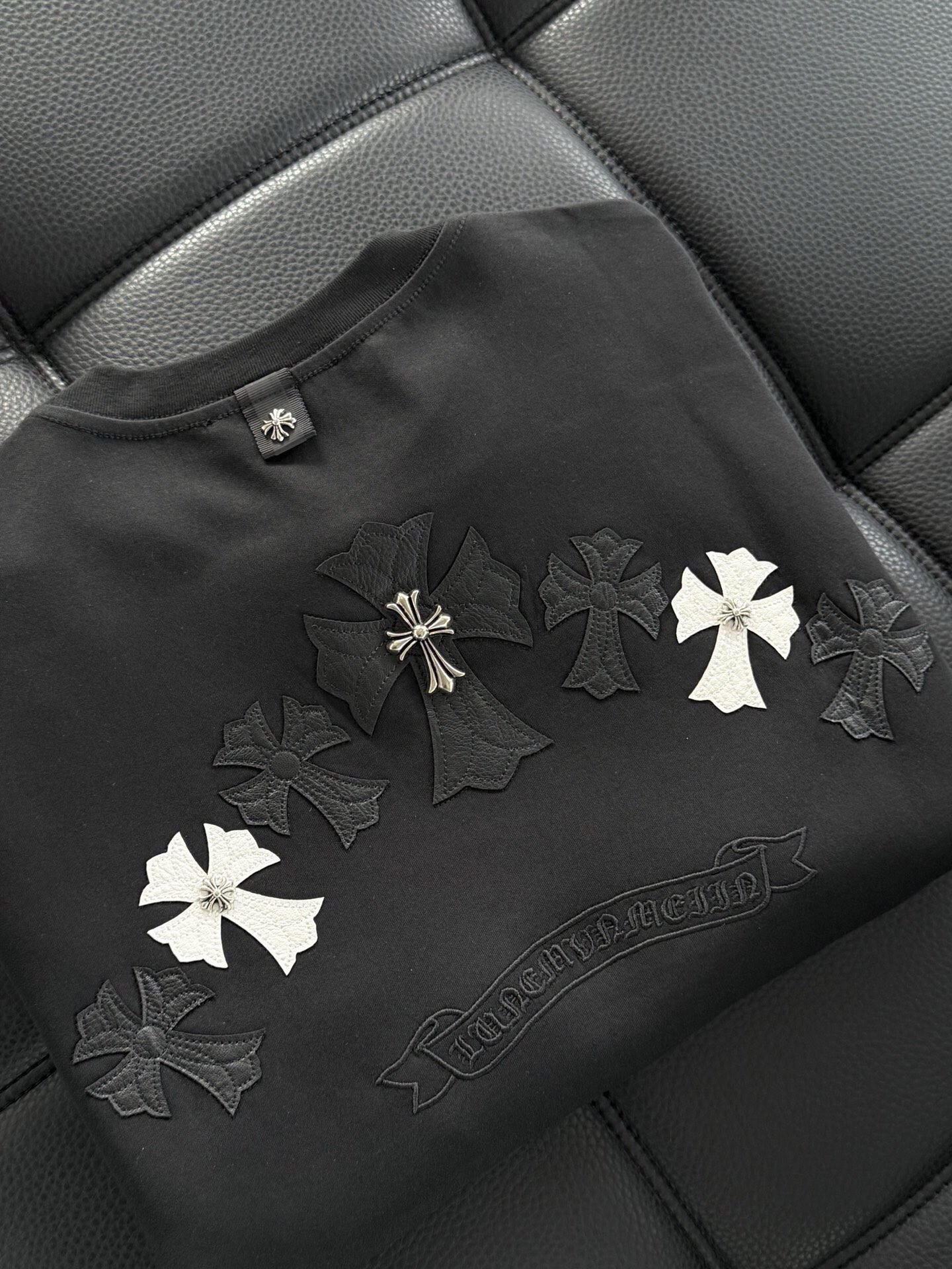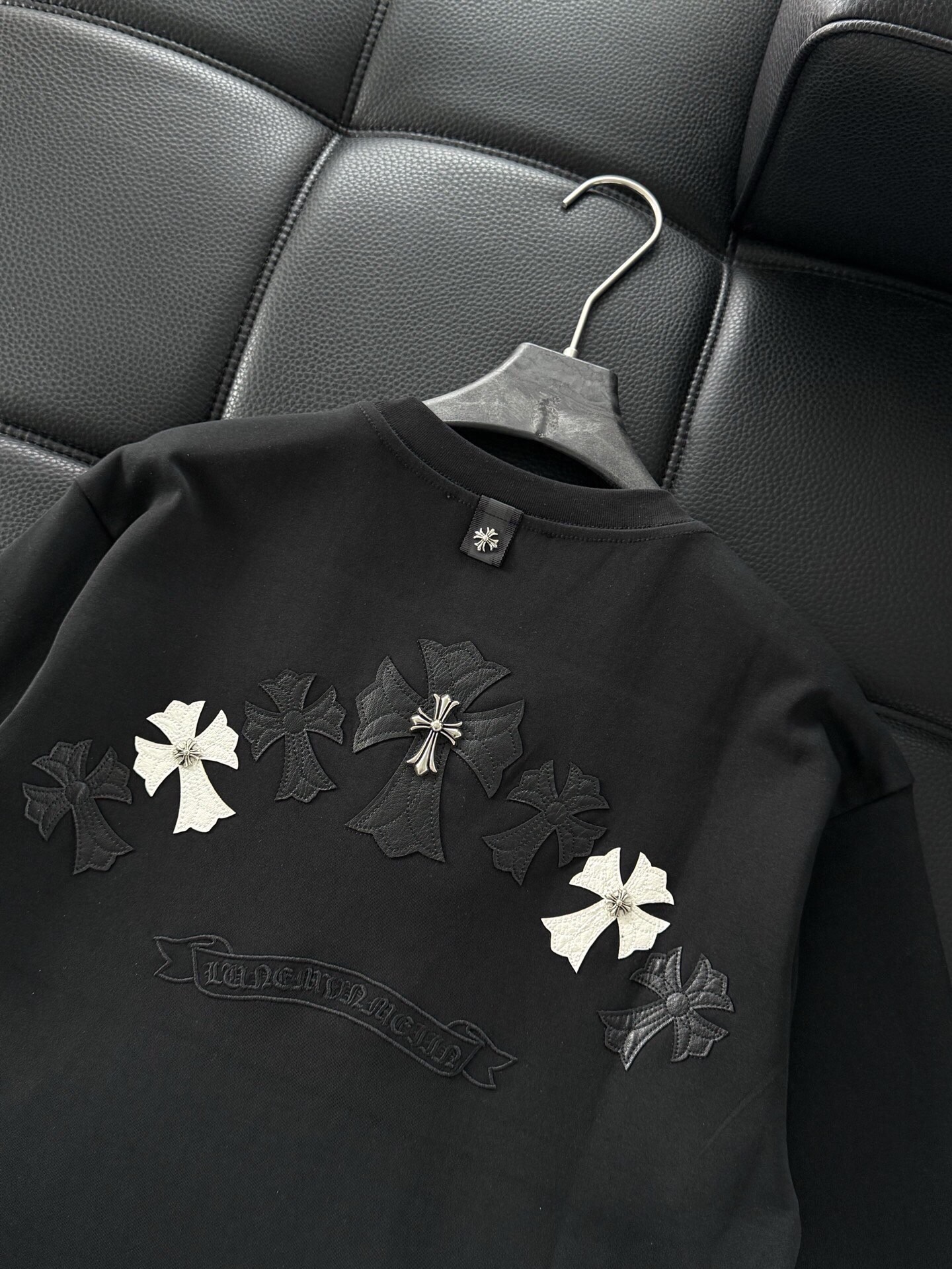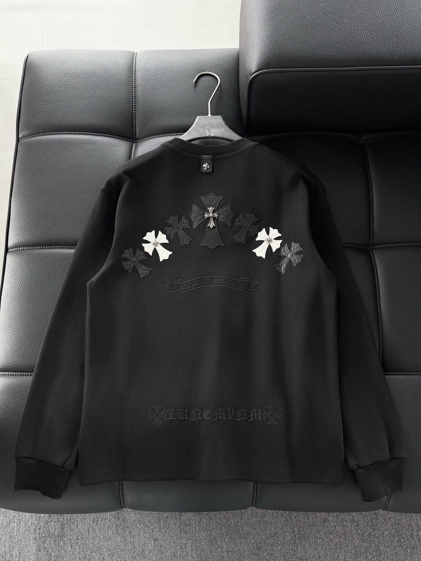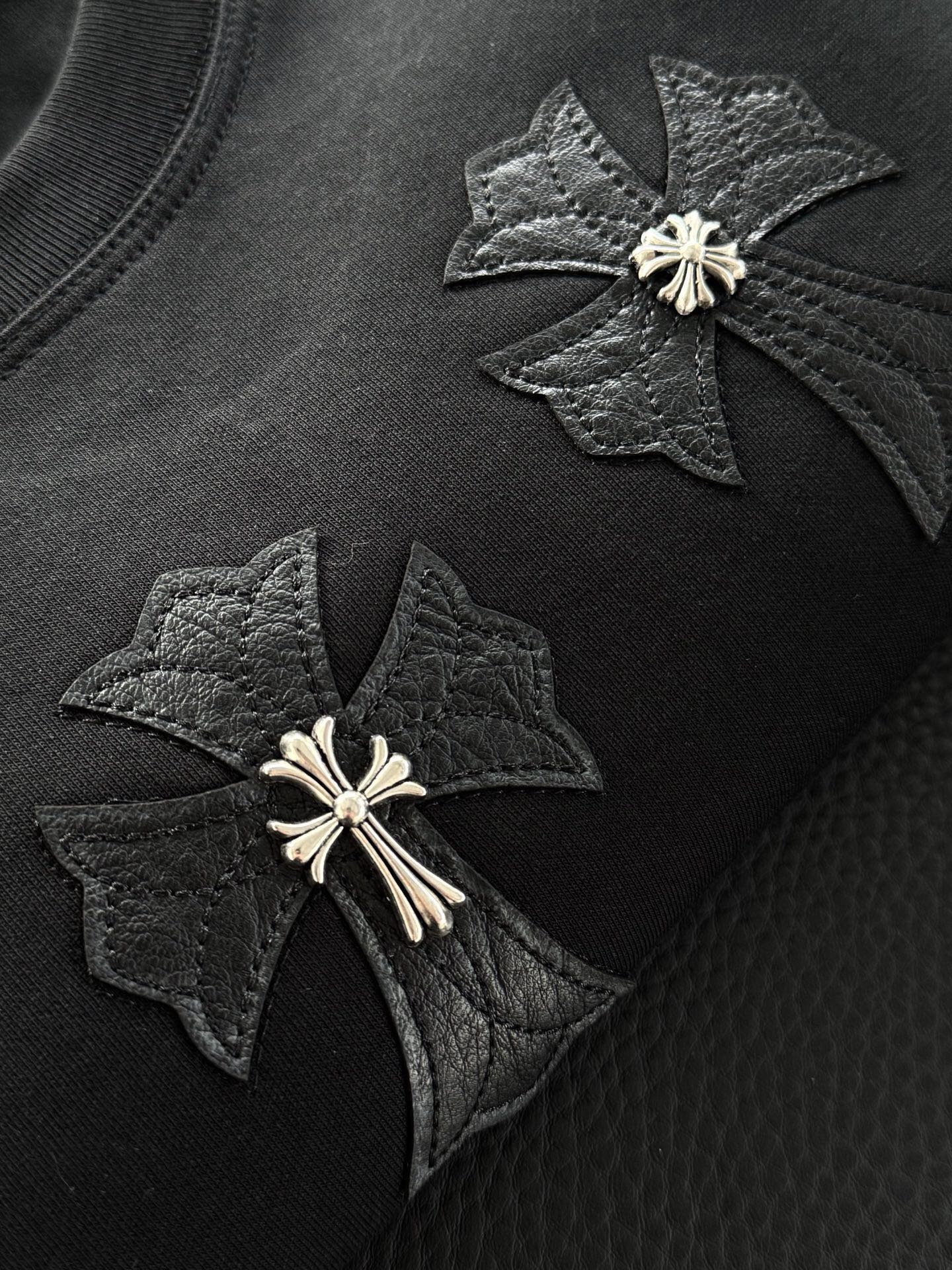 这款衣服是AAAAA 1:1 质量 (非常棒). 使用了和原版一模一样的材料. 商标部分也保持了和克罗心/Chrome Hearts一样. 图片拍摄是实物衣服拍摄, 您所收到的实物保证和我们图片一模一样.