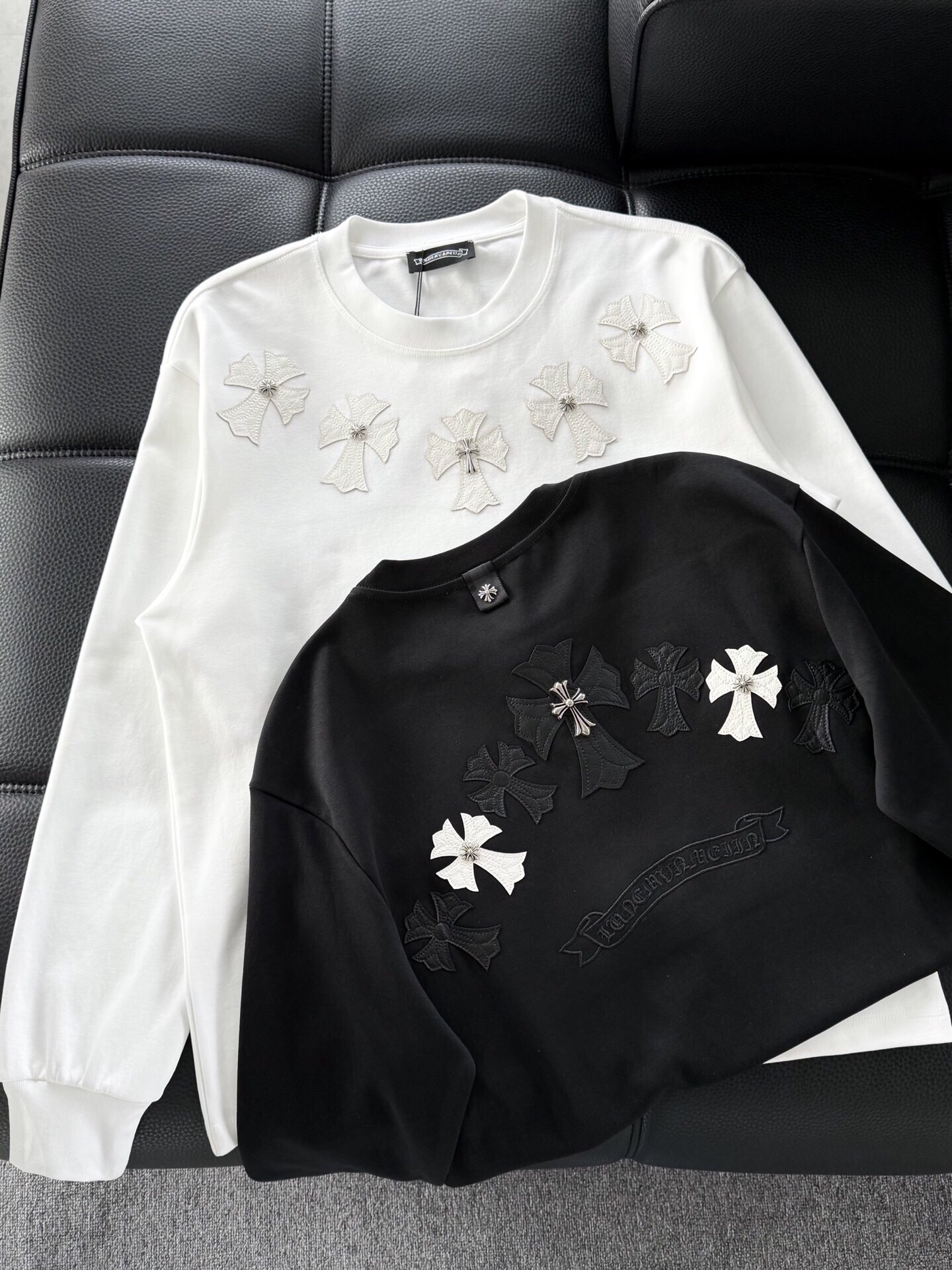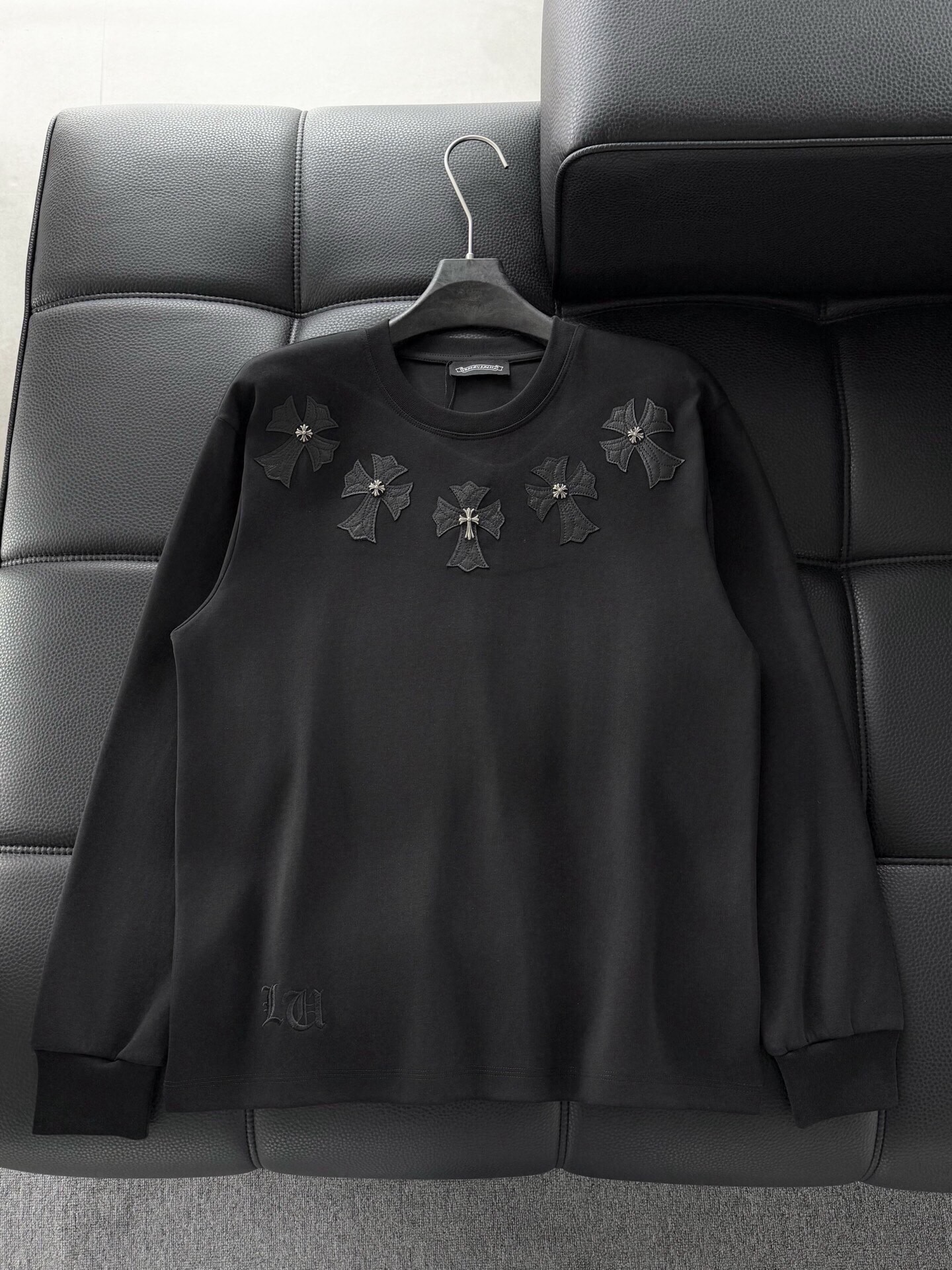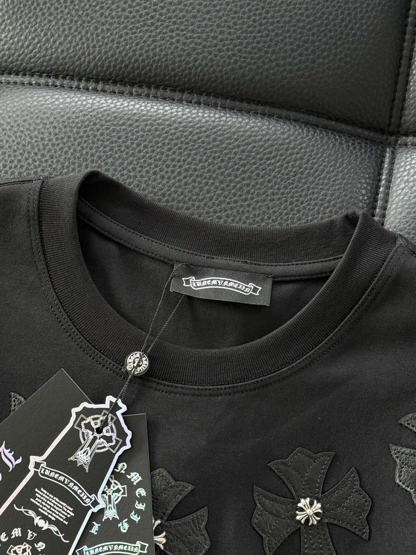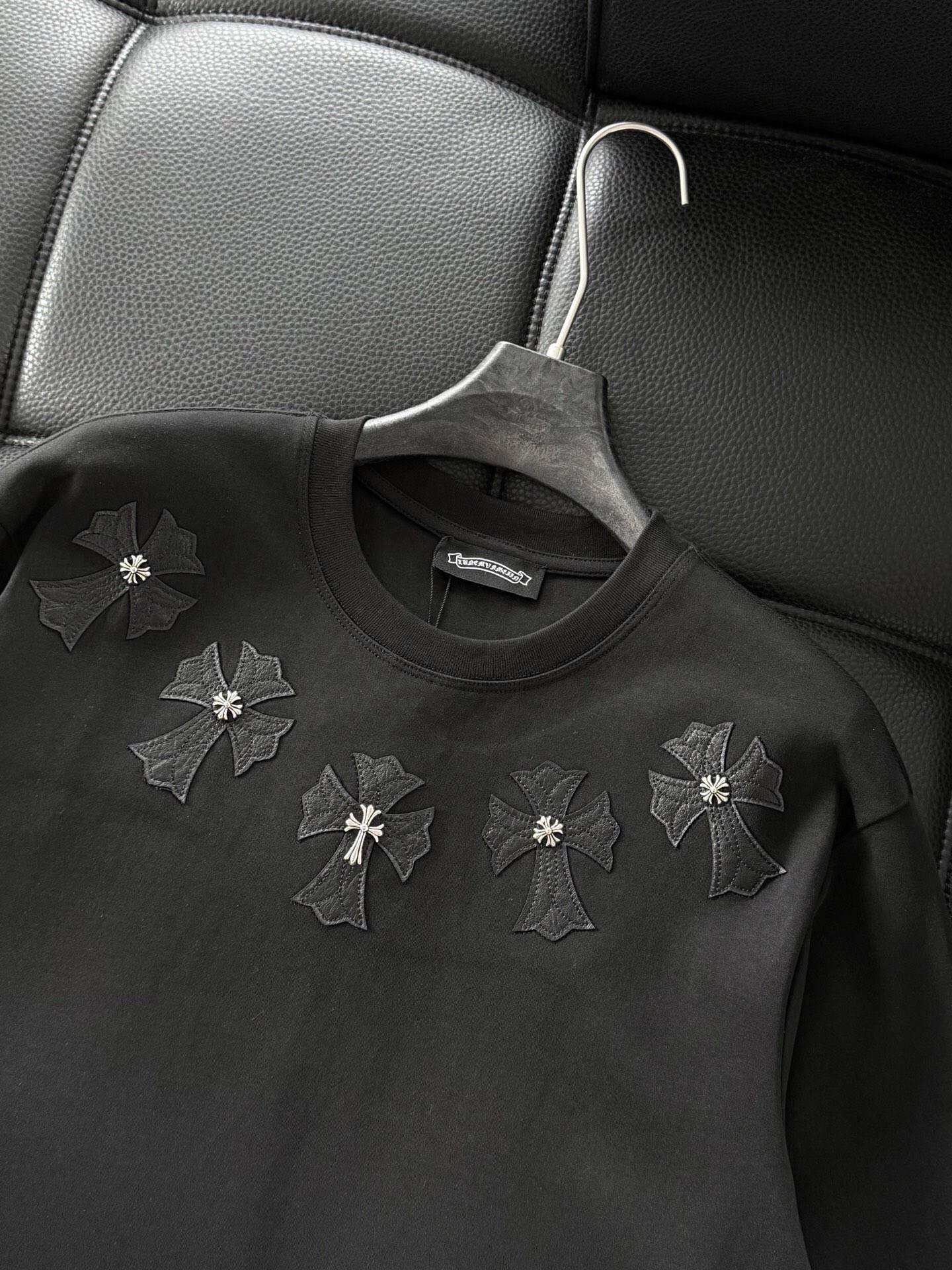 这款衣服是AAAAA 1:1 质量 (非常棒). 使用了和原版一模一样的材料. 商标部分也保持了和克罗心/Chrome Hearts一样. 图片拍摄是实物衣服拍摄, 您所收到的实物保证和我们图片一模一样.